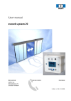 User manual record system 20 Manufacturer agtatec ag Allmendstrasse 24 CH-8320 Fehraltorf Service hotline Distributor Article no. 020.110.469A Table of contents Table of contents 1. General remarks ...................................................................................................3 1.1. 1.2. Target groups ................................................................................................................... 3 Door care.......................................................................................................................... 3 1.3. Maintenance..................................................................................................................... 3 2. Safety instructions ...............................................................................................4 2.1. 2.2. Use for the intended purpose............................................................................................ 4 General safety and accident prevention regulations.......................................................... 4 2.3. Control of safety devices .................................................................................................. 4 3. Operating instructions .........................................................................................5 3.1. 3.2. Selection of operating modes ........................................................................................... 5 Selection of special functions............................................................................................ 6 3.3. 3.4. Locking the control unit over keyboard.............................................................................. 7 Locking the control unit with key a switch (option) ............................................................ 7 4. Manual opening and closing in case of failure ..................................................8 4.1. Manual opening (without manual unlocking device) .......................................................... 8 4.2. Manual closing.................................................................................................................. 9 5. Operating the door in emergency .....................................................................11 5.1. 5.2. Emergency opening with current supply ......................................................................... 11 Emergency opening in case of power failure with auxiliary battery.................................. 11 5.3. Emergency operating using bowden cable (option) ........................................................ 11 6. Behaviour in event of faults ..............................................................................13 6.1. 6.2. Display on the control unit............................................................................................... 13 Possible troubleshooting................................................................................................. 13 6.3. Resetting the control module .......................................................................................... 13 6.4. Control unit BDE-D does not react.................................................................................. 14 7. Functions and safety check ..............................................................................15 7.1. General remarks............................................................................................................. 15 7.2. Technical data and operating conditions......................................................................... 15 7.3. Monthly check-up list ...................................................................................................... 16 Page 2 / 16 General remarks 1. General remarks 1.1. Target groups 1 This user’s guide is meant for the following users: • • Operators of the automatic sliding door record system 20: the persons in charge of the technical maintenance of this door installation End-users of the door installation: the persons who use the door functions daily and have been appropriately trained This manual explains how to operate the sliding door record system 20. It is the basis for optimal functioning and gives instructions for troubleshooting. Excerpts of this document can also be given to the persons responsible for the daily operating of the door. The operator should read this user’s guide before commissioning the door and observe the safety instructions! Please keep this document in a safe, convenient place beside the sliding door. 1.2. Door care The entire door installation – including sensors and safety devices – can be cleaned with a damp cloth and commercially available cleaning agents (do not use abrasive cleaning agents or any solvent). First test the product selected on a non-visible spot. The floor tracks should be kept free from dirt. NOTE To perform this work it is recommended that the operating mode (locked) or (continuously open) be selected, in order to avoid possible injury due to uncontrolled door movements. 1.3. Maintenance It is recommended that a technical safety test and a service be carried out by one of our record service technicians or by an authorised partner, before first commissioning and as required – but at least once a year. A display on the BDE-D control unit will show when maintenance is due. These display messages occur at various intervals which are defined by the number of opening cycles or after a certain operating time. Regular testing and servicing by our fully trained staff – or by staff approved by record – offers the best guarantee for durability and trouble-free, reliable operation. We recommend that a service agreement be arranged with the record service centre in charge of your region. Seite 3 / 16 Safety instructions 2. 2 Safety instructions The record system 20 sliding door has been developed with state of the art technology and recognised technical safety regulatio