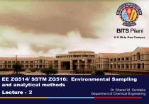 BITS Pilani K K Birla Goa Campus EE ZG514/ SSTM ZG516: Environmental Sampling and analytical methods Lecture - 2 Dr. Sharad M. Sontakke Department of Chemical Engineering Summary of Lecture 1 Module 1 (part 1): Structure and function of pollutants, and analysis • Need of environmental sampling and analysis • Qualitative and quantitative analysis • Structural formula • Functional group • Concentration unit • Organic and inorganic pollutants BITS Pilani, K K Birla Goa Campus Contents Module 1 (part 2): Structure and function of pollutants, and analysis • Source of pollutants • Common analytical methods BITS Pilani, K K Birla Goa Campus Organic pollutants These includes organic compounds such as: • Phenols, • Organic dyes, • Polyaromatic hydrocarbons, • Polychlorinated biphenyls, • Pesticides, • Pharmaceuticals, • Polymers, etc. BITS Pilani, K K Birla Goa Campus Inorganic pollutants These include: • Heavy metals and trace elements such cadmium (Cd), chromium (Cr), arsenic (As), lead (Pb), mercury (Hg), Fluoride (F), etc., • Oxides of metal, • Inorganic ions: Chloride (Cl‒), Sulfate (SO42‒), (NO3‒), Phosphate (PO32‒), etc. • Metal salts, etc. BITS Pilani, K K Birla Goa Campus Sources Organic Dyes Textile Tanning Paper Chemical Phenols Textile Petroleum Metallurgy Chemical Detergents Dairy Food processing Laundry Organo-pesticides Agriculture Food processing Acids Textile Metallurgy Chemical Alkali Textile Metallurgy Chemical Metals Textile Metallurgy Agriculture Metallic salts Tanning Paper Metallurgy Cyanides Metallurgy Inorganic Laundry Agriculture BITS Pilani, K K Birla Goa Campus Sources of some inorganic pollutants: BITS Pilani, K K Birla Goa Campus Source of Air pollutants: Natural or anthropogenic • Natural: wind-blown, pollen, sea salt, volcanic ash and gases , etc. • Anthropogenic: combustion of fossil fuels, water vapor, trace metal oxides, incineration, coal and iron ores • Industrial sources: cement, glass, ceramic, refractories, power plant, refineries, pulp and paper, food processing BITS Pilani, K K Birla Goa Campus Particulate matter In general, particulate matter (PM) refers to all atmospheric substances that are not gases. They include suspended droplets, solid particles or mixture of these. The PM can include inert to very reactive materials ranging in size from 100 μm down to 0.1 μm or less. The inert material do not react with the environment whereas, the reactive materials may react chemically. BITS Pilani, K K Birla Goa Campus Classification: Dust: It contains particles of the size ranging from 1-200 μm. These are released due to natural disintegration of rocks and soil or by mechanical processes of grinding spraying. Fine dust particles acts as a catalyst for many chemical reactions in the atmosphere. Smoke: These contains fine liquid or solid particles (ranging between 0.01-1 μm) released as a result of combustion or other chemical process. It may have different colors based on the material burnt. BITS Pilani, K K Birla Goa Campus Fumes: These contains fine solid particles (ranging between 0.1-1 μm) released from chemical or metallurgical processes. Mist: Made up of liquid droplets generally smaller than 10 μm. These are formed by condensation or released from industrial operations. Fog: Mist in which liquid is water and sufficiently dense to blur vision. Aerosol: Includes air-borne suspension (solid or liquid) BITS Pilani, K K Birla Goa Campus Sources of particulate matter Fossil fuel combustion: Fossil fuels are an anthropogenic source of particulate matter (PM). Coal, oil, natural gas, gasoline, and diesel fuel all produce some PM. Combustion of gasoline in an automobile engine emits particles of organic material (soot), Si, Fe, Zn, and S. Diesel-powered trucks emit 10 to 100 times more particulate material than do gasoline-powered vehicles; most of this PM takes the form of organic material from unburned fuel. BITS Pilani, K K Birla Goa Campus The combustion of coal releases soot, sulfate, and fly ash. Coal is a solid fossil fuel that was formed millions of years ago by compaction of partially decomposed plant material. The classes of coal are distinguished by their percentage of carbon, which is directly related to their heating value. Seams of coal also form with other natural minerals such as iron pyrite (FeS). BITS Pilani, K K Birla Goa Campus Some fraction of the minerals produces particles of fly ash, so named because smaller particles of ash that are produced enter the furnace flue and “fly up” the smokestack. The size (diameter) of the fly ash largely determines whether it will be removed from the stack gases by electrostatic precipitators or bag houses; these systems easily remove larger-diameter particles. Coal-fired boilers produce approximately 1% to 2% fly ash, with a diameter of 0.1 µm. BITS Pilani, K K Birla Goa Campus Even though this small-diameter fraction represents only 1% to 2% of the coal-combustion emissions by weight, it accounts for the largest number of particles and most of the surface area. Fly ash from coal-fired boilers has been shown to contain Fe, Zn, Pb, V, Mn, Cr, Cu, Ni, As, Co, Cd, Sb, and Hg. This smaller fly ash is an inhalation risk; smaller particles are less likely to be trapped in the nose or larynx and are more likely to be inhaled into the deep recesses of the lung. BITS Pilani, K K Birla Goa Campus Industrial Sources Some industrial processes involve burning metals in conjunction with fossil fuels. Waste incineration and kiln drying of cement are two examples of industrial processes in which metals are emitted. The PM resulting from this kind of industrial process usually contains Fe2O3, Fe3O4, Al2O3, SiO2, and metal carbonates. In such processes, heavy metals vaporize at high temperature and then recondense onto particles that are formed simultaneously. BITS Pilani, K K Birla Goa Campus Miscellaneous Sources Rubber particles from tires, pollen, viruses, an