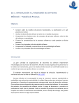 EJE 1: INTRODUCCIÓN A LA INGENIERÍA DE SOFTWARE MÓDULO 2 – Modelo de Procesos Objetivos _________________________________________________________________________ • • • • • • • Conocer sobre los modelos de proceso tradicionales, su clasificación y en qué proyectos se utiliza Analizar el desarrollo de software a través de un modelo de proceso Comprender las relaciones entre los conceptos de proceso software, ciclo de vida del software y metodología. Conocer las características de los procesos software y cuales pueden ser dichos procesos. Conocer los principales ciclos de vida del software. Comprender la finalidad y características de una metodología software. Conocer los principales tipos de metodologías software Introducción _________________________________________________________________________ La gran cantidad de organizaciones de desarrollo de software implementan metodologías para el proceso de desarrollo. Muchas de estas organizaciones pertenecen a la industria armamentística, que en los Estados Unidos necesita un certificado basado en su modelo de procesos para poder obtener un contrato. El estándar internacional que regula el método de selección, implementación y monitoreo del ciclo de vida del software es ISO 12207. Durante décadas se ha perseguido la meta de encontrar procesos reproducibles y predecibles que mejoren la productividad y la calidad. Algunas de estas soluciones intentan sistematizar o formalizar la aparentemente desorganizada tarea de desarrollar software. Otros aplican técnicas de gestión de proyectos para la creación del software. Sin una gestión del proyecto, los proyectos de software corren el riesgo de demorarse o consumir un presupuesto mayor que el planeado. Dada la cantidad de proyectos de software que no cumplen sus metas en términos de funcionalidad, costes o tiempo de entrega, una gestión de proyectos efectiva es algo imprescindible. Algunas organizaciones crean un grupo propio (Software Engineering Process Group, abreviado SEPG) encargado de mejorar los procesos para el desarrollo de software en la organización Actividades Fundamentales para la Ingeniería de Software _________________________________________________________________________ Un proceso de software es una serie de actividades relacionadas que conduce a la elaboración de un producto de software. Estas actividades pueden incluir el desarrollo de software desde cero en un lenguaje de programación estándar como Java o C. Sin embargo, las aplicaciones de negocios no se desarrollan precisamente de esta forma. El nuevo software empresarial con frecuencia ahora se desarrolla extendiendo y modificando los sistemas existentes, o configurando e integrando el software comercial o componentes del sistema. Existen muchos diferentes procesos de software, pero todos deben incluir cuatro actividades que son fundamentales para la ingeniería de software: 1. Especificación del software Tienen que definirse tanto la funcionalidad del software como las restricciones de su operación. 2. Diseño e implementación del software Debe desarrollarse el software para cumplir con las especificaciones. 3. Validación del software Hay que validar el software para asegurarse de que cumple lo que el cliente quiere. 4. Evolución del software El software tiene que evolucionar para satisfacer las necesidades cambiantes del cliente. En cierta forma, tales actividades forman parte de todos los procesos de software. Por supuesto, en la práctica éstas son actividades complejas en sí mismas e incluyen subactividades tales como la validación de requerimientos, el diseño arquitectónico, la prueba de unidad, etcétera. También existen actividades de soporte al proceso, como la documentación y el manejo de la configuración del software. Cuando los procesos se discuten y describen, por lo general se habla de actividades como especificar un modelo de datos, diseñar una interfaz de usuario, etcétera, así como del orden de dichas actividades. Sin embargo, al igual que las actividades, también las descripciones de los procesos deben incluir: 1. Productos, que son los resultados de una actividad del proceso. Por ejemplo, el resultado de la actividad del diseño arquitectónico es un modelo de la arquitectura de software. 2. Roles, que reflejan las responsabilidades de la gente que interviene en el proceso. Ejemplos de roles: gerente de proyecto, gerente de configuración, programador, etcétera. 3. Precondiciones y pos condiciones, que son declaraciones válidas antes y después de que se realice una actividad del proceso o se cree un producto. Por ejemplo, antes de comenzar el diseño arquitectónico, una precondición es que el cliente haya aprobado todos los requerimientos; después de terminar esta actividad, una pos condición podría ser que se revisen aquellos modelos UML que describen la arquitectura. Modelos de Procesos _________________________________________________________________________ Un modelo de proceso de software es una representación simplificada de este proceso. Cada modelo del proceso representa a otro desde una particular perspectiva y, por lo tanto, ofrece sólo información parcial acerca de dicho proceso. Por ejemplo, un modelo de actividad del proceso muestra las actividades y su secuencia, pero quizá sin presentar los roles de las personas que intervienen en esas actividades. En esta sección se introducen algunos modelos de proceso muy generales (en ocasiones llamados “paradigmas de proceso”) y se muestran desde una perspectiva arquitectónica. En otras palabras, se ve el marco (framework) del proceso, pero no los detalles de las actividades específicas. Tales modelos genéricos no son descripciones definitivas de los procesos de software. Más bien, son abstracciones del proceso que se utilizan para explicar los diferentes enfoques del desarrollo de software. Se pueden considerar marcos del proceso que se extienden y se adaptan para crear pr