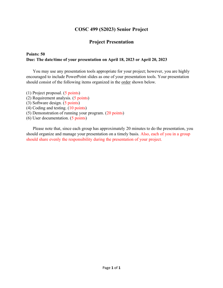 COSC 499 (S2023) Senior Project Project Presentation Points: 50 Due: The date/time of your presentation on April 18, 2023 or April 20, 2023 You may use any presentation tools appropriate for your project; however, you are highly encouraged to include PowerPoint slides as one of your presentation tools. Your presentation should consist of the following items organized in the order shown below. (1) Project proposal. (5 points) (2) Requirement analysis. (5 points) (3) Software design. (5 points) (4) Coding and testing. (10 points) (5) Demonstration of running your program. (20 points) (6) User documentation. (5 points) Please note that, since each group has approximately 20 minutes to do the presentation, you should organize and manage your presentation on a timely basis. Also, each of you in a group should share evenly the responsibility during the presentation of your project. Page 1 of 1
