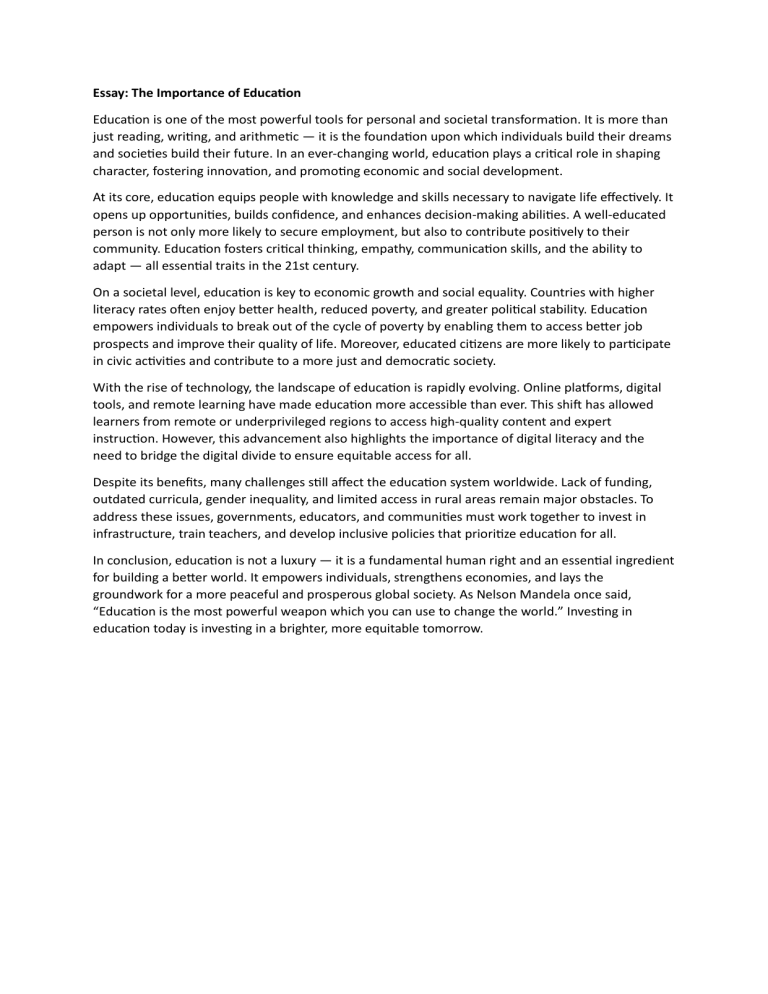 Essay: The Importance of Education Education is one of the most powerful tools for personal and societal transformation. It is more than just reading, writing, and arithmetic — it is the foundation upon which individuals build their dreams and societies build their future. In an ever-changing world, education plays a critical role in shaping character, fostering innovation, and promoting economic and social development. At its core, education equips people with knowledge and skills necessary to navigate life effectively. It opens up opportunities, builds confidence, and enhances decision-making abilities. A well-educated person is not only more likely to secure employment, but also to contribute positively to their community. Education fosters critical thinking, empathy, communication skills, and the ability to adapt — all essential traits in the 21st century. On a societal level, education is key to economic growth and social equality. Countries with higher literacy rates often enjoy better health, reduced poverty, and greater political stability. Education empowers individuals to break out of the cycle of poverty by enabling them to access better job prospects and improve their quality of life. Moreover, educated citizens are more likely to participate in civic activities and contribute to a more just and democratic society. With the rise of technology, the landscape of education is rapidly evolving. Online platforms, digital tools, and remote learning have made education more accessible than ever. This shift has allowed learners from remote or underprivileged regions to access high-quality content and expert instruction. However, this advancement also highlights the importance of digital literacy and the need to bridge the digital divide to ensure equitable access for all. Despite its benefits, many challenges still affect the education system worldwide. Lack of funding, outdated curricula, gender inequality, and limited access in rural areas remain major obstacles. To address these issues, governments, educators, and communities must work together to invest in infrastructure, train teachers, and develop inclusive policies that prioritize education for all. In conclusion, education is not a luxury — it is a fundamental human right and an essential ingredient for building a better world. It empowers individuals, strengthens economies, and lays the groundwork for a more peaceful and prosperous global society. As Nelson Mandela once said, “Education is the most powerful weapon which you can use to change the world.” Investing in education today is investing in a brighter, more equitable tomorrow.