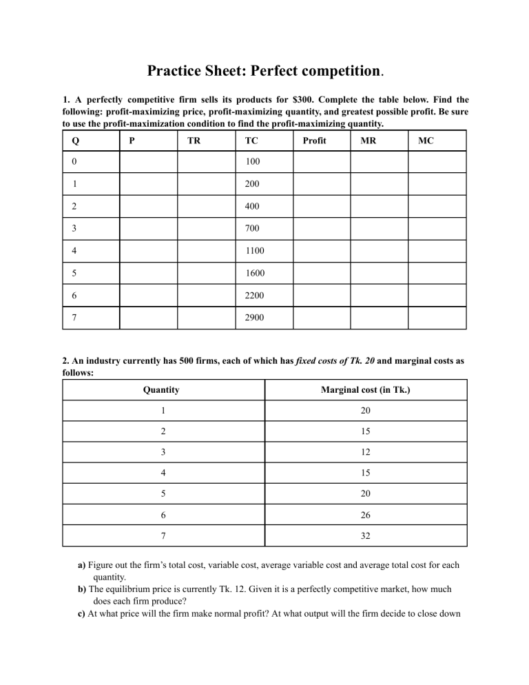Practice Sheet: Perfect competition. 1. A perfectly competitive firm sells its products for $300. Complete the table below. Find the following: profit-maximizing price, profit-maximizing quantity, and greatest possible profit. Be sure to use the profit-maximization condition to find the profit-maximizing quantity. Q P TR TC 0 100 1 200 2 400 3 700 4 1100 5 1600 6 2200 7 2900 Profit MR MC 2. An industry currently has 500 firms, each of which has fixed costs of Tk. 20 and marginal costs as follows: Quantity Marginal cost (in Tk.) 1 20 2 15 3 12 4 15 5 20 6 26 7 32 a) Figure out the firm’s total cost, variable cost, average variable cost and average total cost for each quantity. b) The equilibrium price is currently Tk. 12. Given it is a perfectly competitive market, how much does each firm produce? c) At what price will the firm make normal profit? At what output will the firm decide to close down their market? Show the answer in a diagram. 3. In a perfectly competitive market for pens, there are 100 identical producers. The market price for pens is Tk.20 and all producers of pens must take this price. Each producer has the following cost functions: TC = 60 + 5Q + Q2 ; MC = 5 + 2Q Using this information, answer the following questions. a) Find the profit maximizing level of output. b) Calculate the level of profit in the short-run and illustrate accordingly. c) Based on your answers of part (b) would the producer decide to shut down production in the short run? d) Explain the long-run adjustments that would occur in this market if the producers are constantly making losses at the current equilibrium price. 4. A perfectly competitive firm has the following cost functions: TC = 100 + 15Q + 0.5Q² MC: 15+ Q Market price P = 25 a) Calculate the profit-maximizing output (Q). b) Determine whether the firm should produce or shut down in the short run. c) Calculate the firm’s short-run profit or loss.