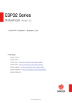 ESP32 Series Datasheet Version 5.1 2.4 GHz Wi-Fi + Bluetooth® + Bluetooth LE SoC Including: ESP32-D0WD-V3 ESP32-U4WDH ESP32-S0WD – Not Recommended for New Designs (NRND) ESP32-D0WD – Not Recommended for New Designs (NRND) ESP32-D0WDQ6 – Not Recommended for New Designs (NRND) ESP32-D0WDQ6-V3 – Not Recommended for New Designs (NRND) ESP32-D0WDR2-V3 www.espressif.com Product Overview ESP32 is a single 2.4 GHz Wi-Fi-and-Bluetooth combo chip designed with the TSMC low-power 40 nm technology. It is designed to achieve the best power and RF performance, showing robustness, versatility and reliability in a wide variety of applications and power scenarios. The ESP32 series of chips includes ESP32-D0WD-V3, ESP32-D0WDR2-V3, ESP32-U4WDH, ESP32-S0WD (NRND), ESP32-D0WDQ6-V3 (NRND), ESP32-D0WD (NRND), and ESP32-D0WDQ6 (NRND), among which, • ESP32-S0WD (NRND), ESP32-D0WD (NRND), and ESP32-D0WDQ6 (NRND) are based on chip revision v1 or chip revision v1.1. • ESP32-D0WD-V3, ESP32-D0WDR2-V3, ESP32-U4WDH, and ESP32-D0WDQ6-V3 (NRND) are based on chip revision v3.0 or chip revision v3.1. For details on part numbers and ordering information, please refer to Section 1 ESP32 Series Comparison. For details on chip revisions, please refer to ESP32 Chip Revision v3.0 User Guide and ESP32 Series SoC Errata. The functional block diagram of the SoC is shown below. Bluetooth baseband Wi-Fi MAC Wi-Fi baseband RF receive Clock generator I2C I2S SDIO UART TWAI® ETH RF transmit Cryptographic hardware acceleration Core and memory 2 (or 1) x Xtensa® 32-bit LX6 Microprocessors RMT PWM ROM SRAM Touch sensor SHA RSA AES RNG RTC DAC ADC Balun SPI Bluetooth link controller Switch In-Package Flash or PSRAM ULP coprocessor PMU Timers Recovery memory ESP32 Functional Block Diagram Espressif Systems 2 Submit Documentation Feedback ESP32 Series Datasheet v5.1 Features Wi-Fi • 802.11b/g/n • 802.11n (2.4 GHz), up to 150 Mbps • WMM • TX/RX A-MPDU, RX A-MSDU • Immediate Block ACK • Defragmentation • Automatic Beacon monitoring (hardware TSF) • Four virtual Wi-Fi interfaces • Simultaneous support for Infrastructure Station, SoftAP, and Promiscuous modes Note that when ESP32 is in Station mode, performing a scan, the SoftAP channel will be changed. • Antenna diversity Bluetooth® • Compliant with Bluetooth v4.2 BR/EDR and Bluetooth LE specifications • Class-1, class-2 and class-3 transmitter without external power amplifier • Enhanced Power Control • +9 dBm transmitting power • NZIF receiver with –94 dBm Bluetooth LE sensitivity • Adaptive Frequency Hopping (AFH) • Standard HCI based on SDIO/SPI/UART • High-speed UART HCI, up to 4 Mbps • Bluetooth 4.2 BR/EDR and Bluetooth LE dual mode controller • Synchronous Connection-Oriented/Extended (SCO/eSCO) • CVSD and SBC for audio codec • Bluetooth Piconet and Scatternet • Multi-connections in Classic Bluetooth and Bluetooth LE • Simultaneous advertising and scanning CPU and Memory • Xtensa® single-/dual-core 32-bit LX6 microprocessor(s) • CoreMark® score: – 1 core at 240 MHz: 539.98 CoreMark; 2.25 CoreMark/MHz Espressif Systems 3 Submit Documentation Feedback ESP32 Series Datasheet v5.1 – 2 cores at 240 MHz: 1079.96 CoreMark; 4.50 CoreMark/MHz • 448 KB ROM • 520 KB SRAM • 16 KB SRAM in RTC • QSPI supports multiple flash/SRAM chips Clocks and Timers • Internal 8 MHz oscillator with calibration • Internal RC oscillator with calibration • External 2 MHz ~ 60 MHz crystal oscillator (40 MHz only for Wi-Fi/Bluetooth functionality) • External 32 kHz crystal oscillator for RTC with calibration • Two timer groups, including 2 × 64-bit timers and 1 × main watchdog in each group • One RTC timer • RTC watchdog Advanced Peripheral Interfaces • 34 programmable GPIOs – Five strapping GPIOs – Six input-only GPIOs – Six GPIOs needed for in-package flash (ESP32-U4WDH) and in-package PSRAM (ESP32-D0WDR2-V3) • 12-bit SAR ADC up to 18 channels • Two 8-bit DAC • 10 touch sensors • Four SPI interfaces • Two I2S interfaces • Two I2C interfaces • Three UART interfaces • One host (SD/eMMC/SDIO) • One slave (SDIO/SPI) • Pulse count controller • Ethernet MAC interface with dedicated DMA and IEEE 1588 support • TWAI® , compatible with ISO 11898-1 (CAN Specification 2.0) • RMT (TX/RX) Espressif Systems 4 Submit Documentation Feedback ESP32 Series Datasheet v5.1 • Motor PWM • LED PWM up to 16 channels Power Management • Fine-resolution power control through a selection of clock frequency, duty cycle, Wi-Fi operating modes, and individual power control of internal components • Five power modes designed for typical scenarios: Active, Modem-sleep, Light-sleep, Deep-sleep, Hibernation • Power consumption in Deep-sleep mode is 10 µA • Ultra-Low-Power (ULP) coprocessors • RTC memory remains powered on in Deep-sleep mode Security • Secure boot • Flash encryption • 1024-bit OTP, up to 768-bit for customers • Cryptographic hardware acceleration: – AES – Hash (SHA-2) – RSA – Random Number Generator (RNG) Applications With low power consumption, ESP32 is an ideal choice for IoT devices in the following areas: • Smart Home • Audio Devices • Industrial Automation • Generic Low-power IoT Sensor Hubs • Health Care • Generic Low-power IoT Data Loggers • Consumer Electronics • Cameras for Video Streaming • Smart Agriculture • Speech Recognition • POS Machines • Image Recognition • Service Robot • SDIO Wi-Fi + Bluetooth Networking Card Espressif Systems 5 Submit Documentation Feedback ESP32 Series Datasheet v5.1 Contents Note: Check the link or the QR code to make sure that you use the latest version of this document: https://www.espressif.com/documentation/esp32_datasheet_en.pdf Contents Product Overview 2 Features 3 Applications 5 1 ESP32 Series Comparison 11 1.1 Nomenclature 11 1.2 Comparison 11 2 Pins 12 2.1 Pin Layout 12 2.2 Pin Overview 14 2.3 IO Pins
