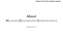 Design of interactive software systems About H(uman)C(omputer)I(nteraction) Lecture 1 The Human • Information i/o … – visual, auditory, haptic, movement • Information stored in memory – sensory, short-term, long-term • Information processed and applied – reasoning, problem solving, skill, error • Emotion influences human capabilities • Each person is different Vision Two stages in vision • physical reception of stimulus • processing and interpretation of stimulus The Eye - physical reception • mechanism for receiving light and transforming it into electrical energy • light reflects from objects • images are focused upside-down on retina • retina contains rods for low light vision and cones for colour vision • ganglion cells (brain!) detect pattern and movement Vision Vision Vision Optical Illusions the Ponzo illusion the Muller Lyer illusion Optical Illusions Optical Illusions Optical Illusions Colors • Major impact in UI design • Beyond pure aesthetics, color has associated meanings (Cultural differences) and elicits emotional responses. • To prevent confusion in meaning, color must be used consistently • An UI must be designed without colors in the beginning • Magic number: 5+2 colors in an interface • For different concepts – use different colors Accessibility The primary colors as seen with normal color vision. The primary colors as seen with Protanopia (1% of male population). The primary colors as seen with Deuteranopia (6% of male population). The primary colors as seen with Tritanopia (1% of male population). “Designing with blue” • There are special usability issues to be considered in using blue and yellow in graphics. • Legibility, temporal response, spatial localization and perception of geometrical shapes are all somewhat compromised in patterns in which the only differences are in the short-wave-sensitive (SWS, "blue") photoreceptors. • In graphics terms this mostly applies to color pairs that differ only in the blue primary. • recommendation: “Pure blue should not be used for fine detail or background “ Legibility • Difficult to read in any font size • Text differ from their backgrounds only in the blue primary: Solutions Blue can be used in most contexts if care is taken to achieve adequate luminance contrast. T Reading • Several stages: – visual pattern perceived – decoded using internal representation of language – interpreted using knowledge of syntax, semantics, pragmatics • • • • Reading involves saccades and fixations Perception occurs during fixations Word shape is important to recognition Negative contrast improves reading from computer screen Reading Can you read this? • I cnduo't bvleiee taht I culod aulaclty uesdtannrd waht I was rdnaieg. Unisg the icndeblire pweor of the hmuan mnid, aocdcrnig to rseecrah at Cmabrigde Uinervtisy, it dseno't mttaer in waht oderr the lterets in a wrod are, the olny irpoamtnt tihng is taht the frsit and lsat ltteer be in the rhgit pclae. The rset can be a taotl mses and you can sitll raed it whoutit a pboerlm. Tihs is bucseae the huamn mnid deos not raed ervey ltteer by istlef, but the wrod as a wlohe. Aaznmig, huh? Correct paragraph • I couldn't believe that I could actually understand what I was reading. Using the incredible power of the human brain, according to research at Cambridge University, it doesn't matter in what order the letters in a word are, the only important thing is that the first and last letter be in the right place. The rest can be a total, mess and you can read it without a problem. This is because the human mind does not read every letter by itself, but the word as a whole. Amazing, huh? Hearing • Provides information about environment: distances, directions, objects etc. • Physical apparatus: – outer ear – middle ear – protects inner and amplifies sound – transmits sound waves as – inner ear vibrations to inner ear – chemical transmitters are released and cause impulses in auditory nerve • Sound – pitch – loudness – timbre – sound frequency – amplitude – type or quality Hearing • Humans can hear frequencies from 20Hz to 15kHz – less accurate distinguishing high frequencies than low. • Auditory system filters sounds – can attend to sounds over background noise. – for example, the cocktail party phenomenon - when one may immediately detect words of importance originating from unattended stimuli, for instance hearing one's name in another conversation Touch • Provides important feedback about environment. • May be key sense for someone who is visually impaired. • Stimulus received via receptors in the skin: – thermoreceptors – nociceptors – mechanoreceptors – heat and cold – pain – pressure (some instant, some continuous) • Some areas more sensitive than others e.g. fingers. • Kinethesis - awareness of body position – affects comfort and performance. Movement • Time taken to respond to stimulus: reaction time + movement time • Movement time dependent on age, fitness etc. • Reaction time - dependent on stimulus type: – visual – auditory – pain ~ 200ms ~ 150 ms ~ 700ms • Increasing reaction time decreases accuracy in the unskilled operator but not in the skilled operator. Movement • Fitts' Law describes the time taken to hit a screen target: Mt = a + b log2(D/S + 1) where: a and b are empirically determined constants Mt is movement time D is Distance S is Size of target targets as large as possible distances as small as possible Memory There are three types of memory function: Sensory memories Short-term memory or working memory Long-term memory Selection of stimuli governed by level of arousal. sensory memory • Buffers for stimuli received through senses – iconic memory: visual stimuli – echoic memory: aural stimuli – haptic memory: tactile stimuli • Examples – “sparkler” trail – stereo sound • Continuously overwritten Short-ter