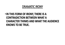 • IN VERBAL IRONY, A CHARACTER SAYS ONE