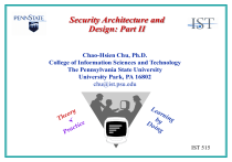 Security Architecture and Design: Part II Chao-Hsien Chu, Ph.D. College of Information Sciences and Technology The Pennsylvania State University University Park, PA 16802 chu@ist.psu.edu IST 515 The Transformation Process The security policy provides the abstract goals and the security model provides the do’s and don’ts necessary to fulfill the goals Security Policy • Abstract objectives, goals and requirements • Rules or practice • Framework Security Model • Mathematical relationship and formulas • Specifications • Data structure Programming • Computer code • GUI – check box • Product or • System Security Policy • Outlines the security requirements for an organization. • Is an abstract term that represents the objectives and goals a system must meet and accomplish to be deemed secure and acceptable. • Is a set of rules and practices that dictates how sensitive information and resources are managed, protected, and distributed. • Expresses what the security level should be by setting the goals of what the security mechanisms are supposed to accomplish. • Provides the framework for the systems’ security architecture. Security Model • Is a symbolic representation of a policy, which – Outlines the requirements needed to support the security policy and how authorization is enforced. – Maps the abstract goals of the policy to information system terms by specifying explicit data structures and techniques that are necessary to enforce the security policy. – Maps the desires of the policymakers into a set of rules that computer system must follow. • Is usually represented in mathematics and analytical ideas, which are then mapped to system specifications, and then developed by programmers through programming codes. Security Policy “Subjects need to be authorized to access objects.” Example Security Model • Derive the mathematical relationships and formulas explaining how x can access y only through outlined specific methods. • Develop specifications to provide a bridge to what this means in a computing environment and how it maps to components and mechanisms that need to be coded and developed. • Write the program code to produce the mechanisms that provide a way for a system to use access control lists and give administrators some degree of control. This mechanism presents the network administrator with a GUI representation, like check boxes, to choose which subjects can access what objects, within the operating system. Security Models Security Requirements Security Models • Bell-LaPadula Model (1973) • Biba Model (1977) • Confidentiality • Clark-Wilson Model (1987) • Integrity • Access Control Matrix • Availability • Information Flow Model • Noninterference Model • Chinese Wall Model • Lattice Model Bell-LaPadula Model • Funded by the U.S. government, Bell-LaPadula model is the first mathematical model of a multilevel security policy. Because users with different clearances use the system, and the system processes data with different classifications. • Is a state machine model that enforce the confidentiality aspects of access control, but not with integrity or availability • Is an information flow security model as it ensures information does not flow in an insecure manner. • All mandatory access control (MAC) model are based on the Bell-LaPadula model. Bell-LaPadula Model Properties • The Simple Security Property (ss Property) states that a subject at a given security level cannot read data that resides at a higher security level (No Read Up). • The * (star) Security Property states that a subject in a given security level cannot write information to a lower security level. (No Write Down). • The Strong Star Property states that a subject that has read and write capabilities can only perform those functions at the same security level, nothing higher and nothing lower. A subject to be able to read and write to an object, the clearance and classification must be equal. The Bell-LaPadula Model Layer of Higher Secrecy Χ Reading Secrets Read Layer of Lower Secrecy Χ Write Χ Simple Security Property Divulging Secrets Star (*) Property Reading Secrets Read/Write Χ Divulging Secrets Strong Star (*) Property Biba Security Model • Developed in 1977, the Biba integrity model mathematically describes read and write restrictions based on integrity access classes of subjects and objects. It is the first model to address integrity. • Is an information flow model as it is concerned about data flowing from one level to another. • The model looks similar to the Bell-LaPadula Model; however, the read-write conditions are reversed. Biba Integrity Model Axiom • The Simple Integrity Axiom: States that a subject at one level of integrity is not permitted to observe (read) an object of a lower integrity. No Read Down. • The * (Star) Integrity Axiom: States that an object at one level of integrity is not permitted to modify (write to) an object of a higher level of integrity. No Write Up. • Invocation property states that a subject at one level of integrity cannot invoke (call up) a subject at a higher level of integrity. The Biba Model Layer of Higher Secrecy Χ Read Layer of Lower Secrecy Χ Contamination Write Get Contaminated Simple Integrity Property Integrity Star (*) Property The Invocation Property • The Biba model can be extended to include an access operation called invoke. A subject can invoke another subject, such as a software utility, to access an object. • The subject cannot send message (logical request for service) to subjects of higher integrity. Subjects are only allowed to invoke utilities or tools at the same or lower integrity level (otherwise, a dirty subject could use a clean tool to access or contaminate a clean object). Clark-Wilson Integrity Model The model uses the following elements: • Users: Active agents. • Transformation Procedures (TPs): Programed abstract operations, 
