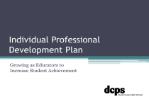 Individual Professional Development Plan Growing as Educators to Increase Student Achievement What is your IPDP? An Individual Professional Development Plan (IPDP) is your plan for how you will grow as a professional during the school year. The IPDP should reflect your professional learning needs related to improving student achievement and enhancing your craft as an educator. DCPS IPDPs FLDOE guidelines require that instructional personnel use the district-approved IPDP template. MINT Participants and school counselors have specific IPDP templates. The IPDP template may not be altered with the exception of inserting rows for additional professional learning objectives as needed. Getting Started Before writing your IPDP consider the following: current classroom-level disaggregated student achievement data your IPDP from last year your evaluation from last year the School Improvement Plan (SIP) school initiatives such as professional learning community (PLC) work Completing the IPDP The Six IPDP Sections Student Achievement Data Student Achievement SMART Goal Educator Professional Learning Goals Professional Learning Objectives Changes in Educator’s Practices Results Student Achievement Data STUDENT ACHIEVEMENT DATA Review classroom-level disaggregated student achievement data for students currently assigned to you. Select your identified student group based on the following: your data analysis, School Improvement Plan, school initiatives, team goals, and the results from your previous year’s IPDP. Both formative and summative data may be included. Behavioral data may also be included. Identified Student Group Within a Class/Section Assessment Type (right click to add rows as needed) Current Score Average Goal Mid-Year Final Score Score Average (as needed) Student Achievement Data Identified Student Group: Based on performance data which indicate improvement is needed, identify a group of students currently assigned to you that will be your focus. Consider groups identified by classroom data, the School Improvement Plan, school initiatives, team goals, and behavioral data related to content area skills. Select one group of students to identify for your IPDP identified student group. Student Achievement Data Examples of Identified Student Groups: Lowest 25% by Content Area Exceptional Student Education (ESE) English Language Learners (ELL) Students with Disabilities (SWD) FCAT/EOC Achievement Levels (example: Level 2 Math) PRS Success Zones in FAIR (example: Low Success, Red) Florida Alternate Assessment Levels Retained Students Subgroups by Ethnicity Gifted Students Students in RtI Tier II Gender Groups Overage Students Students with Attendance Issues Economically Disadvantaged Behavior Groups Student Achievement Data Assessment Type: Formative assessments, such as progress monitoring instruments, FAIR, unit tests, writing prompts, student portfolios or journals, exit slips, quizzes/tests using NGSS and CCSS question stems, or other teacher/district assessments are a few examples. You may also include summative data such as FCAT and EOC exams or behavioral data related to content area skills. Student Achievement Data Include numerical assessment data for the students in your identified group. What is your identified group’s current score average? Where do you anticipate your group will score by the end of the year? This becomes your data goal. During the year, you may want to update the mid-year scores for your identified group so you can revise your IPDP Professional Learning Objectives to meet your learning needs. Student Achievement Data STUDENT ACHIEVEMENT DATA Review classroom-level disaggregated student achievement data for students currently assigned to you. Select your identified student group based on the following: your data analysis, School Improvement Plan, school initiatives, team goals, and the results from your previous year’s IPDP. Both formative and summative data may be included. Behavioral data may also be included. Current Mid-Year Identified Student Group Within a Final Score Assessment Type Score Goal Score Class/Section Average Average (as needed) 2nd Grade CCSS District Math 30% 60% 36% 57% Assessment Tier II Behavior students in my 2nd Individual Teacher-Developed 4 out of 5 0 out of 5 grade homeroom (5 students) Student Behavior Charts students 3 out of 5 4 out of 5 are will be students students successful successful Only one identified student group is required Your IPDP may include formative and summative data Identify a challenging but attainable goal Calculate the current score average for the students in your identified group Calculate the final score average for the students in your identified group Student Achievement SMART Goal STUDENT ACHIEVEMENT SMART GOAL Your Student Achievement SMART Goal (Strategic and Specific, Measurable, Attainable, Results-based, Timebound) must be specific to the student group you have identified and indicate measurable improvements that are expected in student achievement as a result of your professional learning. At least ____% of my _________________ students will score at or above ____% on the _____________________ by ___________. Student Achievement SMART Goal A SMART Goal is… Strategic & Specific: The outcome or end result is clear. Measurable: Numerical evidence that will indicate if the goal has been achieved. Attainable: The goal may be a challenge, but it is possible with available resources. Results-oriented: An identified area. Time-bound: A date by which the goal will be achieved. Student Achievement SMART Goal Examples: At least 75% of my students in the “Lowest 25%” in 5th grade math will score at or above 60% on progress monitoring assessments by March. 80% of my 2nd grade ELL students will demonstrate a probability of reading success (PRS) score of 54% or above on AP3 of FAIR in the spring. Non-examples: A majority of my class will increase their FCAT score. Most of my 9th grade algebra students w