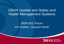 OSHA Update and Safety and Health Management Systems 2009 DOL Forum Jim Shelton, Houston North Topic Areas • OSHA Update and Emphasis Areas • Business Case • Elements of an Effective Safety Program • OSHA Compliance Assistance Overview • Finding Safety Resources OSHA Update • New Deputy Assistant Secretary and Acting Assistant Secretary Donald Shalhoub • Updated Field Operations Manual (CPL 02-00-148 replaces the Field Inspection Reference Manual (FIRM) • Advanced Notice of Proposed Rulemaking related to combustible dust OSHA Update • Stimulus Work – Looking for outreach possibilities for companies involved in stimulus work, green or renewable energy ect. • Industrial Hygiene – Look for increased OSHA outreach and enforcement related to industrial hygiene including increased air monitoring and sampling for potential over exposures Emphasis Industries • FY 09 Operational Plan Industries: – Highway, Street, and Bridge Construction – Landscaping/Horticultural Services – Oil and Gas Field Services – Residential Building Construction – Blast Furnaces and Basic Steel Products – Concrete and Concrete Products – Fruits and Vegetables Emphasis Hazards • FY 09 Operational Plan Hazards: – Combustible Dust – Electrical – Falls from Elevation – Noise (Non-Construction) – Silica – Struck-By – Trenching National Emphasis Programs • • • • • • • PSM Refineries (NEP) Silica (NEP) Amputations (NEP) Combustible Dust (NEP) Trenching (NEP) Falls (NEP) Portland Cement Regional Emphasis Programs • • • • • • • Construction (REP) Demolition (REP) Powerlines (REP) Work Zone (REP) Cranes in Construction (REP) Falls in General Industry (REP) Highway & Bridge Construction and Maintenance (REP) • High Noise Industries (REP) H1N1 Influenza • OSHA has a number of publications and resources addressing pandemic flu • Preparations and planning are important in the event this or another virus emerges Typist During 1918 Influenza H1N1 Influenza • The CDC recommends: – Employees should be alert for the symptoms of influenza. If you exhibit such symptoms as fever, cough, sore throat, body aches, headache, and chills, you should request leave from your supervisor, stay home, and limit contact with other people to prevent the spread of infection. Seek appropriate medical attention, and follow any instructions from your primary care provider H1N1 Influenza – Practice good hygiene. Wash your hands often with soap and water, especially after your cough or sneeze, after using the restroom, and before touching your eyes, mouth, or nose. Alcohol-based hand cleaners are also effective if soap and water are not readily available – Practice good respiratory etiquette. Sneeze or cough into a tissue; then carefully dispose of the tissue in a waste receptacle H1N1 Influenza – Avoid sneezing or coughing in the direction of other employees, and avoid sneezing into your bare hands – Employees who work in healthcare or laboratory settings may require additional precautions – Additional information can be found at http://www.cdc/swineflu/guidance/ H1N1 Influenza H1N1 Influenza H1N1 Influenza OSHA 3328-05 OSHA 3323-10N OSHA 3327-02N Business Case for Safety • According to Liberty Mutual Research Institute for Safety for every $1 invested in safety there is between $3 and $6 in savings • Accidents with or without injury may also result in property damage, equipment replacement costs, downtime, and unhappy customers • Workers compensation premiums and Experience Modification Rates (EMR) affect your bottom line. Lowering your EMR by buying down or paying smaller claims out of pocket still costs you money Business Case for Safety Mod Description Average Mod Current Mod Minimum Mod Controllable Mod Mod 1.00 0.71 0.38 0.33 Premium $200,000 $142,000 $ 76,000 $ 66,000 •If you’re at 0.71 and prevented all accidents you would save $66,000 in premiums • If your at 1.00 and your competitor is at 0.71 you are at a $58,000 per year disadvantage. If he’s at 0.38 you’re at a $124,000 disadvantage. Information Courtesy of Liberty Mutual, Houston, TX Business Case for Safety Direct Costs *Medical Costs *Indemnity Payments Indirect Costs *Lost time by: - Injured - Co-workers - Supervisor *Spoiled product *Loss of customers *Cleanup time *Production delays *Training new workers *Overhead costs *Legal fees *Rise in insurance costs Business Case for Safety Direct Cost of Injury Indirect Cost Multiplier 0 - $ 2,999 4.4 $ 3,000 – $ 4,999 1.6 $ 5,000 – $ 9,999 1.2 $10,000 + 1.1 Foreign body in the eye - Direct cost of $317* + indirect cost of $1394 = $1711 total cost. A 5% profit margin requires $34,236 in sales to cover The 2003 average cost of a WC injury claim in Texas was $3,078**…$98,000 in sales to cover * Argonaut Insurance Average Claims 1992-1994 ** TDI WC Research Group Medical Cost Trends in TX - 2004 Business Case for Safety • OSHA has found comprehensive safety and health programs reduce injury and illness rates an average of 20% • Accident costs go directly to the bottom line – Many companies won’t hire you if have an EMR over 1.00 or an injury rate above the national average and many review your OSHA citation history • Your safety performance affect the financial well being and competitiveness of your company and the lives of your work crews Characteristics of Exemplary Pgms • Uses organized and systematic methods to: – Assign responsibility to managers, supervisors, and employees – Inspect regularly for and control hazards – Orient and train all employees to eliminate or avoid hazards General Guidelines • An effective program – Includes provisions for systematic identification, evaluation and prevention or control of hazards – Goes beyond specific requirements of the law to address all hazards • Written program – “In writing” less important than effectiveness – As size and complexity of worksite or