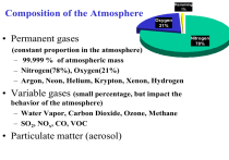 Remaining 1% Composition of the Atmosphere Oxygen 21% • Permanent gases (constant proportion in the atmosphere) – 99.999 % of atmospheric mass – Nitrogen(78%), Oxygen(21%) – Argon, Neon, Helium, Krypton, Xenon, Hydrogen • Variable gases (small percentage, but impact the behavior of the atmosphere) – Water Vapor, Carbon Dioxide, Ozone, Methane – SO2, NOx, CO, VOC • Particulate matter (aerosol) Nitrogen 78% Troposphere(對流層) • 對流層是大氣中最低的一層。 • 高度每增加100公尺,氣溫平均下降約0.65℃。 • 對流層的厚度大約9-16km,由赤道向兩極減少,在同 一緯度,對流層夏季較厚,冬季較薄。 • 雖然對流層的厚度不及整個大氣層厚度的1%,但是由 於地球引力的作用,這一層卻集中了大氣3/4的質量和 幾乎全部的水氣。 • 空氣通過對流和亂流運動,使近地面的熱量、水氣、 質量等易於向上輸送,在垂直向得以混合,也因此雲、 霧、雨、雪等主要大氣現象都出現在此層。 • 因為人類主要在此層活動,空氣污染物的排放、傳輸 和去除也大都發生在此層。 • 在對流層的上方,界於對流層和平流層間,有一厚度 為數百米到一兩公里的過度層,稱為對流層頂 (tropopause)。 Stratosphere(平流層) • 自對流層頂到50km左右為平流層。(比對流層厚) • 在平流層的下層隨著高度增加溫度保持不變或略有上升,大 約到30km以上溫度會隨著高度顯著的增加,在50km左右會達 到270K,平流層內此種溫度變化與臭氧吸收紫外線(UV)有密 切關係,雖然臭氧在30km以上逐漸減少,但這裡紫外線的輻 射較強,故溫度隨著高度增加而快速增加,造成顯著的暖 層, • 平流層內氣流較為穩定,空氣的垂直混合作用較為微弱。 • 平流層中間有一臭氧層(ozone layer),可以吸收有害的太陽 紫外線輻射,是地球生態的保護,然而由於長期的氟氯碳化 物(CFCs)累積,及其他由地面排放及高空飛行的飛機所排出 的污染物,造成所謂的臭氧層破壞的問題,是目前環境科學 家所關心的問題。 • 火山爆發所產生的微粒,會進入此層對太陽輻射產生影響, • 此層是許多長程飛行的高度,因此飛機所排出的污染物會在 平流層擴展。 Ozone Layer(臭氧層) • 在平流層中約 20-25 km高,臭氧濃度最高,稱 為臭氧層 。 • UV breaks down oxygen O2 + UV → O + O • Quickly combines O2 + O → O3 • Which also can be broken down O3 + UV → O2 + O • 臭氧層可阻擋紫外線,避免人類被太陽曬傷、 白內障、皮膚癌等。 Air Pollutants (空氣污染物) • 在「空氣污染防制法」中說明: 空氣污染物:指空氣中足以直接或間接 妨害國民健康或生活環境之物質。 生活環境:指與人之生活有密切關係之 財產、動、植物及其生育環境。 空氣污染物(Air pollutants) • 當大氣中某一物質的濃度比正常大氣中該物質的 濃度要高出許多,且會對人體、動物、植物、財 產、天氣等產生足以察覺的不利影響時,該物質 就可視為污染物(pollutant)。一般而言,常定濃 度氣體都不是污染物,污染物都是可變濃度氣體, 不過也不是所有可變濃度氣體都是污染物,只有 當該物質濃度太高,影響空氣的正常用途時才被 視為污染物。 • 有許多污染物是因為人類的活動而產生,但許多 自然的過程(如火山爆發、森林火災等)也會產生 污染物,在乾淨的環境中也會有這些氣體存在; 然而在嚴重污染的都市或工業區中污染物的濃度 往往比乾淨空氣中的濃度高上好幾倍。 空氣污染物的分類 • 氣體(Gaseous): CO, SO2, NOx, VOC • 粒狀物(Particulate) : TSP (total suspended particulate), PM10, PM2.5,ultrafine particle • 原生性或一次污染物(Primary pollutants): emitted directly into the air. • 衍生性或二次污染物(Secondary pollutants): formed in the atmosphere by primary pollutants through reactions. (O3, H2SO4) • 前趨物(precursor): primary pollutants that form secondary pollutants 空氣污染物的分類 在「空氣污染防制法施行細則」中將空氣 污染物分為下面幾類: • 氣狀污染物 • 粒狀污染物 • 衍生性污染物 • 毒性污染物 • 惡臭污染物 空氣污染物—氣狀污染物 • • • • • • • • • 硫氧化物(SO2及SO3合稱為SOx)。 一氧化碳(CO)。 氮氧化物(NO及NO2合稱為NOx)。 碳氫化合物(CxHy)。 氯化氫(HCl)。 二硫化碳(CS2)。 鹵化烴類(CmHnXx)。 全鹵化烷類(CFCs)。 揮發性有機物(VOCs)。 空氣污染物—粒狀污染物 • 總懸浮微粒(TSP, Total suspended particulate):指懸浮於空 氣中之微粒。 • 懸浮微粒(PM10):指粒徑在十微米(µm)以下之粒子。 (PM : Particulate Matter) • 細微粒(PM2.5):指粒徑在2.5微米(µm)以下之粒子 • 落塵(dust fall):粒徑超過十微米(µm),能因重力逐 漸落下而引起公眾厭惡之物質。 • 金屬燻煙(fume)及其化合物:含金屬或其化合物之微粒。 • 黑煙(soot):以碳粒為主要成分之暗灰色至黑色之煙。 • 酸霧:含硫酸、硝酸、磷酸、鹽酸等微滴之煙霧。 • 油煙:含碳氫化合物之煙霧。 空氣污染物—衍生性污染物 • 光化學霧:經光化學反應所產生之微粒狀物質 而懸浮於空氣中能造成視程障礙者。 • 光化學性高氧化物:經光化學反應所產生之強 氧化性物質,如臭氧、過氧硝酸乙醯酯 (PAN)等(能將中性碘化鉀溶液游離出碘者為 限,但不包括二氧化氮)。 • 以上為空氣汙染防制法施行細則中的分類,已 經有點落伍,目前衍生性汙染物常分為:光化 學煙霧(photochemical smog)和二次氣膠 (secondary aerosols) 。 空氣污染物—毒性污染物 • • • • • • • 氟化物。 氯氣(Cl2)。 氨氣(NH3)。 硫化氫(H2S)。 甲