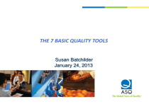 THE 7 BASIC QUALITY TOOLS Susan Batchilder January 24, 2013 Group Activity: WHAT’S IN YOUR TOOL BOX? • What is the purpose of your personal toolbox? – cleaning, fixing, remembering, coaching, etc… • What’s in your personal tool box? • When did you last use your tool box? • Do you have a tool box for your job? • What is the purpose of your tool box for work? QUALITY TOOLS • Purpose: provide the means for making decisions. • No particular tool is mandatory, any one may be helpful, depending on the circumstances. • 95% of a company’s problems can be solved using these tools. • These are basic tools designed for simplicity. • Only one requires any significant training. 7 BASIC QUALITY TOOLS • FLOW CHART • CAUSE AND EFFECT DIAGRAMS • CHECK SHEET • HISTOGRAMS • PARETO CHART • SCATTER DIAGRAM • CONTROL CHARTS Question: Why do we use these tools? QUALITY TOOLS CAN… • Help to identify and prioritize problems quickly and more effectively • Assist with the decision making process • Simple but powerful tools for use in continuous improvement activity • Provide a vehicle for communicating problems and resolutions through-out the business • Provide a way of extracting information from data collected. A Side Topic STRATIFICATION • The 7 Quality Tools are useful when collecting data of daily activities and analyzing them to detect and solve problems, and an important concept for data analysis is STRATIFICATION. • Stratification mean classification of data in to a couple of layers, and each layer is a subset of the population. • Through stratification different statuses from the same data is retrieved. • What layers are considered for data analysis is crucial when identifying problems. Example of Stratification • Number of births per year • Number of births by gender per year • Number of births by mom’s economic status by gender per year • deliveries per week • deliveries per day of the week per week • deliveries by hour per day of week per week • DANAGER: When using stratification ensure it is value added • Back to the 7 Quality Tools FLOW CHARTS • Purpose: Illustrates the steps in a process • Uses: – Analyzing a process (e.g. relating one setp in the process to others) – Initiate process improvements (e.g. non-value added steps) – Indicates where in the process to take measurements and collect data • DANGER: including assumed or desired steps • Note: The utility of the chart will correlate directly to its accuracy. Example: Flow Chart CAUSE AND EFFECT DIAGRAMS • Purpose: to identify as many possible factors for an effect or problem and sort the causes into useful categories. • When to use? – Identifying possible factors – When team’s thinking falls into a “rut” • Fishbone (most common) – Generic categories: Methods, Machines, Materials, Manpower, Measurement, Mother Nature HOW TO CREATE A FISHBONE CAUSE AND EFFECT DIAGRAM Manpower Machines Methods Problem Statement “Effect” Management Mother Nature Measurement Materials Maintenance CAUSE AND EFFECT DIAGRAMS • Other fishbone categories: – Plan, Policies, Procedures, Plant, People – Customers, Suppliers, Shipping, Warehouse… • 5 WHYS: a method for getting to the root cause. – Can also be used during the construction of the fishbone diagram. • GROUP ACTIVITY TIME – Let determine the cause of a particular problem. Please give me a problem statement and we’ll use the 6M’s. GROUP ACTIVITY TIME Manpower Machines Methods Problem Statement “Effect” Mother Nature Measurement Materials CAUSE AND EFFECT DIAGRAMS Now What? • Categorize (e.g. not probable, probable, very probable) • Regression analysis (requires in-depth training) • Design of experiments (requires in-depth training) • Lets go back to our example and determine what our next steps will be. • Do you remember the first time you heard about a check list with regards to data collection? Example of a Check List CHECK SHEET • WHAT: A structured and prepared form. • PURPOSE: To collect and analyze data so decisions can be based on facts • WHEN: – When data can be observed and collected by the same person or at the same location. – When collecting data on the frequency or pattern of events, problems, defects, defect location, defect causes, etc. – When collecting data from a production process. • Data can further be used to create a histogram, bar chart and Pareto chart A Check List Can Become … A Bar Graph HISTOGRAM • WHAT: A frequency distribution bar graph • USES: – Illustrates how often each different value in a data set occurs – Allows us to make sense of data – Allows use to see patterns that are difficult to see in tables of numbers • DANGER: Before making any conclusions from a histogram, it must be confirmed the process was operating normally during the time period being studied Language of Histograms What do they tell us? SCATTER DIAGRAM • WHAT: Scatter diagram graphs PAIRS of numerical data. • PURPOSE: To look for a possible relationship • DANGER: Even if the scatter diagram shows a relationship, do not assume one variable causes the other. Both variable may be influenced by a third. Scatter Diagram Examples Graph 1 – strong correlation (linear) Graph 2 – moderate correlation Graph 3 – no correlation Also – quadratic, exponential, sinusoidal, and others PARETO CHART • What: Bar graph organized with the longest bars on the left and the shortest to the right • Purpose: Problem identification tool --- Visually depicts which issues are more significant • Use when… – Analyzing data about the frequency of problems/causes in a process – There are many problems/causes and there is a need to focus on the most significant – Analyzing broad causes by looking at their specific components – Communicating data to others PARETO PRINCIPLE 20/80 RULE • THE IDEA THAT 20% OF THE CAUSES GENERATES 80% OF THE RE
