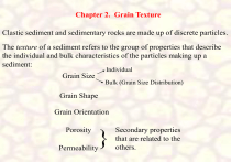 Chapter 2. Grain Texture Clastic sediment and sedimentary rocks are made up of discrete particles. The texture of a sediment refers to the group of properties that describe the individual and bulk characteristics of the particles making up a sediment: Individual Grain Size Bulk (Grain Size Distribution) Grain Shape Grain Orientation Porosity } Permeability Secondary properties that are related to the others. These properties collectively make up the texture of a sediment or sedimentary rock. Each can be used to infer something of: The history of a sediment. The processes that acted during transport and deposition of a sediment. The behavior of a sediment. This section focuses on each of these properties, including: Methods of determining the properties. The terminology used to describe the properties. The significance of the properties. Grain Size I. Grain Volume (V) a) Based on the weight of the particle: m Vr S Where:m is the mass of the particle. V is the volume of the particle. rs is the density of the material making up the particle. (r is the lower case Greek letter rho). 1. Weigh the particle to determine m. 2. Determine or assume a density. (density of quartz = 2650kg/m3) 3. Solve for V. V m rS Error due to error in assumed density; Porous material will have a smaller density and less solid volume so this method will underestimate the overall volume. b) Direct measurement by displacement. b) Direct measurement by displacement. b) Direct measurement by displacement. Accuracy depends on how accurately the displaced volume can be measured. Not practical for very small grains. For porous materials this method will underestimate the external volume of the particle. c) Based on dimensions of the particle. Where:d is the diameter of the particle And the particle is a perfect sphere. V d 6 Measure the diameter of the particle and solve for V. Problem: natural particles are rarely spheres. 3 II. Linear dimensions. a) Direct Measurement Natural particles normally have irregular shapes so that it is difficult to determine what linear dimensions should be measured. Most particles are not spheres so we normally assume that they can be described as triaxial ellipsoids that are described in terms of three principle axes: dL or a-axis longest dimension. dI or b-axis intermediate dimension. dS or c-axis shortest dimension. To define the three dimensions requires a systematic method so that results by different workers will be consistent. Sedimentologists normally use the Maximum Tangent Rectangle Method. Step 1. Determine the plane of maximum projection for the particle. -an imaginary plane passing through the particle which is in contact with the largest surface area of the particle. The maximum projection area is the area of intersection of the plane with the particle. Step 2. Determine the maximum tangent rectangle for the maximum projection area. -a rectangle with sides having maximum tangential contact with the perimeter of the maximum projection area (the outline of the particle) maximum tangent rectangle Step 2. Determine the maximum tangent rectangle for the maximum projection area. -a rectangle with sides having maximum tangential contact with the perimeter of the maximum projection area (the outline of the particle) dL is the length of the rectangle. dI is the width of the rectangle. Step 3. Rotate the particle so that you view the surface that is at right angles to the plane of maximum projection. dS is the longest distance through the particle in the direction normal to the plane of maximum projection. The volume of a triaxial ellipsoid is given by: d xd xd L I S V= 6 For fine particles only dL and dI can be measured in thin sections. Thin sections are 30 micron (30/1000 mm) thick slices of rock through which light can be transmitted. Click here to see how a thin section is made. http://faculty.gg.uwyo.edu/heller/Sed%20Strat%20Class/SedStratL1/thin_section_mov.htm Axes lengths measured in thin section are “apparent dimensions” of the particle. The length measured in thin section depends on where in the particle that the plane of the thin section passes. Axes lengths measured in thin section are “apparent dimensions” of the particle. The length measured in thin section depends on where in the particle that the plane of the thin section passes. Axes lengths measured in thin section are “apparent dimensions” of the particle. The length measured in thin section depends on where in the particle that the plane of the thin section passes. For a spherical particle its true diameter is only seen in thin section when the plane of the thin section passes through the centre of the particle. The three axes lengths that are commonly measured are often expressed as a single dimension known as the nominal diameter of a particle (dn): dn is the diameter of the sphere with volume (V1) equal the volume (V2) of the particle with axes lengths dL, dI and dS. V1 = volume of the sphere. V2 = volume of a particle. (a triaxial ellipsoid) V1 V2 d 6 6 3 n dLdI dS By the definition of nominal diameter, V1 = V2 Therefore: 6 d 3 n 6 dLdI ds d 6 3 n 6 dLdI ds dn can be solved by rearranging the terms: d 3 n 6 6 dLdI ds d 6 3 n 6 dLdI ds dn can be solved by rearranging the terms: d 3 n 6 6 dLdI ds d 6 3 n 6 dLdI ds dn can be solved by rearranging the terms: d 3 n 6 6 dLdI ds d 3 n 6 6 dLdI ds dn can be solved by rearranging the terms: d 3 n 6 6 dLdI ds d dLdI ds 3 n Therefore: dn 3 dLdI ds Nominal diameter b) Sieving Used to determine the grain size distribution (a bulk property of a sediment). A sample is passed through a vertically stacked set of square-holed screens (sieves). A set of screens are stacked, largest holes on top, smallest on the bottom and shaken in a sieve shaker (Rotap shakers are recommended). Grains that are larger than the holes remain on a screen and the smaller grains pass through, collecting on the screen with holes just smaller than the grains. The grains collected on each screen