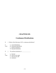 CHAPTER SIX Continuous Distributions D 1. Which of the following is NOT a continuous distribution? E Term D E Term A. B. C. D. 2. normal distribution exponential distribution uniform distribution binomial distribution The uniform distribution is _______________. A. B. C. D. bimodal skewed to the right skewed to the left symmetric 173 174 Test Bank A 3. E Term A. B. C. D. 4. rectangular distribution gamma distribution beta distribution Erlang distribution The distribution in the following graph is a ________ distribution. f(X) D The uniform distribution is also known as the __________. 0.06 0.05 0.04 0.03 0.02 0.01 0.00 35 E Term A E Term A. B. C. D. 5. 40 45 50 55 60 x 65 normal gamma exponential uniform The distribution in the following graph is a ________ distribution. A. B. C. D. normal gamma exponential uniform Chapter 6: Continuous Distributions 175 C 6. E Term B A. B. C. D. 7. E Term A 8. M Calc 1/8 1/4 1/12 1/20 If X is uniformly distributed over the interval 8 to 12, inclusively (8 X 12), then the mean() of this distribution is __________________. A. B. C. D. 9. normal gamma exponential uniform If X is uniformly distributed over the interval 8 to 12, inclusively (8 X 12), then the height of this distribution, f(x), is __________________. A. B. C. D. M Calc C The distribution in the following graph is a ________ distribution. 10 20 5 incalculable If X is uniformly distributed over the interval 8 to 12, inclusively (8 X 12), then the standard deviation () of this distribution is __________________. A. B. C. D. 4 1.33 1.15 2 176 Test Bank B 10. M Calc C A. B. C. D. 11. M Calc D 12. M Calc A M Calc 0.250 0.500 0.375 0.000 If X is uniformly distributed over the interval 8 to 12, inclusively (8 X 12), then P(X < 7) is __________________. A. B. C. D. 14. 0.250 0.333 0.375 0.000 If X is uniformly distributed over the interval 8 to 12, inclusively (8 X 12), then the P(13 X 15) is __________________. A. B. C. D. 13. 0.250 0.500 0.333 1.000 If X is uniformly distributed over the interval 8 to 12, inclusively (8 X 12), then the P(10.0 X 11.5) is __________________. A. B. C. D. M Calc B If X is uniformly distributed over the interval 8 to 12, inclusively (8 X 12), then the P(9 X 11) is __________________. 0.500 0.000 0.375 0.250 If X is uniformly distributed over the interval 8 to 12, inclusively (8 X 12), then P(X 11) is __________________. A. B. C. D. 0.750 0.000 0.333 0.500 Chapter 6: Continuous Distributions 177 D 15. E Calc A A. B. C. D. 16. E Calc B 17. M Calc C M Calc 50 25 10 5 If X is uniformly distributed over the interval 20 to 30, inclusively (20 X 30), then the standard deviation () of this distribution is __________________. A. B. C. D. 19. 1/10 1/20 1/30 1/50 If X is uniformly distributed over the interval 20 to 30, inclusively (20 X 30), then the mean () of this distribution is __________________. A. B. C. D. 18. 0.750 0.000 0.333 0.500 If X is uniformly distributed over the interval 20 to 30, inclusively (20 X 30), then the height of this distribution, f(x), is __________________. A. B. C. D. M Calc D If X is uniformly distributed over the interval 8 to 12, inclusively (8 X 12), then P(X 10) is __________________. incalculable 8.33 0.833 2.89 If X is uniformly distributed over the interval 20 to 30, inclusively (20 X 30), then P(25 X 28) is __________________. A. B. C. D. 0.250 0.500 0.300 1.000 178 Test Bank A 20. M Calc B A. B. C. D. 21. M Calc C 22. M Calc D M Calc 0.500 0.300 0.000 0.250 If X is uniformly distributed over the interval 20 to 30, inclusively (20 X 30), then P(X 22) is __________________. A. B. C. D. 24. 0.500 0.000 0.375 0.200 If X is uniformly distributed over the interval 20 to 30, inclusively (20 X 30), then P(X < 17) is __________________. A. B. C. D. 23. 0.250 0.333 0.375 0.000 If X is uniformly distributed over the interval 20 to 30, inclusively (20 X 30), then P(33 X 35) is __________________. A. B. C. D. M Calc A If X is uniformly distributed over the interval 20 to 30, inclusively (20 X 30), then P(21.75 X 24.25) is __________________. 0.200 0.300 0.000 0.250 If X is uniformly distributed over the interval 20 to 30, inclusively (20 X 30), then P(X 24) is __________________. A. B. C. D. 0.100 0.000 0.333 0.600 Chapter 6: Continuous Distributions 179 C 25. Helen Casner, a labor relations arbitrator, feels that the amount of time needed to arbitrate a labor dispute is uniformly distributed over the interval 4 to 24 hours, inclusively (4 X 24). Accordingly, the mean (average) time needed to arbitrate a labor dispute is ____________. M BCalc A. B. C. D. D Helen Casner, a labor relations arbitrator, feels that the amount of time needed to arbitrate a labor dispute is uniformly distributed over the interval 4 to 24 hours, inclusively (4 X 24). Accordingly, the probability that a labor dispute will be arbitrated in 8 hours or less is ____________. 26. 20 hours 16 hours 14 hours 12 hours M BCalc A. B. C. D. C Helen Casner, a labor relations arbitrator, feels that the amount of time needed to arbitrate a labor dispute is uniformly distributed over the interval 4 to 24 hours, inclusively (4 X 24). Accordingly, the probability that a labor dispute will require between 8 and 16 hours, inclusively, for arbitration is ____________. 27. 0.3333 0.6667 0.0000 0.2000 M BCalc A. B. C. D. B The normal distribution is an example of _______. 28. E Term A. B. C. D. 0.3333 0.6667 0.4000 0.2000 a discrete distribution a continuous distribution a bimodal distribution an exponential distribution 180 Test Bank B 29. The total area underneath any normal curve is _______. E Term A. B. C. D. D The area to the left of the mean in any normal distribution is _______. 30. equal to the mean equal to 1 equal to the variance equal to the coefficient of variation E Term A. B. C. D. B For any normal distribution, any value less than the mean would have a _______. 31. equal to the mean equal to 1 equal to the variance equal to 0.5 E Term A. B. C. D. D A standardized normal distribution has