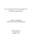 POLLUTION PREVENTION INTERNSHIP-1999 DEPARTMENT OF CHEMICAL ENGINEERING UNIVERSITY OF NEW HAMPSHIRE METAL FINISHING STRATEGIC GOALS PROGRAM Thilanka Dissanayake Jessica Early September 7, 1999 POLLUTION PREVENTION INTERNSHIP – 1999 STRATEGIC GOALS PROGRAM INTERNSHIP Interns: Thilanka Dissanayake Senior, Chemical Engineering Phone: (603) 862 – 8114 Jessica Early Junior, Chemical Engineering Phone: (603) 868 – 7379 Contact Person: Linda Darveau Environmental Specialist, EPA Phone: (617) 918 – 1718 Fax: (617) 918 – 1810 STRATEGIC GOALS PROGRAM INTERNSHIP Table of Contents Executive Summery 4 Introduction 5 Goals and Objectives 6 Approach and Methodology 7 Chemical Usage 10 Releases and Wastes Generated 10 Details of Work Accomplishments and Project Results 11 Pollution Prevention Benefits 11 Recommendations for Future Efforts 11 References 12 Appendices A: Statement of Commitment 13 B: SPG Worksheet 14 C: Metals and Chemicals list for sections 4 and 5 19 D: List of facilities visited and has completed worksheets 20 E: Pictures of some metal finishing facilities 22 EXECUTIVE SUMMERY Strategic Goals Program (SGP) is a voluntary cooperative effort by the American Electroplaters and Surface Finishers Society (AESF), National Association of Metal Finishers (NAMF), Metal Finishing Suppliers Association (MFSA), and by the Environmental Protection agency (EPA). This was started to promote metal finishers to be better than compliance levels. Facilities joined the SGP by signing a statement of commitment. Then a SGP worksheet was completed for the baseline year, followed by a worksheet for years 1997 and 1998, provided baseline year was not 1997 or 1998. SGP has specific goals listed in the worksheet that gears facilities towards pollution prevention and Environmental and Energy conservation. Main goal of the program is that each facility meats the goals by year 2002, in comparison with the baseline year. SGP specific goals are, 50% reduction in water use 25% reduction in energy use 50% reduction in land disposal of hazardous sludge and reduction in sludge generation 50% reduction in metals emissions to air and water 98% metals utilization 90% reduction in organic chemicals emissions to air and water Reduction in human exposure to toxic material Compliance with environmental performance standards When facilities complete and download worksheet information to SGP database, they would receive a numerical cord that can be used as a password for that particular facility to refer to their data and benchmark against other facilities, and their own baseline year. Therefore, facilities can track their performance and progress towards achieving above goals. Completing SGP worksheets are mostly self-explanatory, but a detailed description would be provided later in the report. From the exposure to many facilities visited during the internship’s duration, it was seen that many facilities have already achieved many goals by now, compared to their baseline year or are very close in achieving them. Many facilities have decreased or eliminated the usage of chemicals which are hazardous or would lead to hazardous byproducts. To encourage many more facilities to join the SGP it is suggested to give more publicity to SGP, since facilities should join the program voluntarily and with much interest. To promote progress towards goals, recognition or awards may be given to those facilities who are making good progress. INTRODUCTION Strategic Goals Program (SGP) is a voluntary program and a cooperative effort established by the following organizations: American Electroplaters and Surface Finishers Society (AESF) National Association of Metal Finishers (NAMF) Metal Finishing Suppliers Association (MFSA) Environmental Protection Agency (EPA) To join this program each facility would sign a Statement of Commitment as a CSI Charter 100 Company, for the Strategic Goals Program Metal Finishing Sector (please see appendix A). The program establishes a set of voluntary National Performance Goals for the metal finishing industry to perform better than compliance levels. SGP Worksheets (Please see appendix B) help facilities track annual progress towards goals, and help achieve the goals by year 2002, as intended by the program. For each facility, a worksheet was completed for a baseline year (baseline year would be discussed in detail further in the report), and 1997 and 1998, if baseline year was not 1997 or 1998. Each year in the future, they would complete a worksheet for that year, which would be due on February 15, annually. These worksheets were mailed to the following address; National Center for Manufacturing Sciences (NCMS) Strategic Goals program 3025 Boardwalk Ann Arbor, MI 58108-3266 Here, information of each facility would be entered to a database (if worksheets were not completed on the web format).Information about each facility would be available at www.strategicgoals.org as a database, anonymously. Initially, facilities would receive a numerical code as a password that could be used in the anonymous database, to obtain that particular facilities information and for benchmarking. Annually, each facility would receive a report card of their performance towards achieving goals. GOALS AND OBJECTIVES Goals of the program are clearly explained and mentioned in the worksheets itself. Mainly they are, 50% reduction in water use 25% reduction in energy use 50% reduction in land disposal of hazardous sludge and a reduction in sludge generation 50% reduction in metals emissions to air and water 98% metals utilization 90% reduction in organic chemicals emissions to air and water Reduction in human exposure to toxic material Compliance with environmental performance standards Achieving all these goals are compared to the baseline year. Main goal is for facilities to achieve these goals by year 2002. Objectives of the strategic goals program is to make industries observe the costs associated with regulatory issues and