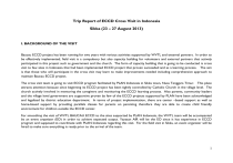 Trip Report of ECCD Cross Visit in Indonesia Sikka (23 – 27 August 2013) I. BACKGROUND OF THE VISIT Baucau ECCD project has been running for two years with various activities supported by WVTL and external partners. In order to be effectively implemented, field visit is a compulsory but also capacity building for volunteers and external partners that actively participated in this project such as government and the church. The form of capacity building that is going to be conducted is cross visit to few sites in Indonesia that had been implemented ECCD project that proven succeeded and as a learning process. The aim is that those who will participate in the cross visit may learn to make improvements needed including comprehensive approach to maintain Baucau ECCD project. The cross visit team is going to visit ECCD program facilitated by PLAN Indonesia in Sikka town, Nusa Tenggara Timur. This place attracts attention because since beginning its ECCD project has been tightly controlled by Catholic Church in the village level. The church actively involved in mentoring the caregivers and monitoring the ECCD learning process. Also parents, community leaders and the village level government are supportive proven by few of the ECCD projects supported by PLAN have been acknowledged and legalized by district education department. In terms of project implementation, there are center –based support as well as home-based support by providing parallels classes for parents on parenting therefore they are able to create child friendly environment for children outside the ECCD center. For smoothing the visit of WVTL BAUCAU ECCD to the sites supported by PLAN Indonesia, the WVTL team will be accompanied by an event organizer (EO) in order to achieve expected output. Yayasan AIR will be the EO since it has experience in ECCD program and supposed to coordinate with PLAN Indonesia regarding this visit. For the field visit in Sikka, an event organizer will be hired to make sure everything is ready prior to the arrival of the team. 1 II. ROLES OF EVENT ORGANIZER To establish close communication and coordination with PLAN Indonesia regarding prospective village/sites to be visited including brief profile of the ECCD of each district that will be visited - Ensuring that the visit will be based on the schedule including meeting schedule in the district and village To arrange and organize logistic needs during the visit in Sikka both the meeting in the village and district level III. ACTIVITES REPORT Date Time Activities 8:00 Arrived in Maumere Venue/ Location Result Check in the hotel, arrange the rental car and journal package, confirm the dinner venue and coordinate with PLAN's staff 23-Aug-13 Sylvia Hotel 16:30 18:30 – 20:30 Picked up the WVTL team at the Frans Seda airport Dinner meeting with PLAN Sikka staff The WVTL team arrived at 5:15 pm then heading to hotel Jakarta Restaurant There were 18 people in the entry meeting. The WVTL team from Baucau district are ECCD Specialist (1), Director of education ministry (1), ECCD Coordinator (1), ECCD Facilitator (1), Head of Village (1), Chatolic church leader (2), ECCD volunteer(1). There were 9 people of PLAN Sikka staff included ECCD Senior Officer (4), Project Coordinator (1), WASHs coordinator (1), ECCD M & E Specialist (1), ECCD Specialist (1) and Manager (1). General Observation The Sylvia hotel is quite far from the dining place so need to rent car full day so that can drive the team for dinner Some of the PLAN Internationah staff attended the entry meeting didn't worked directly for ECCD project 2 The meeting started with introduction (EO), security briefing (project coordinator), and PLAN ECCD project scheme (ECCD Specialist). Then continued with discussion where WVTL team posted questions to be responded by the PLAN staff. Points of discussion covered child safeguarding policy that should be signed by the visitors prior to the field visit. The ECCD centers that initiated by the community as the result of 10 sessions of parenting class for parents and various support from the 'paroki' in the village level. 24-Aug-13 09:45 – 10:15 10:15 – 13:30 The meeting took almost 2 hours. WVTL team got preliminary information on the ECCD project and encouraged to visit the ECCD centres as being scheduled so EO emphasize on being punctual on the first day of site visit at the end of meeting. There were 3 cars convoy to Watutena sub-village. The team leave Maumere on 7.15 am and arrived in the sub-village on 9.45 am. The ECCD activity held in the small building of 1 storage room and 1 open terrace. There were 8 children out of 18 enrolled children. Who were playing freely in 2 corners prepared by ECCD tutor. This is the last activity of daily schedule prior to send children home. Class observation of Watutena ECCD center managed by community Discussion with ECCD committee, caregivers, community and parenting club members who running the ECCD program Watutena ECCD center It was scheduled earlier to have a separate meeting with the parenting club in the afternoon however since the males (fathers) are having 'pati ea' ceremonial on harvesting in the afternoon so the dicussion with big audience held before lunch. There were 26 people registered in the attendance list (6 PLAN staff, 9 WVTL team, 11 community member) and 5 females cook. The WVTL team learned many information including process taken prior to the ECCD establishment. Actually the ECCD project socialization and its activities was continously done within community level either home visit or spreading invitation through weekly church gathering or collaborate with POSYANDU activity. The impact of parenting activity was household leaders realized the importance of ECCD project and initiate meeting among church, sub-village leaders, parents and PLAN staff to run ECCD centres. All WVTL team involved in the discussion except church representatives that attentively listened and observed where as the ECCD volunt