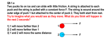 Two pucks lie on ice and can slide with little friction. A string is attached to each