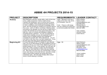 ABBIE 4H PROJECTS 2014-15 PROJECT DESCRIPTION REQUIREMENTS LEADER CONTACT Archery New Members will learn range safey, parts of the bow, arrow, safety equipment, how to repair arrows, maintain the equipment, and of course how to shoot and score targets. More advanced archers will focus on form, proficiency and continued knowledge of the sport. We will primarily be meeting at Livermore Rod & Gun Club, north of I-580 in Livermore. Meeting dates and times to be decided, but we will try to meet once a month, We will also try to have guest instructors, one field trip, mail in-in shoots and speakers related to shooting sports in general. You are not expected to make every meeting, but you are expected to get at least 6 hours of target practice and meetings to complete the project with 100% attendance. You do not need to own your bow; we have equipment. If you do own your own bow you’re welcome to bring it Is it your first year of 4H? Or maybe it’s your second year, but you’re still looking for some guidance and fun activities to fill up your time? Well, Beginning 4H is the perfect project for you. In this project, you will learn all about 4H, make a project to enter into the Alameda County Fair, and meet lots of other kids just starting 4H. Also learn how and why you should keep a record book, learn about community service, and get a sneak peek at what other projects are doing with some scheduled visits. We will meet Fridays after school once a month starting in October. Ages: Members must be 9 years old by Dec 31st, 2013, no Primaries. Limit 18 Beginning 4H Cost: . There is a $5 range fee per meeting at range and a one-time project fee of $25. Adult Leaders: Sabina Carter snecarter@yahoo.com 925-989-2433 Michele Munro munro821@aol.com 925-487-0894 Teen Leaders: Harrison Carter Austin Munro Age: 9+ Adult Advisors: Sabina Carter snecarter@yahoo.com 925-989-2433 Elizabeth Lester e_lester@me.com 925-216-3592 Junior Leaders: Josie Carter Elise Lester Beginning Chess Cattle: Beef Cavies *NEW THIS YEAR* Have you ever wanted to play chess? This is the project for you. In each class we will spend the first part teaching the basics, and the second part either playing the game or practicing with the pieces depending on the skill of the player. Meetings are held on the 4th Wednesdays of every month, starting in September, excepting November and December, when we will take a break for the holidays. The time will be from 4 to 5 PM. Raising a market steer or breeding heifer. Steers must be owned by the last weekend in February, however most purchase steers by October while they are still small enough to handle. Heifers must be owned 90-days before fair. Exhibitors should plan to spend 15+ hours a week with their project animal. This project will focus on responsible pet ownership of Cavies (pronounced kay-vees), which are guinea pigs. Both pet animals and purebreds are acceptable choices. Cavy education will include breeds, color varieties, health with a focus on diet, and habitat. Meetings will have some fun themes and some will involve the ever-popular dress-up-your cavy fun theme. There is a strong focus on showmanship in this project - where the child is judged on how well they present their cavy.... this allows part bred pets and purebreds to compete with equal status. This project is suitable for kids with a single pet or responsible members who want to breed and show purebreds. We will have some 4-H project shows where members can both show and judge the animals, a booth at Small Animal Field Day, travel to an open show that has adult owners who can help the kids learn more. The project members will be required to create both educational posters and show their live cavy show at the Alameda County Fair. Age: 9 and up. Limit of 10 people. Bring a chess set if you have one, but you don't need one to participate. Adult Leader: Lisa Roberts lisa@drwob.com 925-417-8894 Age: 9+ Cost: Calves can be purchased for $1500+ Feed costs average $100/month. Suzette & Breanne Maggy xccowgirl88@yahoo.com 925/216-0807 Age: Open to all, including mini-members. Meetings will be primarily on weekends-aiming for Sundays when sports schedules are not a major conflict... usually held at a member's home in the Pleasanton area; in good weather, outdoor meetings at a park are an option. Jane Morehouse annjane2@earthlink.net 510-351-4859 home land line with recorder 510-351-1174 cell Deirdre Gipson mdn_gipson@yahoo.com 925-461-1214 (home) 925-487-7103 (cell) Crochet Learn basic crochet and complete a project for the fair. Project will initially consist of four meetings beginning in January. Age: 9+, younger for siblings of older members. Nissa Nack; nissanack@comcast.net (925) 484-1942 East Bay Adventures *NEW THIS YEAR* Educational and Fun! Learn about interesting venues in the East Bay. Field trips to locations you might not have been to before. We will meet at these locations, so family and/friends welcome. Dates for the trips will try to accommodate all my project members. All weekend outings. Age: 10+ Meetings held on weekends Patty Shipps patty_shipps@yahoo.com hm ph 925-230-8360 cell ph 925-570-3798 #1 Oakland Museum of California California History, Natural History, and Art exhibit areas Scavenger Hunt with a prize Free – First Sunday of the month (parking fee) #2 Mt. Diablo State Park Rock Climbing, short Hike, and Summit Visitors Center (park entrance fee) #3 Black Diamond Mines Regional Preserve Antioch - Mines Tour (tour cost $5 per person) (park entrance fee) #4 Ardenwood Historic Farm Monarch Butterfly viewing in the eucalyptus trees Farm animals Historic house tour (depending on date) (park entrance fee $3 per person) #5 Alameda Beach Sand Castle & Sculpture Contest Held in early June so we might have this outing too. Crown Memorial State Beach Field trip to see participant creations. (possible parking fee) Foods: Baking and Breadmaking Foods: Canning Gardening Goats - Dairy This project is designed to fost