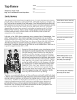 Tap Dance Name ____________________________________________________ Date ______________ Written by: Rusty Frank http://www.britannica.com/art/tap-dance Per _______________ Early history Tap originated in the United States through the fusion of several ethnic percussive dances, primarily African tribal dances and Scottish, Irish, and English clog dances, hornpipes, and jigs. Until the last few decades of the 20th century, it was believed that African slaves and Irish indentured servants had observed each other’s dances on Southern plantations and that tap dancing was born from this contact. In the late 20th century, however, researchers suggested that tap instead was nurtured in such urban environments as the Five Points District in New York City, where a variety of ethnic groups lived side by side under crowded conditions and in constant contact with the distinctly urban rhythms and syncopations of the machine age. In the mid- to late 1800s, dance competitions were a common form of entertainment. Later called “cutting contests,” these intense challenges between dancers were an excellent breeding ground for new talent. (One of the earliest recorded such challenges took place in 1844 between black dancer William Henry Lane, known as Master Juba, and Irish dancer John Diamond.) Dancers matured by learning each other’s techniques and rhythmic innovations. The primary showcase for tap of this era was the minstrel show, which was at its peak from approximately 1850 to 1870. During the following decades, styles of tap dancing evolved and merged. Among the ingredients that went into the mix were buck dancing (a dance similar to but older than the clog dance), soft-shoe dancing (a relaxed, graceful dance done in soft-soled shoes and made popular in vaudeville), and buck-and-wing dancing (a fast and flashy dance usually done in wooden-soled shoes and combining Irish clogging styles, high kicks, and complex African rhythms and steps such as the shuffle and slide; it is the forerunner of rhythm tap). Tap dance as it is known today did not emerge until roughly the 1920s, when “taps,” nailed or screwed onto shoe soles at the toes and heels, became popular. During this time entire chorus lines in shows such as Shuffle Along (1921) first appeared on stage with “tap shoes,” and the dance they did became known as tap dancing. Tap dance was a particularly dynamic art form, and dancers continually molded and shaped it. Dancers such as Harland Dixon and Jimmy Doyle (a duo known for their buck-and-wing dancing) impressed audiences and influenced developing dancers with their skill, ingenuity, and creativity. In addition to shaping dance performance, tap dancers influenced the evolution of popular American music in the early to mid-20th century; drummers in particular drew ideas as well as inspiration from the dancers’ rhythmic patterns and innovations. Early recordings of tap dancers demonstrate that their syncopations were actually years ahead of the rhythms in popular music. What ethnic dances does tap seem to have evolved from? ________________________ ________________________ ________________________ ________________________ ________________________ ________________________ How did competitions help progress tap? ________________________ ________________________ ________________________ ________________________ ________________________ ________________________ When did tap dance as we know it, with metal taps on the shoes, first emerge? ________________________ ________________________ ________________________ ________________________ How did tap dance influence the music of the time? ________________________ ________________________ ________________________ ________________________ ________________________ ________________________ ________________________ ________________________ ________________________ Vaudeville In the early 20th century, vaudeville variety shows moved to the entertainment forefront. According to the producer Leonard Reed, throughout the 1920s “there wasn’t a show that didn’t feature tap dancing. If you couldn’t dance, you couldn’t get a job!” Nightclubs, vaudeville, and musicals all featured tap dancers, whose names often appeared on the many marquees that illuminated New York’s Broadway. Stars of the day, including Fred Astaire and his sister, Adele, brought yet more light to the “Great White Way” with their elegant dancing. Bill Robinson, known for dancing on the balls of his feet (the toe taps) and for his exquisite “stair dance,” was the first black tap dancer to break through the Broadway colour line, becoming one the best-loved dancers of the time. Nightclubs From the 1920s to the ’40s, fans of tap could find their favourite dancers in a new venue, nightclubs, where—together with singers and bands—dancers became regular features. A single evening’s show could involve as many as 20 tap dancers—a featured solo dancer, a featured duo or trio act, and a chorus line. This formula was common across the nation in venues such as the Cotton Club (Harlem, New York City), the Plantation Club (Culver City, California), the Cocoanut Grove (Los Angeles), and Ciro’s (Hollywood). Many tap dance luminaries, including Ruby Keeler, the Nicholas Brothers, and Louis DaPron, began their careers in nightclubs. Nightclubs and other live shows (vaudeville, Broadway) were segregated in the early years. The white circuit included such prestigious routes as the Orpheum Circuit and such acts as that of Fred and Adele Astaire. African American artists, however, generally relied on the Theatre Owners’ Booking Association (TOBA), which booked black entertainers in the “chitlin circuit” (venues that catered to black audiences).With the help of a few open-minded booking agents, African American entertainers eventually broke the colour line by sheer determination and skill. Bill Robinson is credited with being the first African American solo entertainer t