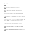 Probability True / False Questions 1. Objective probability involves personal judgment or intuition in a given context. FALSE 2. Those elements that are not in Set A are called the complement of A. TRUE 3. The set of all basic outcomes of an experiment is called the union of the set. FALSE 4. In the experiment of tossing a fair die once, the sample space includes six events. TRUE 5. The probability of event A is defined as the number of ways event A can occur, divided by the number of outcomes possible in the experiment. TRUE 6. In the experiment consisting of drawing one card at random from a standard deck of 52 cards, the sample space for the event of drawing a seven consists of 2 outcomes. FALSE 7. The probability of drawing a seven, from a standard deck of 52 cards is 1/4. FALSE 8. If event A consists of the event of drawing a red card from a standard deck of 52 cards, then the complement of event A is the event of drawing a black card from this deck. TRUE 9. The intersection of two sets includes all elements that are part of either set or both sets. FALSE 10. The probability of event A, an event that is certain to occur is one. TRUE 11. The probability of drawing a card, chosen at random from a standard deck of 52 cards, which is either a diamond or a club is 0.5. TRUE 12. Two events which are mutually exclusive events, are also complements of each other. FALSE 13. When two events, A and B, are independent, then the product of their individual probabilities is equal to the probability that both events occur or P(A) x P(B) = P(A B). TRUE 14. In order to count the number of ways that a committee of three, including a chair, a secretary and a treasurer, could be chosen from a group of ten people, a combination would be used. FALSE 15. The probability of any particular event or combination of events, can be larger than one in certain specific cases. FALSE 16. The probability of rolling a 7 on a pair of dice is higher than rolling any other number. TRUE 17. If the probability of rolling a 2 on a pair of dice is 1/36, the probability of not rolling a 2 is 35/36. TRUE Multiple Choice Questions 18. One out of three mini-vans sold by a nationwide auto dealer has a hidden defect in its transmission. What is the probability that a randomly selected purchaser of two mini-vans will wind up with at least one mini-van with a defective transmission? A. 0.333 B. 0.500 C. 0.667 D. 0.250 E. 0.556 19. One out of three mini-vans sold by a nationwide auto dealer has a hidden defect in its transmission. If a small business purchases four mini-vans from this dealer, what is the probability that this purchaser will wind up with exactly two mini-vans with defective transmissions? A. 0.2963 B. 0.1111 C. 0.2222 D. 0.7037 E. 0.7778 20. An experienced business-school graduate has an 80% probability of getting a particular job. An inexperienced business-school graduate has a 50% chance of getting the same job. 60% of business-school graduates are inexperienced. If the job is offered to a business-school graduate, what is the probability that the person was inexperienced? A. 0.4 B. 0.6 C. 0.3 D. 0.4839 E. 0.6667 21. A manager assigns three different jobs to five different operators at random. Each operator is best-suited for a distinct job. What is the probability that each job will be assigned to that operator who is best for that job? A. 3/5 B. 1/60 C. 3/50 D. 5/60 E. 1/15 Use the following to answer questions 22-23: The probability that a customer will buy a product given that he or she has seen an advertisement for the product is 0.15. The probability that a consumer will see an ad for this particular product is 0.20. 22. What is the probability that a consumer will both see the ad and buy the product? A. 0.75 B. 0.075 C. 0.35 D. 0.03 E. 0.035 23. The probability that a consumer who did not see this ad will buy the product is 0.05. Find the probability that a given consumer will buy the product. A. 0.04 B. 0.07 C. 0.03 D. 0.012 E. None of the above 24. The probability that account A will have an error in it is 0.75. The probability that account B will have an error in it is 0.40. The probability that both accounts will be in error is 0.20. Are these two accounts independent of each other? A. Yes B. No C. Insufficient information to determine 25. The probability that a shot will hit the target is 0.02. Successive shots are independent of each other. What is the probability that at least one out of four shots will hit the target? A. 0.25 B. 0.005 C. 0.99999984 D. 0.00000016 E. 0.0776 26. A car gets involved in an accident 80% of the time if it is defective. If it is not defective, the probability reduces to 40%. 30% of all cars are defective. If a car is involved in an accident, what is the probability that it was defective? A. 0.32 B. 0.24 C. 0.4615 D. 0.12 E. 0.0343 27. Thirty percent of the managers in a certain company have MBA degrees as well as professional training. Eighty percent of all managers in the firm have professional training. If a manager is randomly chosen and found to have professional training, what is the probability that he or she also has an MBA? A. 0.24 B. 0.5 C. 0.375 D. 0.26 E. 0.625 28. A box has 20 screws, three of which are known to be defective. What is the probability that the first two screws taken out of the box are both defective? A. 0.0158 B. 0.15 C. 0.0237 D. 0.0225 E. None of the above 29. A box has 20 screws, three of which are known to be defective. What is the probability that exactly one of the first two screws taken out of the box are defective? A. 0.1342 B. 0.2684 C. 0.05 D. 0.0158 E. None of the above Use the following to answer questions 30-31: Two players are competing in a shooting gallery, each getting one shot at the target. The probability of the first shooter hitting the target is 0.57 and the probability of the second shooter hitting the target is 0.65. 30. What is the probability that both shooters hit their targets? A. 0.08 B. 0.8769 C. 0.3705 D. 0.614 E. 0.6