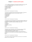 Chapter 3 - Sensation and Perception 1. Anna is reading her psychology text. The activation of receptors in her retina is called ________; her interpretation of the stimuli as particular words is termed _______. a. perception; perception as well b. sensation; sensation also c. sensation; perception d. perception; sensation Answer: c Page: 61 APA Goal: Goal 1: Knowledge Base of Psychology 2. The branch of psychology that studies the relation between attributes of the physical world and our psychological experience of those attributes is called _______. a. physical psychology b. astropsychology c. parapsychology d. psychophysics Answer: d Page: 61 APA Goal: Goal 1: Knowledge Base of Psychology 3. Dr. Breiland examines the relationship between the physical properties of light, such as its amplitude and wavelength, and humans’ perception of color. Which of the following terms MOST ACCURATELY describes Dr. Breiland’s field of study? a. sensation b. psychophysics c. perception d. experimental psychology Answer: b Page: 61 APA Goal: Goal 1: Knowledge Base of Psychology 4. Regarding sensation and perception, which of the following statements is TRUE? a. Perception generally precedes sensation in our processing of a stimulus. b. Sensation and perception are essentially synonyms. c. Sensation involves the interpretation of a stimulus, whereas perception does not. d. Sensation involves the activation of sense receptors; perception involves interpretation. Answer: d Page: 61 APA Goal: Goal 1: Knowledge Base of Psychology 5. We can detect a single drop of perfume diffused in an area the size of a one-bedroom apartment. This is an example of a(n) a. absolute threshold. b. difference threshold. c. just noticeable difference. d. psychophysical minimum. Answer: a Page: 61-62 APA Goal: Goal 1: Knowledge Base of Psychology 6. Which of the following most closely approximates the meaning of the term noise as psychophysicists use it? a. loud sound b. unpleasant sound c. distraction d. Either A or B Answer: c Page: 62 APA Goal: Goal 1: Knowledge Base of Psychology 7. A snack manufacturer finds that it must increase the salt content of its chips by 8 percent in order for a sample of consumers to notice that the chips are saltier than they were before. This example most nearly illustrates the concept of a(n) a. absolute threshold. b. difference threshold. c. just noticeable difference. d. Both B and C Answer: d Page: 62 APA Goal: Goal 2: Research Methods in Psychology 8. For a given stimulus dimension, such as weight, a JND (just noticeable difference) is a(n) a. fixed value. b. constant proportion. c. variable proportion. d. random value. Answer: b Page: 62 APA Goal: Goal 2: Research Methods in Psychology 9. Acme Snacks wants to make its chips saltier, but it doesn’t want to spend more than it has to on salt. A sample of consumers are asked to compare its current chip (saltiness = 100) with saltier versions and to indicate whether the new version is saltier. On average, sample consumers reliably say the new chip is saltier when its saltiness value is 108, but not when its saltiness value is below 108. Assuming Acme Snacks’ sample consumers are representative of people in general, which of the following best represents the JND for saltiness? a. 8% b. 108 c. 80% d. 100 Answer: a Page: 62 APA Goal: Goal 2: Research Methods in Psychology 10. The function relating the value of a stimulus along some dimension to the just noticeable difference is known as __________’s law. a. Wernicke b. Wundt c. Weber d. Wertheimer Answer: c Page: 62 APA Goal: Goal 2: Research Methods in Psychology 11. “It’s so noisy! How can you stand it?” remarks Caitlyn as the thruway traffic screams past her friend Dave’s ground floor apartment. “I don’t even notice it anymore,” Dave replies. This exchange best exemplifies the psychophysical concept of a. adaptation. b. accommodation. c. adjustment. d. attenuation. Answer: a Page: 63 APA Goal: Goal 1: Knowledge Base of Psychology 12. The smallest amount of a stimulus needed to detect that the stimulus is present is called its __________ threshold. a. signal b. difference c. absolute d. detection Answer: c Page: 62 APA Goal: Goal 1: Knowledge Base of Psychology 13. Dr. Miller wants to determine the lightest touch that can be felt by various animals compared to humans. He is interested in finding the _____ threshold for touch. a. absolute b. difference c. human d. adaptive Answer: a Page: 62 APA Goal: Goal 1: Knowledge Base of Psychology 14. In a psychophysical experiment, observers first view an adapting stimulus in which small dots on a computer screen all move steadily toward the right. They then view a test stimulus in which they have to determine whether a patch of dots is stationary or moving. Based on your text’s discussion, you might predict that the adapting stimulus would a. decrease observers’ absolute threshold for motion detection. b. increase observers’ absolute threshold for motion detection. c. have little or no effect on observers’ absolute threshold for motion detection. d. decrease observers’ difference threshold for motion detection. Answer: b Page: 62 APA Goal: Goal 1: Knowledge Base of Psychology 15. Megan is placed in a room and told to press a button each times she hears a sound become louder. What is being measured? a. difference threshold for sound b. adaptation threshold for sound c. absolute threshold for sound d. level of auditory adaptation Answer: a Page: 62 APA Goal: Goal 1: Knowledge Base of Psychology 16. Why, really, do we adapt after prolonged exposure to a constant stimulus? a. So we continue to respond to ongoing stimulation. b. So we don’t become distracted by irrelevant changes in the environment. c. So we detect potentially important changes in what’s going on. d. So we don’t become overstimulated by the environment. Answer: c Page: 63 APA Goal: Goal 1: Knowledge Base of Psychology 17. When you first put your clothes o
