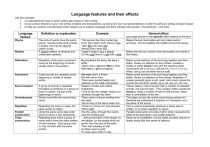 Language features and their effects Use this checklist: to understand the ways in which writers gain impact in their writing to use various features in your own writing (creative and transactional, as well as for your oral presentations) in order to craft your writing and gain impact to help you achieve unit standards which require you to explore language and think critically about poetic / transactional / oral texts Language feature Rhyme Definition or explanation Example The ends of words have the same sound. Usually at the ends of lines in poetry, but may be internal (within a line). A regular pattern of stressed and unstressed syllables. That second day they hunted me From hill to plain, from shore to sea. Then Billy who was silly Almost every other day… I went to town to buy a phone. On the road there’s a girl with a bike. Alliteration Repetition of the same consonant sound at the beginning of words – usually close in succession. Having heard the song, he sang it softly. There came a ghost to Mary’s door With many a grievous groan. Assonance Vowel sounds are repeated at the beginning or middle of nearby words. Sound clusters A group of sounds is repeated throughout a sentence or a group of lines in a poem, not just at the beginnings of words. Words sound like the sounds they name. Her early leaf’s a flower But only so an hour. There were excited bursts and swerves as the cattle stampeded. Season of mists and mellow fruitfulness… I love to see the cottage smoke curl upwards through the trees. There came a furious woofing from the seals. The brrrring of the alarm woke him. “Come on, Come on!” she shouted. “We’re late!” Into the valley, through the marsh, rode the hunting pair. …that government of the people, by the people, for the people shall not perish from the face of the earth. Then leaf subsides to leaf, So Eden sank to grief, So dawn goes down to day… Rhythm Onomatopoeia Repetition Parallel construction Triple construction Repeating the same or nearly the same words for effect. Using the same word class order twice (in same or two sentences) Repeating three times a group of words which have the same pattern of word classes. Each group may or may not start with the same word/s. General effect (you must decide on the specific effect relative to the text) Makes the text memorable and can make poems amusing. Can tie together the middle and end of verses. Makes the text as a whole more memorable and makes it flow better. Makes small sections of the text hang together and flow better. Draws our attention to this phrase. Creates a harder or softer mood in line with the meaning (hard consonants are b d k p q t, soft are f h j l m n r s v w y z, while c and g can be either hard or soft) Makes small sections of the text hang together and flow better. Draws our attention to this phrase. Repetition of vowels generally gives a soft, quiet, calm mood unless the sounds are the short vowels, eg in cat, pet, pin, off, cup. These create a “wall of sound” with a number of repeated sounds, not just one type. They usually create a particular mood by using a number of hard or soft sounds, rather than a combination of the two. This helps us hear the actual sound being named and therefore we understand it properly or it transports us to the place of the sound. This is used to emphasize whatever is being said or written, or to mimic repetition in nature. Parallel construction provides rhythm while it expands the detail of the description and creates balance. Same as for parallelism, but the triplet provides closure or finality along with that sense of balance. Language feature Definition or explanation Simile An image which compares two things using like or as Metaphor An image which compares two things without using like or as Personification An image which gives human qualities to non-human things. Choice of words (vocabulary) Using more unusual or specialized or technical words Use of slang Most likely used in direct speech. Use of direct or indirect speech Quoting or reporting spoken words. Use of incorrect grammar Generally used in direct speech but may also be used in autobiography for particular effect. Word play involving the use of a word with two different meanings or two words that sound the same but mean different things. Often used in advertising. Pun Example The black smoke rose like a wizard’s tower spiralling into the sky. The playground was as empty as a ghost town. We emerged from the cool dark of the hut into the blast furnace heat of a Central Otago summer afternoon. The fireworks were sparkling flowers exploding in the night sky. The night hung out a multitude of lanterns to guide the travellers. Raindrops danced on the pavement. The wind moaned, a low-pitched, unutterably eerie threnody (sad song). He died of a myocardial infarction. “Hey, you guys, let’s cut loose tonight and paint the town red.” “Come over here!” Jack yelled, then proceeded to tell us all how he’d won the Melbourne Cup pool in his office. “Let’s have ourselves a few beers.” “I sure do hate them direct marketers always calling at dinner time.” An advert for an omega-3 margarine has this statement: The way to a man’s heart is through his stomach. This gives new literal meaning to an old figurative phrase which involved romance rather than health. Effect (you must decide on the specific effect relative to the text) All imagery gives the person/animal/thing being described the characteristics of something else. It therefore enlivens descriptions by helping us to see these people/animals/things in a new light – in a way we may have never seen them or thought about them before. Metaphors are more compact and tighter in their comparative description than similes. In addition to the above, personification makes inanimate objects seem lively and lifelike while it also contributes to our sense of oneness with these inanimate objects. Sometimes, more unusual words pr