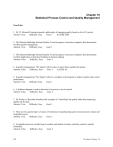 Chapter 19 Statistical Process Control and Quality Management True/False 1. Dr. W. Edwards Deming proposed a philosophy of managing quality based on list of 14 points. Answer: True Difficulty: Easy Goal: 1 AACSB: REF 2. The Malcolm Baldridge National Quality Award recognizes American companies that demonstrate excellent quality management. Answer: True Difficulty: Easy Goal: 1 3. The Malcolm Baldridge National Quality Award recognizes American companies that demonstrate excellent application of statistical methods in decision making. Answer: False Difficulty: Easy Goal: 1 4. In quality management, "Six Sigma" refers to plus or minus three standard deviations. Answer: False Difficulty: Easy Goal: 1 AACSB: AS 5. In quality management, "Six Sigma" refers to a company-wide program to improve quality and overall performance. Answer: True Difficulty: Easy Goal: 1 6. A fishbone diagram is used to determine if a process is out of control Answer: False Difficulty: Easy Goal: 4 7. Dr. Walter A. Shewhart introduced the concepts of "controlling" the quality rather than inspecting quality into the part. Answer: True Difficulty: Easy Goal: 1 8. There are two general types of causes of variations in manufacturing and service processes: chance and assignable causes. Answer: True Difficulty: Easy Goal: 2 9. Assignable causes are usually large in number and random in nature, and they cannot be entirely eliminated. Answer: False Difficulty: Easy Goal: 2 320 Test Bank, Chapter 19 10. Chance causes of variation are usually few in number and not random in nature, and they can be readily identified, and reduced or eliminated. Answer: False Difficulty: Easy Goal: 2 11. Assignable causes can generally be corrected easily, while chance causes cannot usually be corrected or stabilized economically. Answer: True Difficulty: Easy Goal: 2 AACSB: AS 12. The purpose of a statistical quality control chart is to identify when assignable causes of variation have entered the production system so that the cause may be identified and corrected. Answer: True Difficulty: Easy Goal: 2 AACSB: AS 13. Pareto charts can be used to identify and diagnose chance causes of variation in a manufacturing or service process. Answer: False Difficulty: Easy Goal: 2 14. Pareto charts can be used to identify and diagnose assignable causes of variation in a manufacturing or service process. Answer: True Difficulty: Easy Goal: 2 15. Pareto charts are based on the 80-20 rule, which says, 80% of the problem is caused by 20% of the factors. Answer: True Difficulty: Easy Goal: 2 AACSB: AS 16. Pareto charts are based on the 80-20 rule, which says, 80% of the factors cause 20% of the problem. Answer: False Difficulty: Easy Goal: 2 17. Quality control charts indicate whether a production process is in control or out of control. Answer: True Difficulty: Easy Goal: 2 AACSB: AS 18. Control charts can be developed for both variables and attributes. Answer: True Difficulty: Easy Goal: 2 19. Mean charts are designed to determine whether a process is in or out of control based on sample means. Answer: True Difficulty: Easy Goal: 5 Statistical Techniques in Business & Economics, Lind/Marchal/Wathen, 13/e 321 20. Summing the means of the samples and dividing that sum by the number of sample means can compute the mean of an X bar chart. Answer: True Difficulty: Easy Goal: 5 21. The purpose of a mean chart is to portray the fluctuations in the sample means. Answer: True Difficulty: Easy Goal: 5 22. The upper control limit (UCL) and the lower control limit (LCL) of a chart report the limits of the variation expected by chance. Answer: True Difficulty: Medium Goal: 5 AACSB: AS 23. Mean charts use sample ranges to determine if the process is in or out of control. Answer: False Difficulty: Easy Goal: 5 24. For a range chart with control limits set at ± 3ó, about 997 sample ranges out of 1,000 will fall between the upper and lower control limits. Answer: True Difficulty: Medium Goal: 5 25. A range chart shows variation in the ranges of the samples. Answer: True Difficulty: Easy Goal: 5 AACSB: REF 26. If one sample range should fall outside the control limits, it is very likely that some assignable cause affected the production. Answer: True Difficulty: Easy Goal: 5 27. If one sample range should fall outside the control limits, it is very unlikely that some chance event affected the production. Answer: True Difficulty: Easy Goal: 5 28. Percent defective charts, which are also known as P charts or p bar charts, show the percent of the production that is or is not acceptable. Answer: True Difficulty: Easy Goal: 6 29. A c bar chart shows the percent of the production that is defective. Answer: False Difficulty: Easy Goal: 6 322 Test Bank, Chapter 19 30. The following are examples of attributes: A weld has a crack in it or it doesn't; a relay works or it doesn't; a radiator leaks or it doesn't; the lock on a car door works or it doesn't; a tire fits on the rim or it doesn't. Answer: True Difficulty: Easy Goal: 2 31. The following are examples of attributes: the width of a cracked weld, the length of time that a relay works; the amount of water in a radiator, the diameter of a tire. Answer: False Difficulty: Easy Goal: 2 32. The following are examples of variables: the width of a cracked weld, the length of time that a relay works; the amount of water in a radiator, the diameter of a tire. Answer: True Difficulty: Easy Goal: 6 33. The purpose of a c bar chart is to show how many defects appear in a unit of production. Answer: True Difficulty: Easy Goal: 6 AACSB: AS 34. A value of 4.0 is recorded on the centerline of a c bar chart. This indicates that the lowest number of defects per unit is 4.0. Answer: False Difficulty: Easy Goal: 6 35. Chance causes of variation cannot be entirely eliminated. Answer: True Difficulty: Easy Goal: 2 36. In acceptance sampling, usually 100% of the incoming lot is checked. Answer: False Difficulty: Easy Goal: 7 37. In acceptance sampling, i