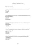 Chapter 011 Information Systems Multiple Choice Questions 1. Promoting, selling, and distributing the organization's goods and services is related to A. Marketing. B. Production. C. Accounting. D. Research. 2. Creating finished goods and services using raw materials and personnel pertains to which of the following departments? A. Marketing B. Research C. Production D. Human resources 3. Who among the following need detailed, very current, day-to-day information on units? A. Supervisory B. Middle-managerial C. Stockholder D. Top-managerial 4. This level of management uses information summarized to plan the future growth and direction of the organization. A. Top management B. Middle management C. Supervisors D. Stockholders 5. This level of management is involved with tactical planning within an organization. A. Top management B. Middle management C. Supervisors D. Stockholders 11-1 Chapter 011 Information Systems 6. _____ system helps supervisors by generating databases that act as the foundation for the other information systems. A. Decision support B. Management information C. Transaction processing D. Executive support 7. Which of the following refers to a system that summarizes the detailed data of the transaction processing systems in standard reports for middle-level managers? A. Data processing system (DPS) B. Management information system (MIS) C. Decision support system (DSS) D. Executive support system (ESS) 8. Management Information Systems are used by A. employee-level workers. B. supervisor-level management. C. middle management. D. top-level management. 9. Which among the following presents information in the most highly summarized form? A. Transaction processing system (TPS) B. Management information system (MIS) C. Decision support system (DSS) D. Executive support system (ESS) 10. A transaction processing system is also sometimes referred to as a A. sales order processing. B. data processing system. C. management information system. D. database management. 11-2 Chapter 011 Information Systems 11. The _____ activity records the customer requests for goods or services. A. payroll B. sales order processing C. inventory D. accounts receivable 12. Money collected from or owed by customers is called A. accounts payable. B. inventory. C. accounts receivable. D. sales order processing. 13. The _____ keeps records of the number of each kind of part or finished good in the warehouse. A. payroll B. inventory control system C. sales order processing D. general ledger 14. _____ show the difference between the income and expenses of the company for a specific time period. A. Income statements B. Balance sheets C. Accounts payable D. Inventory 15. Assets, liabilities, and the equity owned by the owners of an organization is all recorded in the A. balance sheet. B. accounts payable. C. income statement. D. payroll. 11-3 Chapter 011 Information Systems 16. Regional managers can compare their sales reports with that of the others by using A. management reports. B. periodic reports. C. exception reports. D. demand reports. 17. A sales report that shows that certain items are selling significantly above or below marketing department forecasts is an example of this type of report. A. Periodic B. Demand C. Inventory D. Exception 18. This report is used to analyze data and its reports do not have a fixed format. A. Management information system B. Decision support system C. Transaction processing system D. Executive support system 19. In a GDSS, the _____ is generally a decision-maker. A. programmer B. technician C. user D. client 20. This typically consists of transactions from the transaction processing system. A. System software B. External data C. Decision model D. Internal data 11-4 Chapter 011 Information Systems 21. This decision model controls the work of the organization, such as financial planning and sales promotion planning. A. Strategic model B. Corporate model C. Tactical model D. Operational model 22. These systems often can be organized to retrieve information from databases outside the company. A. Transaction processing system (TPS) B. Decision support system (DSS) C. Management information system (MIS) D. Executive support system (ESS) 23. _____ are used in managing documents, communication and scheduling. A. Office automation systems B. Transaction processing systems C. Knowledge work systems D. Executive support systems 24. Project resources can be scheduled, planned and controlled using A. project manager programs. B. operational manager programs. C. knowledge work systems. D. CAD/CAM systems. 25. CAD/CAM would be most useful in what industry? A. Motion picture B. Automobile manufacturing C. Food service D. Retail 11-5 Chapter 011 Information Systems True / False Questions 26. The marketing department identifies, investigates, and develops new products and services. True False 27. Research department identifies, investigates, and develops new products and services. True False 28. The production department strictly involves itself only with the creation and finish of goods that are tangible. True False 29. Supervisors responsibilities include operational matters. True False 30. Middle-level managers are responsible for the planning and the implementation of longterm goals. True False 31. Top-level managers need information both from within the organization and from outside. True False 32. The management information system records day-to-day transactions, such as customer orders, bills, inventory levels, and production output. True False 11-6 Chapter 011 Information Systems 33. The executive support system can analyze the effects of events and trends outside the organization. True False 34. The executive support system helps top-level managers oversee the company's operations and develop strategic plans. True False 35. Accounts payable refers to money the company owes its suppliers for materials and services it has received. True False 36. A purchase order form pertains to th