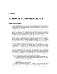 Chapter 3 RATIONAL CONSUMER CHOICE Boiling Down Chapter 3 This chapter gets down to the nitty-gritty of decision making. The process of choosing among alternatives requires, first, a clear understanding of the market baskets available to you and the prices that apply. Second, it requires that you decide which of two alternative goods you prefer. The first requirement can be depicted graphically with a budget line. Each intercept of the line shows how much of a good could be purchased if all of one's income was spent on that commodity. The straight line connecting the two intercepts illustrates that the tradeoff rate between goods is constant, a fact that is true if each consumer is a price taker in the market and can buy all she can afford at the constant market price. This graphical model can be shown algebraically if it is recognized that all income must go to only two commodities in a two-dimensional two-goods model. All of income (M) will be spent on good X and good Y. The amount spent on each will be the price of the good times the quantity of the good purchased. Therefore M = PxX + PyY where Px and Py are the prices of goods X and Y, which then are multiplied times the quantities of X and Y that are purchased. Simple algebraic manipulation of the equation shown above leads to the equation that represents the budget line: Y = M/Py- (Px/Py) X When the income level and the prices of the two goods are known, then the combinations of X and Y that are available with that income are determined. Experimenting on a graph with various income levels and prices, varying one at a time, will illustrate how these changes alter the set of possible market baskets available to the consumer. Increasing M in the equation above will increase the X and Y intercepts but not affect the slope of the line. Therefore an income increase is shown by a parallel rightward shift of the budget constraint. A student should observe the change in slope and location of the budget line equation shown above as income and commodity prices are varied one by one. Graphing each change will help you see how the market baskets available to the consumer are affected by income and price changes. Next is the task of representing the preferences of the consumer. It is assumed that 1. consumers can decide between alternative market baskets with even very small changes in composition (completeness). 2. if a consumer prefers A over B and B over C, he also will prefer A over C (transitivity). 3. consumers want more rather than less. If all these assumptions apply, then it is possible to construct in a space of all possible market baskets a set of points that are equally preferred because they result in the same level of pleasure, or utility, as it is usually called. All these points taken 2 CHAPTER 3: Rational Consumer Choice together are called an indifference curve, because the consumer does not care which of the alternatives he has. Any baskets to the northeast of an indifference curve will have higher utility since inevitably such a basket has more of at least one of the goods. The absolute slope of the indifference curve specifies at each point the rate at which the consumer is willing to give up good Y in exchange for more of good X without loss of pleasure. It is called the marginal rate of substitution of X for Y (MRS x for y). Indifference curves are usually curved in a manner convex to the origin in order to show that consumers gain less benefit from an additional unit of a good if they already have large quantities of the good (diminishing marginal utility). These indifference curves could be straight lines or even concave to the origin if more of a good does not diminish taste for the good, or if people are inclined to want more the more they have of a good. When the constraint line and the indifference curve are put on the same graph, showing all possible market baskets, the maximization process becomes one of trying to move out to the highest possible level of pleasure (indifference curve) without exceeding the constraint line, which is set by the income level of the consumer. This movement to the northeast must necessarily stop when the indifference curve becomes tangent to the budget line, because any further movement would give the consumer a market basket that she could not afford. Since the slope of the indifference curve equals the MRS x for y and the slope of the budget constraint equals the price ratio between Px and Py, it is easy to see that the following statement will be true when the consumer has maximized her utility: MRS x for y = the Px/Py. The basket for X and Y will be continuously juggled to fulfill this equilibrium condition which maximizes utility subject to the budget limitations. Where multiple goods are available, one good can be traded off against a composite of other goods, which is measured as the amount of income remaining after the commodity in question is paid for. In effect, the vertical axis of the graph measures the income remaining to spend on other goods when a specific amount of good X is consumed. The usefulness of these tools in understanding consumer choice and public policy outcomes is far greater than first meets the eye. In your text the food stamp case in Chapter 3 and demand analysis in Chapter 4 will illustrate this point. (Chapter 3 Appendix) The optimization process can also be developed by using a utility function statement. Using this method, which in your text is shown as the equation U(F,S) = FS, a set of indifference curves can be derived. The slope of the indifference curves is shown to equal the ratio of the marginal utilities of the two commodities in the consumer’s market basket. Equating the slope of the indifference curve (MU f/MUs) with the slope of the budget line (Pf/Ps) will show where a person maximizes welfare by consuming so that the last dollar spent on each item brings the same amount of utility (MUf/Pf = MUs/Ps). Indifference curve analysis requires a