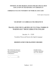 MINISTRY OF THE HIGHER AND SECONDARY SPECIALIZED EDUCATION OF THE REPUBLIC OF UZBEKISTAN UZBEKISTAN STATE UNIVERSITY OF WORLD LANGUAGES On the rights of manuscript YOLDOSHEV ULUGHBEK RAVSHANBEKOVICH TRANSLATION PECULARITIES OF CULTURAL WORDS IN “BABURNAMA” FROM UZBEK INTO ENGLISH Specialty: 5А – 120201 Translation Theory and Practice (the English Language) DISSERTATION FOR MASTER’S DEGREE The work has been discussed and recommended for defense The head of Department N.M.Kambarov Scientific adviser: Candidate of philology prof. O.M. Muminov __________________ _______________________ “____” _____________ 2013 . Tashkent – 2013 Contents Introduction…………………………………………………………………...3 Chapter I. The main theoretical problems of cultural words in literary translation………………………………………………………………….. ....6 1.1. The history of translation of “Boburnama” into English………………..6 1.2. Translation theory and principles of translation………………………..11 1.3. Cultural priorities of translation studies…………………………...........19 1.4. Translation and culture………………………………………………....28 1.5. The implication of culture on translation theory and practice………....42 Conclusion to Chapter I……………………………………………………..52 Chapter II. Translation of Cultural- lexical units in “Baburnoma” into English………………………………………………………………………...53 2.1. The categories of cultural words in Linguistics………………………......53 2.2. Translation of cultural words in “Baburnoma” into English …………….62 2.3. Comparative analysis of the translation of cultural lexical units in “Baburnoma” into English by different translators…………………………………………..67 Conclusion to Chapter II……………………………………………………75 Conclusion……………………………………………………………………77 List of used literature………………………………………………………..80 Appendix……………………………………………………………………...85 2 INTRODUCTION In this modern system of education learning foreign languages is not on the last place. Uzbekistan is in need of highly qualified specialists in the field of foreign languages. Uzbek Republic is integrating into the international world community in such spheres as economy, policy, diplomacy, education trade, technologies, art and science. I.Karimov says in his speech: “State sovereignty along with membership in the United Nations and other international organizations has given Uzbekistan an opportunity to conduct independent foreign policy, search for ways to join the international community and prioritize the goals of internationals relations.” 1 The qualification paper entitled “Translation pecularities of cultural words in “Boburnoma” from Uzbek into English”deals with the correspondences of a group of words or phrases, which lexically and culturally cause translation problems. Translation, involving the transposition of thoughts expressed in one language by one social group into the appropriate expression of another group, entails a process of cultural de-coding, re-coding and en- coding. As cultures are increasingly brought into greater contact another, multicultural considerations are brought to bear to ever-increasing degree. Multilateral approach to the language material analysis along with considering pragmatic meaning of language units enables us to interpret in a new way many phenomena that attracted the attention of linguists and translators. The actuality of the Work. We know that translation process isn't an easy one. That's why, when translating, we take into consideration three requirements: source text, target text and the reader. In this case we pay more attention to the reader. This work is a new one, because it was not done before. 1 Karimov I.А «There is no future without historical memory» Uzbekistan 1999, pp.149-150 3 A few general considerations govern the translation of all cultural words. First, your ultimate consideration should be recognition of the cultural achievements referred to in the SL text, and respect for all foreign countries and their cultures. Two translation procedures which are at opposite ends of the scale are normally available; transference, which, usually in literary texts, offers local color and atmosphere, and in specialist texts enables the readership (some of whom may be more or less familiar with the SL) to identify the referent particularly a name or a concept - in other texts (or conversations) without difficulty. The aim of the paper is to look through all relevant problems to translation, especially with a lingo-cultural approach to it. Cultural terms usually present fewer problems, and the considerations we are going to discuss also will hold good for their translation. Nevertheless, there are many problems. It is the translator's duty not to let words without their explanation. The tasks of the paper are the followings: 1) The history of translation of “Baburnama” into English 2) Translation theory and principles of translation 3) Cultural priorities of translation studies 4) Translation and culture 5) The implication of culture on translation theory and practice 6) The categories of cultural words in Linguistics 7) Translation of cultural words in “Baburnoma” into English The novelty of the work. Translation pecularities of cultural words into English in Boburnoma has been studied for the first time in the linguistic literature. 4 It is for the first time translation of cultural words in Baburnama has been investigated from the point of view: the definition of the culture and its connection with translation; difference 