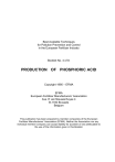 Best Available Techniques for Pollution Prevention and Control in the European Fertilizer Industry Booklet No. 4 of 8: PRODUCTION OF PHOSPHORIC ACID Copyright 1995 – EFMA EFMA European Fertilizer Manufacturers’ Association Ave. E van Nieuwenhuyse 4 B-1160 Brussels Belgium This publication has been prepared by member companies of the European Fertilizer Manufacturers’ Association (EFMA). Neither the Association nor any individual member company can accept liability for accident or loss attributable to the use of the information given in this Booklet. CONTENTS PREFACE 4 DEFINITIONS 6 1. INTRODUCTION 7 2. DESCRIPTION OF PRODUCTION PROCESSES 2.1 Raw Materials for Phosphoric Acid Production 2.2 Principles of the Process 2.3 Production Processes 2.4 Emission Abatement 2.5 Gypsum Disposal 7 7 10 12 24 27 3. DESCRIPTION OF STORAGE AND TRANSFER EQUIPMENT 3.1 Raw Materials Storage 3.2 Phosphoric Acid Storage 28 28 29 4. ENVIRONMENTAL DATA 4.1 Input Requirements 4.2 Output Production 4.3 Emissions and Wastes 4.4 Environmental Hazards Associated with Emissions and Wastes 29 29 30 30 31 5. EMISSION MONITORING 5.1 Fluoride 5.2 Gypsum 5.3 Radioactivity 32 32 32 33 6. MAJOR HAZARDS 33 7. OCCUPATIONAL HEALTH & SAFETY 33 8. SUMMARY OF BAT EMISSION LEVELS 8.1 Achievable Emission Levels for New Plants 8.2 Achievable Emission Levels for Existing Plants 8.3 Cost of Pollution Control Measures 34 34 35 35 9. REFERENCES 35 GLOSSARY OF TERMS 36 APPENDIX 1 Emission Monitoring in Phosphoric Acid Plants 39 APPENDIX 2 General Product Information on Phosphoric Acid 42 PREFACE The European Fertilizer Manufacturers Association (EFMA) has prepared eight Booklets on Best Available Techniques (BAT) in response to the proposed EU Directive on integrated pollution prevention and control (IPPC Directive). The Booklets have been prepared by EFMA experts drawn from member companies. They cover the production processes of the following products: No. 1 No. 2 No. 3 No. 4 No. 5 No. 6 No. 7 No. 8 Ammonia Nitric Acid Sulphuric Acid Phosphoric Acid Urea and Urea Ammonium Nitrate (UAN) Ammonium Nitrate (AN) and Calcium Ammonium Nitrate (CAN) NPK Compound Fertilizers by the Nitrophosphate Route NPK Compound Fertilizers by the Mixed Acid Route The Booklets reflect industry perceptions of what techniques are generally considered to be feasible and present achievable emission levels associated with the manufacturing of the products listed above. The Booklets do not aim to create an exhaustive list of BAT but they highlight those most widely used and accepted. They have been prepared in order to share knowledge about BAT between the fertilizer manufacturers, as well as with the regulatory authorities. The Booklets use the same definition of BAT as that given in the proposed IPPC Directive (see below). BAT covers both the technology used and the management practices necessary to operate a plant efficiently and safely. The EFMA Booklets focus primarily on the technological processes, since good management is considered to be independent of the process route. The industry recognises, however, that good operational practices are vital for effective environmental management and that the principles of Responsible Care should be adhered to by all companies in the fertilizer business. The Booklets give two sets of BAT emission levels:– for existing production units where pollution prevention is usually obtained by revamps or end-of-pipe solutions – for new plants where pollution prevention is integrated in the process design. The emission levels refer to emissions during normal operations of typical sized plants. Other levels may be more appropriate for smaller or larger units and higher emissions may occur in start-up and shut-down operations and in emergencies. Only the more significant types of emissions are covered and the emission levels given in the Booklets do not include fugitive emissions and emissions due to rainwater. Furthermore, the Booklets do not cover noise, heat emissions and visual impacts. The emission levels are given both in concentration values (ppm, mg/m3 or mg/l) and in load values (emission per tonne of product). It should be noted that there is not necessarily a direct link between the concentration values and the load values. EFMA recommends that the given emission levels should be used as reference levels for the establishment of regulatory authorisations. Deviations should be allowed as governed by: – local environmental requirements, given that the global and inter-regional environments are not adversely affected – practicalities and costs of achieving BAT – production constraints given by product range, energy source and availability of raw materials. If authorisation is given to exceed these BAT emission levels, the reasons for the deviation should be documented locally. Existing plants should be given ample time to comply with BAT emission levels and care should be taken to reflect the technological differences between new and existing plants when issuing regulatory authorisations, as discussed in these BAT Booklets. A wide variety of methods exist for monitoring emissions. The Booklets provide examples of methods currently available. The emission levels given in the Booklets are subject to some variance, depending on the method chosen and the precision of the analysis. It is important when issuing regulatory authorisations, to identify the monitoring method(s) to be applied. Differences in national practices may give rise to differing results as the methods are not internationally standardised. The given emission levels should not, therefore, be considered as absolute but as references which are independent of the methods used. EFMA would also advocate a further development for the authorisation of fertilizer plants. The plants can be complex, with the integration of several production processes and they can be located close to other industries. Thus there should be a shift away from authorisation g