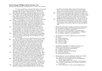 Prose Passage Multiple Choice Practice Test Read the following passage carefully before you choose your answers. (5) (10) (15) (20) (25) (30) (35) (40) (45) Yet even if we had been convinced of the honesty of our guardians, we would still have clung to that beneficent image of our grandfather that the family myth proposed to us. We were too poor, spiritually speaking, to question his generosity, to ask why he allowed us to live in oppressed chill and deprivation at a long arm’s length from himself and hooded his genial blue eye with a bluff, millionarish gray eyebrow whenever the evidence of our suffering presented itself at his knee. The official answer we knew: our benefactors were too old to put up with four wild young children; our grandfather was preoccupied with business matters and with his rheumatism, to which he devoted himself as though to a pious duty, taking it with him on pilgrimages to Ste. Anne de Beaupré and Miami, offering it with impartial reverence to the miracle of the Northern Mother and the Southern sun. This rheumatism hallowed my grandfather with the mark of a special vocation; he lived with it in the manner of an artist or a grizzled Galahad; it set him apart from all of us and even from my grandmother, who, lacking such an affliction, led a relatively unjustified existence and showed, in relation to us children, a sharper and more bellicose spirit. She felt, in spite of everything, that she was open to criticism, and, transposing this feeling with a practiced old hand, kept peering into our characters for symptoms of ingratitude. We, as a matter of fact, were grateful to the point of servility. We made no demands, we had no hopes. We were content if we were permitted to enjoy the refracted rays of that solar prosperity and come sometimes in the summer afternoon to sit on the shady porch or idle through a winter morning on the wicker furniture of the sun parlor, to stare at the player piano in the music room and smell the odor of whiskey in the mahogany cabinet in the library, or to climb about the dark living room examining the glassed-in paintings in their huge gilt frames, the fruits of European travel; dusky women carrying baskets to market, views of Venetian canals, and Tuscan harvest scenes – secular themes that, to the Irish-American mind, had become tinged with Catholic feeling by a regional infusion from the Pope. We asked no more from this house than the pride of being connected with it, and this was fortunate for us, since my grandmother, a great adherent of the give-them-an-inch-and-they’ll-take-a-yard theory of hospitality, never, so far as I can remember, offered any caller the slightest refreshment, regarding her own conversation as sufficiently wholesome and sustaining. An ugly, severe old woman with a monstrous balcony of a bosom, she officiated over certain set topics in a colorless singsong, like a priest intoning a Mass, topics to which repetition had lent a senseless solemnity: her audience with the Holy father; how my own father (50) (55) had broken with family tradition and voted the Democratic ticket; a visit to Lourdes; the Sacred Stairs in Rome, bloodstained since the first Good Friday, which she had climbed on her knees; my crooked little fingers and how they meant I was a liar; a miracle-working bone; the importance of regular bowel movements; the wickedness of Protestants; the conversion of my mother to Catholicism; and the assertion that my Protestant grandmother must certainly dye her hair. The most trivial reminiscences (my aunt’s having hysterics in a haystack) received from her delivery and from the piety of the context a strongly monitory flavor; they inspired fear and guilt, and one searched uncomfortably for the moral in them as in a dark and riddling fable. 1. Which of the following best indicates the subject of the passage? (A) The quality of upper class Irish-American domestic life (B) The piety of the speaker’s grandparents (C) The moral power of Christianity in American families (D) The speaker’s indictment of the grandparents’ selfishness (E) The speaker’s attack on a materialist society 2. The spiritual poverty of the children (lines 3-4) is most likely the result of (A) religious skepticism (B) emotional deprivation (C) hopeless servility (D) excessive wildness (E) excessive wealth 3. The attitude of the speaker as an adult, in contrast to the attitude of the child observer, is best described as (A) moderately tolerant and understanding (B) nostalgic and sentimental (C) cheerfully vindictive and unforgiving (D) remorseful and guilty (E) mean-spirited and sinister 4. The grandparents’ home and furnishings signify to the children (A) elegant taste that they should strive to emulate (B) a pleasure-loving, indulgent side of their grandparents that the children seldom saw (C) evidence that God allows his faithful servants to prosper (D) a world to be approached, even cautiously sampled, but not possessed (E) all that will be theirs as soon as their grandparents die 5. Which of the following best describes the grandfather? (A) Cruel (B) Conservative (C) Deceitful (D) Long-suffering (E) Self-absorbed 10. The passage presents an ironic juxtaposition of (A) the grandfather and the grandmother (B) virtue and youth (C) innocence and egotism (D) wealth and poverty (E) Catholicism and Protestantism 6. The chief effect of such contrasts as “business matters and . . . rheumatism” (lines 10-11) and “Ste. Anne De Beaupré and Miami” (lines 12-13) is to (A) intensify the speaker’s sense of the ridiculous (B) reveal the speaker’s ambivalent attitude (C) emphasize the cynicism of the grandparents (D) reduce the grandparents to the level of low comic characters (E) glamorize the grandparents as worldly sophisticates 11. Which of the following best sums up the contrast between the attitude of the adult speaker and the attitude of the the observing child? (A) Accusatory. .awed (B) Romantic..realistic (C) Religi