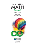 BIG IDEAS M AT H Course 1 FLORIDA EDITION Ron Larson Laurie Boswell ® Erie, Pennsylvania BigIdeasLearning.com ® 1 Numerical Expressions and Factors 1.1 Whole Number Operations 1.2 Powers and Exponents 1.3 Order of Operations 1.4 Prime Factorization 1.5 Greatest Common Factor 1.6 Least Common Multiple 1.6 3 say that x u o Y : ir S r “Dea x-cubed.” is called 2 say that x “And you quared.” x-s is called “My sign on adding frac tions with unlike denominators is keeping the hyenas away.” “Se “Se e,e,it’s it’swor workin king g.” .” 1 isn’t x “So, why ed?” in called x-l What You Learned Before (MAFS.4.OA.2.4) “Because 6 can have is composite, you 2 piles of 3 blocks, 3 piles of 2 blocks, or...” Example 1 Determine whether 26 is prime or composite. Because the factors of 26 are 1, 2, 13, and 26, it is composite. Example 2 Determine whether 37 is prime or composite. Because the only factors of 37 are 1 and 37, it is prime. Determine whether the number is prime or composite. 1. 5 2. 14 3. 17 4. 23 5. 28 6. 33 7. 43 8. 57 9. 64 (MAFS.4.NF.2.3c) 3 5 1 5 3 5 1 5 Find 2 — + 4 —. Example 3 ⋅ 2 5+3 5 13 21 =—+— 5 5 13 + 21 =— 5 34 4 = —, or 6 — 5 5 ⋅ 4 5+1 5 2— + 4— = — + — Rewrite the mixed numbers as improper fractions. Simplify. Add the numerators. Simplify. Add or subtract. 1 9 7 9 10. 4 — + 2 — 8 13 2 13 13. 5 — − 1— 1 11 6 11 11. 6 — + 3 — 1 4 3 4 14. 7 — − 3 — 7 8 3 8 1 6 5 6 12. 3 — + 4 — 15. 4 — − 2 — 1.1 Whole Number Operations How do you know which operation to choose when solving a real-life problem? 1 ACTIVITY: Choosing an Operation Work with a partner. The double bar graph shows the history of a citywide cleanup day. City Cleanup Day Amount collected (pounds) 7000 6000 6390 Trash Recyclables 4970 5000 3975 4000 3000 2130 2000 1095 1000 183 0 2010 555 2011 732 2012 2013 Year FLORIDA DA STANDARDS ARDS Whole Numbers In this lesson, you will ● determine which operation to perform. ● divide multi-digit numbers. Learning Standard MAFS.6.NS.2.2 ● Copy each question below. ● Underline a key word or phrase that helps you know which operation to use to answer the question. State the operation. Why do you think the key word or phrase indicates the operation you chose? ● Write an expression you can use to answer the question. ● Find the value of your expression. a. What is the total amount of trash collected from 2010 to 2013? b. How many more pounds of recyclables were collected in 2013 than in 2010? c. How many times more recyclables were collected in 2012 than in 2010? d. The amount of trash collected in 2014 is estimated to be twice the amount collected in 2011. What is that amount? 2 Chapter 1 Numerical Expressions and Factors 2 ACTIVITY: Checking Answers Work with a partner. Math Practice a. Explain how you can use estimation to check the reasonableness of the value of your expression in Activity 1(a). Communicate Precisely b. Explain how you can use addition to check the value of your expression in Activity 1(b). What key words should you use so that your partner understands your explanation? c. Explain how you can use estimation to check the reasonableness of the value of your expression in Activity 1(c). d. Use mental math to check the value of your expression in Activity 1(d). Describe your strategy. 3 ACTIVITY: Using Estimation Work with a partner. Use the map. Explain how you found each answer. a. Which two lakes have a combined area of about 33,000 square miles? Lake Superior 31,698 mi2 b. Which lake covers an area about three times greater than the area of Lake Erie? c. Which lake covers an area that is about 16,000 square miles greater than the area of Lake Ontario? Lake Huron 23,011 mi2 Lake Ontario 7320 mi2 Lake Michigan 22,316 mi2 Lake Erie 9922 mi2 d. Estimate the total area covered by the Great Lakes. 4. IN YOUR OWN WORDS How do you know which operation to choose when solving a real-life problem? 5. In a magic square, the sum of the numbers in each row, column, and diagonal is the same and each number from 1 to 9 is used only once. Complete the magic square. Explain how you found the missing numbers. ? 9 2 ? 5 ? 8 ? ? Use what you learned about choosing operations to complete Exercises 8−11 on page 7. Section 1.1 Whole Number Operations 3 Lesson 1.1 Lesson Tutorials Recall the four basic operations: addition, subtraction, multiplication, and division. Operation Words Algebra the sum of a+b the difference of a−b Addition Subtraction Multiplication Division EXAMPLE 1 the product of the quotient of a×b a÷b ⋅ a b a — b b )‾ a Adding and Subtracting Whole Numbers The bar graph shows the attendance at a three-day art festival. a. What is the total attendance for the art festival? Art Festival Attendance You want to find the total attendance for the three days. In this case, the phrase total attendance indicates you need to find the sum of the daily attendances. Number of people 4500 3876 4000 3500 3000 3145 Line up the numbers by their place values, then add. 2570 2500 2570 3145 + 3876 9591 The total attendance is 9591 people. 2000 1500 b. What is the increase in attendance from Day 1 to Day 2? 1000 500 0 1 2 You want to find how many more people attended on Day 2 than on Day 1. In this case, the phrase how many more indicates you need to find the difference of the attendances on Day 2 and Day 1. 3 Day Line up the numbers by their place values, then subtract. The increase in attendance from Day 1 to Day 2 is 575 people. EXAMPLE 2 In Example 2, you can use estimation to check the reasonableness of your answer. 12 × 95 ≈ 12 × 100 = 1200 Because 1200 ≈ 1140, the answer is reasonable. 3145 − 2570 575 Multiplying Whole Numbers You want to find the total number of chicken nuggets in 95 groups of 12 chicken nuggets. The phrase 95 groups of 12 indicates you need to find the product of 95 and 12. 12 × 95 60 108 1140 Multiply 12 by the ones digit, 5. Multiply 12 by the tens 