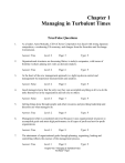 Chapter 1 Managing in Turbulent Times True/False Questions 1. As a leader, Anne Mulcahy, CEO of Xerox Corporation was faced with strong Japanese competitors, a weakening US economy, and charges from the Securities and Exchange Commission. Answer: True 2. Type: F Level: 2 Page: 6 Type: F Level: 3 Page: 7 Type: F Level: 2 Page: 8 Type: F Management often is considered universal because it uses organizational resources to accomplish goals and attain high performance in all types of profit and not-for-profit organizations Answer: True 7. Page: 6 Getting things done through people and other resources and providing leadership and direction are what managers do. Answer: True 6. Level: 2 Good managers know that the only way they can accomplish anything at all is to do the tasks themselves in the organization and not rely on others. Answer: False 5. Type: F At the heart of the new management approach is a tight top-down control and management by impersonal measurements and analysis. Answer: False 4. Page: 5 Organizational structures are becoming flatter, in today's companies, with teams of frontline workers playing new roles as decision-makers. Answer: True 3. Level: 2 Level: 1 Page: 8 Type: F The attainment of organizational goals through planning, organizing, leading and controlling reflects the essence of the management process. Answer: True Level: 1 Page: 8 Chapter One * Managing in Turbulent Times Test Bank * Page 1 Type: F 8. Controlling defines where the organization wants to be in the future and how to get there. Answer: False 9. Type: F Level: 2 Page: 9 Type: F Level: 2 Page: 9 Type: F Level: 1 Page: 10 Type: F Level: 2 Page: 10 Type: F Level: 2 Page: 10 Type: F To be goal directed means to achieve some outcome, such as making a profit. Answer: True 17. Page: 9 In a large company, given the focus on loss of retention, the ideal control mechanism is for the CEO to supervise all the managers personally. Answer: False 16. Level: 1 New trends towards empowerment and trust of employees have led many companies to place less emphasis on top-down control. Answer: True 15. Type: F Controlling involves monitoring employee’s activities and taking corrective action as necessary. Answer: True 14. Page: 8 Organizing means creating a shared culture and values. Answer: False 13. Level: 2 In today’s corporate America, to be an exceptional leader, one must be a well-known top manager. Answer: False 12. Type: F The use of influence to motivate employees to achieve the organization's goals refers to leading. Answer: True 11. Page: 8 Organizing means defining goals for future organizational performance and deciding on the tasks and resources needed to attain them. Answer: False 10. Level: 1 Level: 1 Page: 11 Type: F A social entity that is goal directed and deliberately structured is called an organization. Answer: True Level: 1 Page: 11 Chapter One * Managing in Turbulent Times Test Bank * Page 2 Type: F 18. Deliberately structured, in the definition of an organization, means being made up of two or more people and designed to achieve some outcomes. Answer: False 19. Type: A Level: 1 Page: 11 Type: F Level: 1 Page: 11 Type: F Level: 2 Page: 12 Type: F Level: 2 Page: 12 Type: F Level: 1 Page: 12 Type: F Technical skills are most important at lower organizational levels while human skills become more important as managers move up the organizational hierarchy. Answer: True 27. Page: 11 Human skills are the manager's ability to work with and through other people and to work effectively as a group member. Answer: True 26. Level: 2 Only the top managers in organizations need conceptual skills since it involves planning. Answer: False 25. Type: F Though the degree of each skill necessary at different levels of an organization may vary, to perform effectively, all managers must possess conceptual, human, and technical skills. Answer: True 24. Page: 11 Even if organizational performance is low, the ultimate responsibility of the manager is to make money. Answer: False 23. Level: 2 Efficiency can be calculated as the amount of resources used to produce a product or service. Answer: True 22. Type: F Since Eaton Corporation streamlined ordering and shipping and ultimately cut costs, they should be recognized for their significant increase in effectiveness. Answer: False 21. Page: 11 Efficiency refers to the degree to which the organization achieves a stated objective. Answer: False 20. Level: 2 Level: 2 Page: 13 Type: F Technical skills are utilized in the understanding and proficiency of general tasks. Answer: False Level: 1 Page: 13 Chapter One * Managing in Turbulent Times Test Bank * Page 3 Type: F 28. Middle managers are responsible for setting organizational goals, defining strategies for achieving them, and making decisions that affect the entire organization. Answer: False 29. Page: 16 Type: A Level: 2 Page: 16 Type: F Level: 2 Page: 17 Type: F Level: 2 Page: 17 Type: F Level: 2 Page: 17 Type: F Variety, fragmentation, and brevity characterize managerial activity. Answer: True 36. Level: 3 A general manager is responsible for a self-contained division. Answer: True 35. Type: A Staff managers are responsible for the manufacturing and marketing departments that make or sell the products or services. Answer: False 34. Page: 16 Often with staff managers assisting them in these decisions, first line managers are the managers who have the responsibility for making the significant strategic policy decisions. Answer: False 33. Level: 3 Given the significantly reduced importance of the middle manager’s jobs in today’s workplace, these levels have been eliminated in organizations. Answer: False 32. Type: F As a manager, Juan is generally concerned with the near future and is expected to establish good relationships with peers around the organization, encourage teamwork, and resolve conflicts. Juan can be described as a middle manager. Answer: True 31. Page: 15-16 Antonio is head of the advertising department at T