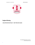 ENGLAND BOXING – CHILD PROTECTION ‘BEST PRACTICE GUIDE’ England Boxing CHILD PROTECTION POLICY – BEST PRACTICE GUIDE The England Boxing Equity Commission Reviewed September 2014 1 ENGLAND BOXING – CHILD PROTECTION ‘BEST PRACTICE GUIDE’ CHILD PROTECTION IN BOXING RECOMMENDED BEST PRACTICE & CODES OF CONDUCT This section has been adopted in the form recommended by the Child Protection in Sport Unit. It is the responsibility of adults and children to treat one another with dignity, respect, sensitivity and fairness. Discriminatory, offensive and violent behaviour are unacceptable within England Boxing and complaints will be acted upon. All should be encouraged to demonstrate exemplary behaviour in order to promote children’s welfare and reduce the likelihood of allegations being made. The following are common sense examples of how to create a positive culture and climate within boxing. BEST PRACTICE & CODES OF CONDUCT – COACHES & VOLUNTEERS 2 Always work in an open environment for example avoiding secretive or unobserved situations and encourage open communication; Always ensure that you do not spend excessive amounts of time alone with a child[ren] away from others; Always challenge injustice; Always treat Children and Young People equally, affording respect and dignity; Always put the welfare of each Child or Young Person first, before winning or achieving goals; Always recognise the developmental capacity of the child and do not push them against their will or train them excessively; Always maintain a safe and appropriate distance with athletes for example, it is not appropriate for adults to have an intimate relationship with a Child or Young Person or to share a room with them in cases of emergency where you must enter their room, always have another adult present leaving the room door open; Always seek to build balanced relationships based on mutual trust which empowers Children and Young People to share in the decision making process; Always make sport fun, enjoyable and promote fair play; Always ensure that if any form of manual physical support is required, it is provided openly and according to guidelines provided by the Coach Education Programme. Care is needed, as it is difficult to maintain hand positions when a Child or Young Person is constantly moving in training. Where physical contact is practiced in sport on a frequent basis [for instance gymnasium exercises] the parents should always be consulted and their agreement gained; Always keep up to date with technical skills, qualifications and insurance in sport; ENGLAND BOXING – CHILD PROTECTION ‘BEST PRACTICE GUIDE’ Always involve parents and carers wherever possible. For example, encouraging them to take responsibility for their children in the changing rooms. However even in those circumstances, never allow a single adult to enter alone; When supervising children and young people in changing rooms, always work in pairs and in these circumstances never supervise children and young people of the opposite gender; Always ensure that you have details of a child’s medical needs if any, whilst the child or young person is under your supervision [see Parental Consent Form]; Always remember that you are a ‘role model’ and never condone the use of any performance enhancing drugs; Always ensure that appropriate seat restraints are used when traveling with children and young people; Never invite a child or young person to your home without a parent , guardian or appropriate adult present; Always ensure that if mixed teams are taken away, they should always be accompanied by a male and female member of staff. However, remember that same gender abuse can also occur; Always ensure that at tournaments or residential events, adults do not invite children into their rooms; Always be an excellent role model, this includes not smoking or drinking alcohol or use foul or inappropriate language in the company of Children and Young People; Always give enthusiastic and constructive feedback rather than negative criticism; Always secure parental consent in writing to act in loco parentis, if the need arises to administer emergency first aid and or other medical treatment; Always keep a written record of any injury that occurs, along with the details of any treatment given; Always request written parental consent if club officials are required to transport young people in their cars, which should be done by at least two adults; At tournaments, dissent towards officials / results will not be tolerated; Coaches should at all times be respectful to officials – if legitimate complaint is justified it should be aired in a dignified manner away from public gaze and in the absence of athletes. Coach / Athlete Ratios The following are the recommended ratios For groups including children under 11 years of age : 1:8 For groups comprising of children over 10 years of age : 1 : 10 There must be at least 2 adults present at any one time for groups of 4 or more For mixed gender groups of any size, there must be at least one male and one female present 3 ENGLAND BOXING – CHILD PROTECTION ‘BEST PRACTICE GUIDE’ Practices never to be sanctioned The following should never be sanctioned. You should never: Engage in rough, physical or sexually provocative games, including horseplay with a Child or Young Person; Share a room with a Child or Young Person; Allow or engage in any form of inappropriate touching; Allow children to use inappropriate language unchallenged; Make sexually suggestive comments to a Child or Young Person, even in fun; Upset or reduce a Child or Young Person to tears as a form of control; Fail to act upon and record any allegations made by a Child or Young Person; Do things of a personal nature for Children, Young Persons whether disabled or not or whether an adult or not, that they can do for themselves; Note : It may sometimes be necessary for staff or volunteers to do things of a personal nature for a Child or