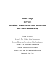 Robert Dongu HIST 605 Unit Plan- The Renaissance and Reformation 10th Grade World History Lesson Structure: Lesson 1- The Origins of the Renaissance Lesson 2- Ideas and Inventions of the Renaissance Lesson 3- The Protestant Reformation Lesson 4- Protestantism in England Lesson 5- War and the Catholic Reformation Lesson 6- Unit Test Lesson Plan 1- The Origins of the Renaissance I. Objectives Cognitive- Students will analyze primary sources and media to understand the causes of Renaissance. Affective- Students will make connections between the ideas of the Renaissance and modern life to better understand the social and political impact of the Renaissance. II. Standards Virginia Standards of Learning WHII.2 “The student will demonstrate an understanding of the political, cultural, geographic and economic conditions in the world about 1500 A.D. (C.E.) by”: b. Describing artistic, literary, and intellectual ideas of the Renaissance National Council for Social Studies Standards -Culture -People, Places and Environments -Individuals, Groups and Institutions -Power, Authority and Governance -Science, Technology and Society -Global Connections III. Resources and Materials -Laptop and projector for PowerPoint presentation and videos; paper for warm-up and post-PowerPoint activity IV. Learning Activities (45 min class period) 1. Students will complete warm-up activity (located in PowerPoint). Warm-up will be turned in. (5 min) Discussion questions during PowerPoint: -Opening Slide- What is depicted in these designs? What was needed during the Renaissance that inventions like this would be designed? -Slide 2- What is the modern day connection of these inventions? -Slide 3- What is depicted in the pictures? -Slide 4- Warm-up activity – Discussion of how inventions have our made our lives easier or more complicated. -Slide 5- What does Titian mean by “leaving the credit” for artists? -Slide 6- How did the location of Florence and Siena affect their relationship? -Slide 7- What is the meaning of “politically powerful?” -Slide 8- How did geography affect the need for Siena to develop a water system? -Slide 9- Who painted the Mona Lisa? Why is it significant today? -Slide 10- How did the rise of merchants result in more opportunity for artists and architects? 2. Teacher will lecture with 20 min PowerPoint; emphasis will be on: a. Past and present – how the Renaissance affected modern-day society b. The Renaissance and change- how the Renaissance brought new people to power, and how this affected the growth of cities and art c. Water and the Renaissance- how developments in water technology affected the growth of cities 3. Using the projector, teacher will go to http://www.pbs.org/empires/medici/medici/quiz.html Teacher will explain the directions of the exercise, which involves students taking a quiz on which famous Renaissance figure most resemble. Class will go to the computer lab to complete the activity. After the exercise, students will write whether they think the quiz was accurate. They will also write three facts about the person they most resemble (biographical info is on the same web site) and another historical figure of their choice. (20 min) 4. Students and teacher will return to classroom; students will turn in their work. Lesson Plan 2- Ideas and Inventions of the Renaissance I. Objectives Cognitive- Students will understand the impact of cultural and technological developments of the Renaissance, as well as its effect on communication. Affective- Students will examine this linkage to understand how the Renaissance advanced technology and the flow of information; this will be linked to the Reformation. II. Standards Virginia Standards of Learning WHII.3 “The student will demonstrate knowledge of the Reformation in terms of its impact on Western Civilization by: “Describing changing cultural values, traditions, and philosophies, and assessing the role of the printing press.” National Council for Social Studies Standards -Culture -People, Places and Environments -Individuals, Groups and Institutions -Power, Authority and Governance -Science, Technology and Society -Global Connections III. Resources and Materials -Laptop and projector for PowerPoint presentation and videos; paper for warm-up and post-PowerPoint activity IV. Learning Activities (45 min class period) 1. Students will complete warm-up activity (located in PowerPoint). Warm-up will be turned in. (5 min) 2. Teacher will lecture with 20 min PowerPoint; emphasis will be on: a. Connection between Renaissance inventions and its modern applications b. The artistic and cultural achievements of Leonardo Da Vinci and Filippo Brunelleschi c. The spread of the printing press and its affect on European society Discussion questions during PowerPoint: -Opening Slide- What are the inventions depicted? How are they important to us today? -Slide 2- Warm-up discussion: What books would you buy if you were Ralph Josselin? -Slide 3- Are there ‘Renaissance Men’ today? -Slide 4- Should Leonardo Da Vinci get credit for designs he drew but may not have invented? -Slide 5- Why have Da Vinci’s inventions persisted to this day? -Slide 6- How does Brunelleschi’s work compare with L.A. Memorial Memorial Coliseum? How has the arch been used in other ways in the U.S.? -Slide 7- Why did humanism become popular during the Renaissance? -Slide 8- Can you determine literacy rates from looking at the map of the printing press? Teacher will distribute print out from http://www.mce.k12tn.net/renaissance/inventions.htm. It is a list of Renaissance inventions. Students will choose two inventions and write about its personal impact and its impact on people during the Renaissance. (10 min) Teacher will distribute print out from http://www.learner.org/interactives/renaissance/printing.html. It further describes the role of the printing press during the Renaissance. Students will read the passage and write a paragraph about an invention they us