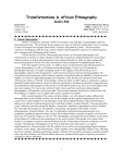 Transformations in African Ethnography SOAN 256 Spring 2013 T/Th 10:10-11:55 Leighton 402 Carleton College Pamela Feldman-Savelsberg Office: Leighton 233, x4113 Office Hours: T/Th 3:30-5:00, and by appointment uwuwuwuwuwuwuwuwuwuwuwuwuwuwuwuwuwuwuwuwuwuwuwuwuwuwu I. Course Description Africa is an immense continent of fifty-four countries and strikingly rich geographic, political, and cultural diversity. This diversity has developed over time, as Africans created many ways to respond to their environment and organize their beliefs, societies, and political systems. African societies continue to be dynamic, both as living, creative cultures and through their responses to colonial legacies and a changing and challenging global context. Transformations in African Ethnography pairs classics in Africanist anthropology with contemporary re-studies to explore changes in the types of questions anthropologists have posed about African societies as well as transformations in the societies themselves. Thus, we gain a unique and processual perspective on the role Africa has played in the development of anthropological theory. In the first segment of the course, we address issues of representation and self-presentation in written ethnographies as well as in African portrait photography. Using a set of Cameroonian photographic portraits, we explore changing modes of the staging of the self (choice given to photographic subjects) and representation of self and client (choices made by the photographer). We contextualize these processes within cultural, economic, and technological (availability of electricity and supplies; invention of digital photography) developments. Some themes and concepts include local Cameroonian idioms of “seeing” as knowledge, seeing into other-worldly realms as a dangerous capacity shared by healers and sorcerers, control of what one sees/doesn’t see/dares not describe or represent, and the relationship of photography to other modes of self-(re)presentation (e.g. the use of royal display cloth and royal insignia). We read works written by both African and Euro-American anthropologists, photographers, art historians, and a playwright. These include materials from Kenya, South Africa, and Mozambique in addition to an in-depth study of the Cameroon Grassfields. In the second segment of the course, initiation rituals, war, and migration place selfhood and belonging back in this-worldly contexts. We use the insights we have gained regarding the role of the visual and of visual metaphors in epistemological and representational debates within anthropology to address two Africanist anthropological classics and their restudies. Audrey Richards’ Chisungu describes a girls’ initiation ceremony among the Bemba, a monarchic, matrilineal, agricultural society in Zambia; her work adds the perspectives of symbolism, psychology, and gender to the toolkit of social anthropologists. Evans-Pritchard’s The Nuer is a hallmark of structural-functional analysis of an acephalous, patrilineal, pastoral society living in the southern Sudan, currently ravaged by civil war and the source of numerous refugees to the US. This ethnographic monograph has led to debates on the nature of the relation of worldviews and cosmologies to the social systems of the people who express them, society as an adaptive response to the environment, and the relationship of structure to function in social systems. Through later ethnographies of the Nuer in both film and written forms, we explore transformations in African societies after the colonial era as well as increasing anthropological attention to history, social change, and indeterminacy. Taken together, these ethnographies address issues affecting the entire continent, including colonialism, gender, relations between local communities and post-colonial states, the role of history, and African debates about war, human/cultural rights, migration, governance, witchcraft, religion, and desire. uwuwuwuwuwuwuwuwuwuwuwuwuwuwuwuwuwuwuwuwuwuwuwuwuwuwu 1 II. Course Requirements and Student Learning Outcomes A. Required Reading Readings should be completed before the class session for which they are assigned. Readings consist of book length ethnographic monographs (available in the bookstore), and scholarly articles. All articles are available on e-reserves (password SOAN). Required texts (available in the bookstore) are as follows: E.E. Evans-Pritchard (1940) The Nuer. Oxford: Oxford University Press. P. Geschiere (2009) The Perils of Belonging. Chicago: University of Chicago Press. S. Hutchinson (1996), Nuer Dilemmas: Coping with Money, War, and the State. Berkeley: U of California Press. A. Richards (1982 [1956]) Chisungu: A Girl’s Initiation Ceremony among the Bemba of Zambia. NY: Tavistock. D. Shandy (2007) Nuer-American Passages: Globalizing Sudanese Migration. Tallahassee: U Press of Florida. H. West (2006) Ethnographic Sorcery. Chicago: University of Chicago Press. B. Attendance and Participation (5%) This class combines lecture and discussion of readings, films or slides, and concepts. Attendance is important because your very presence adds something to class; frequent absences will lower your grade. More importantly, the way you are present and participating makes a difference in how both you and other members of this class learn. It is important that you have read and thought about the readings for the day. There are many ways of participating: questioning, commenting, listening carefully when other students ask questions or propose a new or different way to think about the materials we are studying, eye contact, nodding. We should all honor and encourage these different forms of participation in each other. I hope and expect that everyone will participate verbally by at least the second week of class. Please let me know before class, if possible, if and why you will be absent. Make friends with classmates to share notes in case of absences, or if you feel