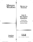 000i-00xiv_MTS_G11_U2_FM_Nat.indd 3 5/15/09 1:02:24 PM Grade 11 Unit 2 Meeting the Standards Care has been taken to verify the accuracy of information presented in this book. However, the authors, editors, and publisher cannot accept responsibility for Web, e-mail, newsgroup, or chat room subject matter or content, or for consequences from application of the information in this book, and make no warranty, expressed or implied, with respect to its content. Trademarks: Some of the product names and company names included in this book have been used for identification purposes only and may be trademarks or registered trade names of their respective manufacturers and sellers. The authors, editors, and publisher disclaim any affiliation, association, or connection with, or sponsorship or endorsement by, such owners. Cover Image Credits: Scene, Dennis Ackerson, 2007, Rocky Mountains, CO; liberty bell, © Tetra Images/Tetra Images/CORBIS 978-0-82193-196-7 © 2009 by EMC Publishing, LLC 875 Montreal Way St. Paul, MN 55102 E-mail: educate@emcp.com Web site: www.emcp.com All rights reserved. No part of this publication may be adapted, reproduced, stored in a retrieval system, or transmitted in any form or by any means, electronic, mechanical, photocopying, recording, or otherwise, without prior written permission from the publisher. Teachers using Mirrors & Windows: Connecting with Literature, American Tradition, may photocopy complete pages in sufficient quantities for classroom use only and not for resale. Printed in the United States of America 18 17 16 15 14 13 12 11 10 09 000i-00xiv_MTS_G11_U2_FM_Nat.indd 4 1 2 3 4 5 6 7 8 9 10 5/15/09 1:02:24 PM Publisher’s Note EMC Publishing’s innovative program Mirrors & Windows: Connecting with Literature presents a wide variety of rich, diverse, and timeless literature to help students reflect on their own experiences and connect with the world around them. One goal of this program is to ensure that all students reach their maximum potential and meet state standards. A key component of this program is a Meeting the Standards resource for each unit in the textbook. In every Meeting the Standards book, you will find a study guide to lead students through the unit, with a practice test formatted to match a standardized test. You will also find dozens of high-quality activities and quizzes for all the selections in the unit. EMC Publishing is confident that these materials will help you guide your students to mastery of the key literature and language arts skills and concepts measured in your standardized test. To address the needs of individual students, enrich learning, and simplify planning and assessment, you will find many more resources in our other program materials—including Differentiated Instruction, Exceeding the Standards, Program Planning and Assessment, and Technology Tools. We are pleased to offer these excellent materials to help students learn to appreciate and understand the wonderful world of literature. © EMC Publishing, LLC 000i-00xiv_MTS_G11_U2_FM_Nat.indd 5 Meeting the Standards American Tradition, Unit 2 v 5/15/09 1:02:24 PM 000i-00xiv_MTS_G11_U2_FM_Nat.indd 6 5/15/09 1:02:24 PM Contents Introduction x Correlation to Formative Survey Results xii New England Renaissance Study Guide (with Practice Test and Master Vocabulary List) 1 Thanatopsis, William Cullen Bryant Build Vocabulary: Latin Roots Analyze Literature: Theme Analyze Literature: Figurative Language Selection Quiz 19 20 21 22 Old Ironsides, Oliver Wendell Holmes Analyze Literature: Diction Analyze Literature: Purpose Selection Quiz 23 24 25 Stanzas on Freedom, James Russell Lowell Analyze Literature: Fireside Poet Analyze Literature: Poetry Critique Selection Quiz 26 27 28 The Tide Rises, the Tide Falls / A Psalm of Life, Henry Wadsworth Longfellow Analyze Literature: Sound Devices Analyze Literature: Allusion Analyze Literature: Rhythm and Rhyme Selection Quiz 29 30 31 32 from Snow-Bound, John Greenleaf Whittier Build Vocabulary: Synonyms and Antonyms Analyze Literature: Imagery and Setting Analyze Literature: Character Selection Quiz 33 34 35 36 Part 1: Fireside Poets Part 2: Transcendentalism from Nature / The Rhodora, Ralph Waldo Emerson Build Vocabulary: Word Analogies Analyze Literature: Metaphor Extend the Text: Write a Quotation Journal Analyze Literature: Imagery Selection Quiz 37 38 39 40 41 Concord Hymn, Ralph Waldo Emerson Build Background: Lexington and Concord Analyze Literature: Text-to-Text Connection Selection Quiz 42 43 44 © EMC Publishing, LLC 000i-00xiv_MTS_G11_U2_FM_Nat.indd 7 Meeting the Standards American Tradition, Unit 2 vii 5/15/09 1:02:24 PM from Walden, Henry David Thoreau / The Present, Annie Dillard Build Vocabulary: Root Words, Prefixes, and Suffixes Connecting with Literature: Walden Pond Ecology Analyze Literature: Setting Analyze Literature: Character Analyze Literature: The Essay Selection Quiz 45 46 47 48 49 50 from Civil Disobedience, Henry David Thoreau/ from Self-Reliance, Ralph Waldo Emerson Build Vocabulary: Denotation and Connotation Analyze Literature: Fact and Opinion Analyze Literature: Aphorism Analyze Literature: Text-to-Text Connection Selection Quiz 51 52 53 54 55 Letter to Sophia Ripley, Margaret Fuller Build Vocabulary: Latin Roots Analyze Literature: The Letter Form Selection Quiz 56 57 58 Part 3: American Gothic The Devil and Tom Walker, Washington Irving Build Vocabulary: Synonyms and Antonyms Analyze Literature: Tone Analyze Literature: Theme Selection Quiz 59 60 61 62 The Raven / Alone / Letter to John Allan, Edgar Allan Poe Build Vocabulary: Definitions Analyze Literature: Plot Analyze Literature: Sound Devices Analyze Literature: Text-to-Text Connection Selection Quiz 63 64 65 66 67 The Fall of the House of Usher, Edgar Allan Poe Build Vocabulary: Latin Roots Analyze Literature: Imagery Analyze Literature: Text-to-Text Connection Selection Quiz 68 69 70 71 Death of Edgar Allan Poe, H. A. Murena, Trans. Darwin 