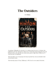 The Outsiders S. E. Hinton According to Wikipedia, The Outsiders is a coming-of-age novel by S. E. Hinton, first published in 1967 by Viking Press. Hinton was 15 when she started writing the novel, but did most of the work when she was sixteen and a junior in high school. Hinton was 18 when the book was published. The book follows two rival groups, the Greasers and the Socs who are divided by their socioeconomic status. The book takes place in Tulsa, Oklahoma, in 1965, but it is never stated in the book. Chapter Index Chapter 1............................................................................................................................. 3 Chapter 2........................................................................................................................... 18 Chapter 3........................................................................................................................... 33 Chapter 4........................................................................................................................... 47 Chapter 5........................................................................................................................... 59 Chapter 6........................................................................................................................... 73 Chapter 7........................................................................................................................... 85 Chapter 8......................................................................................................................... 101 Chapter 9......................................................................................................................... 112 Chapter 10....................................................................................................................... 128 Chapter 11....................................................................................................................... 138 Chapter 12....................................................................................................................... 143 The Outsiders, S.E. Hinton 2 Chapter 1 WHEN I STEPPED OUT into the bright sunlight from the darkness of the movie house, I had only two things on my mind: Paul Newman and a ride home. I was wishing I looked like Paul Newman--- he looks tough and I don't--- but I guess my own looks aren't so bad. I have light-brown, almost-red hair and greenish-gray eyes. I wish they were more gray, because I hate most guys that have green eyes, but I have to be content with what I have. My hair is longer than a lot of boys wear theirs, squared off in back and long at the front and sides, but I am a greaser and most of my neighborhood rarely bothers to get a haircut. Besides, I look better with long hair. I had a long walk home and no company, but I usually lone it anyway, for no reason except that I like to watch movies undisturbed so I can get into them and live them with the actors. When I see a movie with someone it's kind of uncomfortable, like having someone read your book over your shoulder. I'm different that way. I mean, my secondoldest brother, Soda, who is sixteen-going-on-seventeen, never cracks a book at all, and my oldest brother, Darrel, who we call Darry, works too long and hard to be interested in a story or drawing a picture, so I'm not like them. And nobody in our gang digs movies and books the way I do. For a while there, I thought I was the only person in the world that did. So I loned it. Soda tries to understand, at least, which is more than Darry does. But then, Soda is different from anybody; he understands everything, almost. Like he's never hollering at me all the time the way Darry is, or treating me as if I was six instead of fourteen. I love Soda more than I've ever loved anyone, even Mom and Dad. He's always happy-go-lucky and grinning, while Darry's hard and firm and rarely grins at all. But then, Darry's gone through a lot in his twenty years, grown up too fast. Sodapop'll never grow up at all. I don't know which way's the best. I'll find out one of these days. Anyway, I went on walking home, thinking about the movie, and then suddenly wishing I had some company. Greasers can't walk alone too much or they'll get jumped, The Outsiders, S.E. Hinton 3 or someone will come by and scream "Greaser!" at them, which doesn't make you feel too hot, if you know what I mean. We get jumped by the Socs. I'm not sure how you spell it, but it's the abbreviation for the Socials, the jet set, the West-side rich kids. It's like the term "greaser," which is used to class all us boys on the East Side. We're poorer than the Socs and the middle class. I reckon we're wilder, too. Not like the Socs, who jump greasers and wreck houses and throw beer blasts for kicks, and get editorials in the paper for being a public disgrace one day and an asset to society the next. Greasers are almost like hoods; we steal things and drive old souped-up cars and hold up gas stations and have a gang fight once in a while. I don't mean I do things like that. Darry would kill me if I got into trouble with the police. Since Mom and Dad were killed in an auto wreck, the three of us get to stay together only as long as we behave. So Soda and I stay out of trouble as much as we can, and we're careful not to get caught when we can't. I only mean that most greasers do things like that, just like we wear our hair long and dress in blue jeans and T-shirts, or leave our shirttails out and wear leather jackets and tennis shoes or boots. I'm not saying that either Socs orgreasers are better; that's just the way things are. I could have waited to go to the movies until Darry or Sodapop got off work. They would have gone with me, or driven me there, or walked along, although Soda just can't sit still long enough to enjoy a movie and they bore Darry to death. Darry thinks his life is enough without inspecting other people's