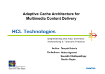 Adaptive Cache Architecture for Multimedia Content Delivery HCL Technologies Engineering and R&D ServicesNetworking & Telecom Practice Author: Deepak Kataria Co-Authors: Mukta Agarwal Saurabh Chattopadhyay Sachin Gupta Topics Introduction Data Traffic Analysis & Growth Content Service Providers Adaptive Cache Architecture – Addressing Content Delivery Challenges Summary References Content Delivery Trends in Service Providers Trend towards an across the board media-centric network that is targeted for anycontent at any-time over any-device type of service with robustness, security, convenience and highest quality of experience (QoE) Convergence of Telecom, IT, Internet and Media coupled with competitive pressures from non-traditional players forcing service providers to readjust their cost structures down to a new maximum efficiency of scale Rich digital media content ingest, movement and delivery coupled with asset management, DRM, and security causing fundamental shifts in network architectures from tiered centralized architectures to edge based distributed architectures Service providers looking at creative ways to monetize their investments Offering high margin, high value service bundling for top line growth Looking to reduce network cost (both CAPEX and OPEX) to shore up bottom line Targeting Ad-based revenue and revenue-sharing models with content owners Providing media management & distribution services for content owners & aggregators Leveraging location awareness capabilities and higher throughputs to provide rich media services LTE timelines are accelerating, fueled by the auction of the 700 MHz analog TV spectrum in the US and 2.6 GHz band (IMT extension) in Europe 3 Topics Introduction Data Traffic Analysis & Growth Content Service Providers Adaptive Cache Architecture – Addressing Content Delivery Challenges Summary References Mobile and Fixed Traffic Last m ile Fixed Access Mobile Voice & Data 1600 10,00 9,00 Mobile data takes off Mobile PC main driver 1400 Fixed traffic growth driven by Internet and IPTV 8,00 1200 7,00 1000 Exabytes Exabytes 6,00 5,00 4,00 800 600 3,00 400 2,00 200 1,00 0 0,00 2 006 2 007 2 008 2 009 Voice Web / Mobile PC 2 010 2 011 2 012 1 2 013 2006 TV/Streaming Other 2 2007 3 2008 4 2009 Fixed Voice 5 6 7 8 2010 2011 2012 Internet IPTV Fixed traffic ~100 times mobile traffic Both mobile and fixed networks traffic will grow over the next few years 2013 Traffic Trends According to Strategy Analytics, mobile phones - excluding wireless PC cards and other cellular enabled devices - will generate almost 2.2 Exabytes of data traffic; 84% will come from web browsing. This volume of data is equivalent to watching over 120,000 years of DVD quality video. Data Volumes per Subscriber & Different Access Methods FTTH access methods “pump” a lot of data into core networks Traffic Distribution Few snippets from ICT Traffic Statistics report, sourced from ITU-T ICT Newslog posted in Dec 2009 While developed regions will account for just 25% of the cellular user population by 2015, they will generate 65% of total global wireless network traffic”, according to Dr Mark Heath, the report’s co-author. “This is due to a higher proportion of advanced handsets and the earlier deployment of more advanced cellular technologies, such as LTE, which have higher throughput.” Historically, voice telephony has dominated wireless network traffic, and popular data services, such as SMS, consume a tiny amount of network resource. However, the take-up of USB modems and a broad range of data services on smart-phones will increase wireless network traffic. Average wireless network traffic per cellular user (for all voice and data services) in developed regions will increase to eight times its 2008 level by 2015, rising from 56MB per month to 455MB per month. While voice traffic will continue to increase, as a result of on-going fixed-mobile substitution, data traffic will rise at significantly faster and come to dominate wireless network traffic. By 2015, data will account for 94% of total wireless network traffic in developed regions. A number of uncertainties could result in traffic levels differing from our base-case forecasts. An upside forecast derived by Analysis Mason indicates that by 2015, traffic per customer in developed regions will grow to almost 30 times its level in 2008. Source: Paper from Continuous Computing, Published in October 8, 2009 Few users generate majority of traffic Topics Introduction Data Traffic Analysis & Growth Content Service Providers Adaptive Cache Architecture – Addressing Content Delivery Challenges Summary References Typical Telco Network Architecture for Video Example of Network used by Telcos Source: Cisco 9 Typical MSO Network Architecture Example of Network used by MSOs 10 Tiered Content Delivery Infrastructure Master Headends Content Aggregation IP Stream IP Stream IP Stream Regional Headends Regional Headend Regional Headend Local IP Distribution Local IP Distribution Local Headends Add Local Content & Advertising IP Stream Gigabit Ethernet IP Stream Gigabit Ethernet FTTH FTTH ADSL2+ ADSL2+ Example of Network used by CDNs 11 OnOn-Demand 3GPP MBMS Architecture for Mobile TV Example of Network used by Mobile Operators 12 DVB-H High Level Architecture Mobile TV Network Deployed in Europe 13 Terrestrial Broadcast Downlink Via MP2 Local Broadcasters Uplink Via MP2 Uplink Via MP2 National Broadcaster Acquisition, Encoders/ Decoders/ Editors RF Content Provider Studio Encoding Farm Acquisition, Encoders/ Decoders/ Editors Acquisition, Encoders/ Decoders/ Editors Fiber T1/ OC3 VYVX Cable Operator Fiber T1/ OC3 VYVX Example of Network used by Terrestrial Broadcasters 14 MP2 & MP4 Satellite Distribution Uplink Via MP2 Uplink Via MP2 National Broadcaster Content Provider Studio Encoding Farm Uplink & Downlink Via MP2 Acquisition, Encoders/ Decoders/ Editors Earth Station Acquisition, Encoders/ Decoders/ Editors Fiber T1/ OC3 VYVX Encoders