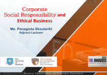 Corporate Social Responsibility and Ethical Business Ms. Panagiota Skoulariki Adjunct Lecturer Business Administration and Economics Department Welcome to The International Faculty of the University of Sheffield Business Administration and Economics Department CSR and Ethics Outline • Business and Societal Relationship • Society as the Macroenvironment • Factors in Society • Business Criticism and Corporate Response • Development of CSR and related notions • Stakeholders • Ethics • Technology and Ethics Search the Web Interested in socially responsible investing? Visit Good Money’s web site at: www.goodmoney.com/directry_codes.htm. Business Administration and Economics Department Business and Society Business The collection of private, commercially oriented organizations ranging in size from sole proprietorships to corporate giants. Society A community, a nation, or a broad group of people with common traditions, values, institutions, and collective activities and interests. Business and society interrelate in a macroenvironment as stakeholders. A macroenvironment is the complete societal context in which the organization resides. Business Administration and Economics Department 4 Segments of the Macro Environment Business Administration and Economics Department Macroenvironment-Pluralism A diffusion of power among a society’s many groups. Involves decentralization and diversity of power concentration. Strengths Prevents concentration of power. Maximizes freedom of expression and action. Weaknesses Pursuit of self-interest. Proliferates organizations and groups with overlapping goals. Disperses individual Forces conflicts to center allegiances. stage. Creates diversified set of Promotes inefficiency. loyalties. Provides checks and balances. Business Administration and Economics Department 6 Special Interest Groups • Make life more complex for business and government • Can number in the tens of thousands in some societies • Pursue their own focused agendas • Are active, intense, diverse and focused • Can attract a significant following • Often work at cross purposes, with no unified goals A special-interest society is pluralism taken to the extreme 7 Business Administration and Economics Department Business Criticism • Little concern for the consumer • Cares nothing about the deteriorating social order • Has no concept of ethical behavior • Indifferent to the problems of minorities and the environment What responsibility does business have to society? Business for Social Responsibility (BSR) is a consulting firm and global business network helping organizations to develop sustainable business strategies and solutions. Business Administration and Economics Department 8 Business Criticism Use and Abuse of Power Business Power •The ability or capacity to produce an effect or to bring influence to bear on a situation or people. Iron Law of Responsibility •In the long run, those who do not use power in a manner society considers responsible will tend to lose it. Business Administration and Economics Department 9 Levels and Spheres of Corporate Power Spheres Levels Macro Level Intermediate Level Micro Level Individual Level Economic Social/Cultural Individual Technological Environmental Political Business Administration and Economics Department 10 Society’s Expectations Versus Business’ Actual Social Performance Social Performance: Expected and Actual Society’s Expectations of Business Performance Social Problem Business’s Actual Social Performance Social Problem 1960s Time 2010s Business Administration and Economics Department 11 Factors in the Social Environment leading to societal expectations • Affluence and education • • Higher expectations of major institutions. Growing public awareness through television, film, and Internet. • Revolution of rising expectations • • • • Expectations vs. performance gap. Entitlement mentality Rights movement Victimization philosophy • Business scandals Business Administration and Economics Department 12 Social Environment, Business Criticism and Corporate Response Affluence Education Awareness Factors in the Social Environment Rising Expectations Rights Movement Victimization Philosophy Entitlement Mentality Business Criticism Increased Concern for the Societal Environment A Changed Social Contract Business Administration and Economics Department 13 Corporate Social Responsibility (CSR) Corporate Social Responsibility •Seriously considering the impact of a company’s actions on society. Requires the individual to consider his or her acts in terms of a whole social system, and holds him or her responsible for the effects of his or her acts anywhere in that system. Business Administration and Economics Department 14 Economic Model Historical Perspective on CSR Legal Model Social Model Stakeholder Model Business Administration and Economics Department 15 Modification of the Economic Model Philanthropy Community obligations Paternalism Motivation: Keep government at arm’s length Business Administration and Economics Department 16 CSR’s Acceptance and Broadening of Meaning • From the 1950s to the present, the concept of CSR has gained acceptance. • The meaning has been broadened to include specific issues, such as: • • • • • • • • Corporate governance Product safety Honesty in advertising Employee rights Affirmative action Environmental sustainability Ethical behavior Global CSR Business Administration and Economics Department 17 Evolving Meanings of CSR 1. Corporate social responsibility is seriously considering the impact of the company’s actions on society. 2. The obligation of decision makers to take actions that protect and improve the welfare of society as a whole, along with their own interests. 3. Supposes that the corporation has economic and legal obligations as well as responsibilities to society that extend beyond these obligations. Business Administrat
