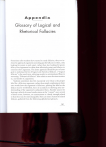 Appendix Glossary of Logical and Rhetorical Fallacies Sometimes after students have started to study fallacies, they are inclined to approach arguments searching just for fallacies in them, only looking for points to pick apart, rather than also looking for good, fallacy-free arguments or those that effectively point out fallacies in someone else's argument. The latter approach should be part of your goal in studying this list of logical and rhetorical fallacies. ("Logical fallacies" is the usual term, referring mainly to unintentional flaws in reasoning. "Rhetorical fallacies" here refers to more devious motives in, and modes of, argument.) Students sometimes also fret excessively over what is the proper label for a fallacious argument, rather than simply explaining in their own words how the argument is fallacious; pinning the label to the fallacy may be worthwhile, but it is secondary to showing your understanding of the argument's substantive flaws. Another source for fretting is which of several similar terms is the "correct" one; several of these terms, however, are synonymous or closely enough related so that they may be interchangeable. Here are some clusters of related fallacies, gathered from the following alphabetical glossary. 141 142 APPENDIX • Presenting only one side of a story, or slanting an account to one side: propaganda, special pleading, stacking the deck, halftruth, double standard, selective vision, cleans and dirties, tu quoque (in the sense of someone pointing out legitimately the fallacy in opponents who are guilty of the same fault of which they accuse others). • Oversimplification: overgeneralization, sweeping generalization, either-or thinking, false dilemma, false dichotomy, reductive fallacy, not accounting for all factors or variables. • Hasty conclusion or non sequitur: inadequate evidence, unrepresentative sample, argument from the exception. • Inconsistency: compartmentalized thinking, self-contradiction, doublethink, shifting ground, equivocation, "I Won't, but I Will," "Heads I Win, Tails You Lose." • Distraction: begging the question, evading the issue, shifting ground, red herring, irrelevance. • Personal attacks: ad hominem, name-calling, straw man, poisoning the well, smearing, character assassination, tu quoque, guilt by association, derision, distortion. • Appeals to widespread opinion or common practice: ad populum, bandwagon, plain folks, appeal to the past or resistance to change, common practice, two wrongs make a right. • Emotional appeal: appeals to pity or fear, demagogy, scare tactics, sentimentality, religiosity, flag-waving, jingoism. G L O S S A R Y OF L O G I C A L AND RHETORICAL FALLACIES ad hominem. Latin for argument "against the man." The rhetorical fallacy of attacking the character or motives of an opponent as a means_of discrediting^ or evading the sutjstance~of his~orlier arguments. Variants include name-calling, poisoning the well, smearing, and character assassination. adpopulum. Latin, appeal "to the people." The logical fallacy of arguing that ^something is true because many or most people believe it is, or thajtj_Dolicy__is vaEcTBecaui^many or most agree with it. The fallacy lies injj^fajcjjh_aljna^sjp^imonjs not always well informed, accurate, or morally just. When is it valid to cite majority opinion in the general population, or within any particular group, to support your position? When you can present evidence that the majority is well informed and has benefited from the policy you advocate. APPEND appeal to authority or transfer o takes three common forms. One i subject someone who is an authori aflisueTor even someone who is ( "welPEnown for being well-kno^ ad is the most frequent occasion citingthe opinion of a source wl sufficient in opinion is based. The opinions c subject are likely to be supported of nonexperts, but their evidence ! third form is when a genuine autl opinion diverges from the opinic erwise suspect. This might happt conflict of interest or holds an 01 from the consensus of other aut third form of the fallacy, you shi and present a case for why this aui others' if you think it should. appeal to fear or scare tactics. A ~plty,~tKj:nost common form_o£ nently in calls for war or, more n ism/ThisTFanother case where a to determine whether such an ap] it is a perfectly valid line of argui fabricated or exaggerated to frig! those in power,or to attract a pr appeal to the past or tradition logical fallacy of arguing for a pc lowed in the past or is a traditi( whether it might be outdated. appeal to pity. A common variety call here is whether the people t or whether the audience's heartst lently. For example, in law cour elicit the jury's pity for their cli pityin^jorneoneis not a good ji: she did or did not commit a cri sn argument from the converse. 1 a statement whosetruth has bee APPENDIX 143 appeal to authority or transfer of authority. This logical fallacy takes three common forms. One is citing as a source on a particular subject someone who is an authority onlomFsubjecFBut not the one at issueTor even someone who is only, in Daniel Boorstin's phrase, "welHsnown for being well-known." (The celebrity endorsement ad is the most frequent occasion for this form.) Another form is citing_the opinion of a source who is an authority on the issueas ' tEe evi"denceoriwhichthat _ opinion is based. The opinions of those who are authorities on a subject are likely to be supported with better evidence than those of nonexperts, but their evidence still needs to be documented. The th_ird_form is when a genuine_authority is cited, but t]K_audiority_'s opinion diverges from the opinions of other authorities or is otherwise suspect. This might happen when the cited authority has a conflict of interest or holds an opinion about an issue that differs from the consensus of other authorities in a field. To avoid this third form of the fallacy, you should acknowledge the difference ajidpresentj^asejOT^w