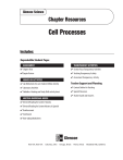 Glencoe Science Chapter Resources Cell Processes Includes: Reproducible Student Pages ASSESSMENT TRANSPARENCY ACTIVITIES ✔ Chapter Tests ✔ Section Focus Transparency Activities ✔Chapter Review ✔ Teaching Transparency Activity HANDS-ON ACTIVITIES ✔ Assessment Transparency Activity ✔ Lab Worksheets for each Student Edition Activity Teacher Support and Planning ✔ Laboratory Activities ✔ Content Outline for Teaching ✔ Foldables–Reading and Study Skills activity sheet ✔ Spanish Resources ✔ Teacher Guide and Answers MEETING INDIVIDUAL NEEDS ✔ Directed Reading for Content Mastery ✔ Directed Reading for Content Mastery in Spanish ✔ Reinforcement ✔ Enrichment ✔ Note-taking Worksheets Glencoe Science Photo Credits Section Focus Transparency 1: Doug Martin; Section Focus Transparency 2: Robert Lewellyn/SuperStock; Section Focus Transparency 3: Kenneth W. Fink/Photo Researchers Copyright © by The McGraw-Hill Companies, Inc. All rights reserved. Permission is granted to reproduce the material contained herein on the condition that such material be reproduced only for classroom use; be provided to students, teachers, and families without charge; and be used solely in conjunction with the Cell Processes program. Any other reproduction, for use or sale, is prohibited without prior written permission of the publisher. Send all inquiries to: Glencoe/McGraw-Hill 8787 Orion Place Columbus, OH 43240-4027 ISBN 0-07-867093-4 Printed in the United States of America. 1 2 3 4 5 6 7 8 9 10 024 09 08 07 06 05 04 Reproducible Student Pages Reproducible Student Pages ■ Hands-On Activities MiniLAB: Determining How Enzymes Work . . . . . . . . . . . . . . . . . . . . 3 MiniLAB: Try at Home Observing Diffusion . . . . . . . . . . . . . . . . . . . . 4 Lab: Observing Osmosis . . . . . . . . . . . . . . . . . . . . . . . . . . . . . . . . . . . . 5 Lab: Photosynthesis and Respiration . . . . . . . . . . . . . . . . . . . . . . . . . . . 7 Laboratory Activity 1: Diffusion. . . . . . . . . . . . . . . . . . . . . . . . . . . . . . 9 Laboratory Activity 2: Oxygen and Photosynthesis. . . . . . . . . . . . . . . 11 Foldables: Reading and Study Skills. . . . . . . . . . . . . . . . . . . . . . . . . . 15 ■ Meeting Individual Needs Extension and Intervention Directed Reading for Content Mastery . . . . . . . . . . . . . . . . . . . . . . . 17 Directed Reading for Content Mastery in Spanish . . . . . . . . . . . . . . 21 Reinforcement . . . . . . . . . . . . . . . . . . . . . . . . . . . . . . . . . . . . . . . . . . 25 Enrichment. . . . . . . . . . . . . . . . . . . . . . . . . . . . . . . . . . . . . . . . . . . . . 28 Note-taking Worksheet . . . . . . . . . . . . . . . . . . . . . . . . . . . . . . . . . . . 31 ■ Assessment Chapter Review . . . . . . . . . . . . . . . . . . . . . . . . . . . . . . . . . . . . . . . . . 35 Chapter Test . . . . . . . . . . . . . . . . . . . . . . . . . . . . . . . . . . . . . . . . . . . . 37 ■ Transparency Activities Section Focus Transparency Activities . . . . . . . . . . . . . . . . . . . . . . . . 42 Teaching Transparency Activity . . . . . . . . . . . . . . . . . . . . . . . . . . . . . 45 Assessment Transparency Activity . . . . . . . . . . . . . . . . . . . . . . . . . . . 47 Cell Processes 1 Hands-On Activities Hands-On Activities 2 Cell Processes Date Class Hands-On Activities Name Observing How Enzymes Work Procedure 1. Get two small cups of prepared gelatin from your teacher. Do not eat or drink anything in lab. 2. On the gelatin in one of the cups, place a piece of fresh pineapple. 3. Let both cups stand undisturbed overnight. 4. Observe what happens to the gelatin. Analysis 1. What effect did the piece of fresh pineapple have on the gelatin? 2. What does the fresh pineapple contain that caused it to have the effect on the gelatin you observed? Copyright © Glencoe/McGraw-Hill, a division of the McGraw-Hill Companies, Inc. 3. Why do the preparation directions on a box of gelatin dessert tell you not to mix it with fresh pineapple? Cell Processes 3 Name Date Class Procedure 1. Use two clean glasses of equal size. Label one Hot, then fill it until half full with very warm water. Label the other Cold, then fill it until half full with cold water. WARNING: Do not use boiling hot water. 2. Add one drop of food coloring to each glass. Carefully release the drop just at the water’s surface to avoid splashing the water. 3. Observe the water in the glasses. Record your observations immediately and again after 15 min. Data and Observations Initial Observations After 10 Minutes Cold Water Hot Water Analysis 1. Describe what happens when food coloring is added to each glass. 2. How does temperature affect the rate of diffusion? 4 Cell Processes Copyright © Glencoe/McGraw-Hill, a division of the McGraw-Hill Companies, Inc. Hands-On Activities Observing Diffusion Name Date Class Hands-On Activities Observing Osmosis Lab Preview Directions: Answer these questions before you begin the Lab. 1. What safety symbols are associated with this lab? 2. What cell are you observing in this lab? It is difficult to observe osmosis in cells because most cells are so small. However, a few cells can be seen without the aid of a microscope. Try this lab to observe how osmosis occurs in a large cell. Real-World Question Procedure How does osmosis occur in an egg cell? 1. Use the tables on the next page to record your data. 2. Obtain an unshelled egg from your teacher. Handle the egg gently. Use a balance to find the egg’s mass and record it in the table. 3. Place the egg in the container and add enough distilled water to cover it. 4. Observe the egg after 30 min, one day, and two days. After each observation, record the egg’s appearance in Table 1. 5. After day two, remove the egg with a spoon and allow it to drain. Find the egg’s mass and record it in Table 2. 6. Empty the container, then put the egg back in. Now add enough corn syrup to cover it. Repeat steps 4 