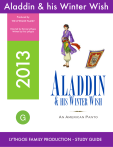 Aladdin & his Winter Wish Produced by THE LYTHGOE FAMILY 2013 Directed by Bonnie Lythgoe Written by Kris Lythgoe ALADDIN & HIS WINTER WISH G 2010 AN AMERICAN PANTO LYTHGOE FAMILY PRODUCTION • STUDY GUIDE ALADDIN STUDY GUIDE 2013 Dear Teachers, Thank you very much for taking your class to see our production of Aladdin and his Winter Wish. We hope that you all enjoy it! We believe that experiencing theater is essential for children to thrive and it is the initiative of teachers like you that enables so many children to see our productions who may not otherwise have this unique opportunity. Our productions fall under the musical theatre genre of American Panto™. This means they are fun, magical and interactive! We expect your students to make a lot of noise as they cheer the hero and boo the baddie. We have provided this study guide to help you bring your theatre experience into the classroom should you have time for special activities before or after your trip. In addition to the activities throughout this guide there is also information on Lythgoe Family Productions and how we are bringing theatre to all students across America. We hope you find our suggestions fun, educational and adaptable. If you would like to suggest any ideas we would love to hear from you and help us deliver it to thousands of students across the country. Thank you again and we look forward to entertaining you at the show. Have a magical day, Lythgoe Family Productions LYTHGOE FAMILY PRODUCTION • STUDY GUIDE ALADDIN STUDY GUIDE 2013 LFP STAGE GUIDE Lythgoe Family Productions create study guides to further enhance students’ theatrical experiences. The study guides contain various discussion questions, projects and activities that encourage students to engage in literary analysis, historical research and personal reflection with parents and/or teachers that will hopefully foster a love and appreciation of musical theatre. G ALADDIN is suitable for all ages A& LADDIN HIS WINTER WISH A A P N MERICAN ANTO ABOUT ALADDIN Aladdin is a middle eastern folk tale and the most famous from the 'Book of One Thousand and One Nights' (Arabian Nights). Aladdin, a street rat discovers a magical lamp for an evil sorcerer. Though Aladdin refuses to give the lamp to the sorcerer he does not know its power. He later discovers that the lamp grants his wishes and with the aide of the genie becomes a powerful prince and marries the Princess. The sorcerer hears of this powerful Prince and returns to take back the lamp. Aladdin defeats the sorcerer and he lives happily ever after with his Princess. LYTHGOE FAMILY PRODUCTION • STUDY GUIDE ALADDIN AND HIS CHRISTMAS WISH ABOUT LFP LYTHGOE FAMILY PRODUCTIONS was formed for the purpose of bringing professional theatre and entertainment to schools and the whole family. The Lythgoe family are well known for creating family entertainment on television including America’s number one show AMERICAN IDOL and SO YOU THINK YOU CAN DANCE. Director, Bonnie Lythgoe is an entertainment industry success story. With a career spanning more than 20 years, Bonnie’s achievements as a dancer, choreographer, TV presenter, TV producer and Broadway producer are second to none. A variety of choreography and directing roles followed including Snow White [London], Seven Brides for Seven Brothers [London], The Best Little Whore House in Texas, The Real Monty, Cinderella, Peter Pan, Aladdin and The Royal Variety for HRH Queen Elizabeth. Kris Lythgoe is the Executive Vice President of Magic Pictures International based in Los Angeles. TV Credits include Executive Producer of Corkscrewed, Fox Reality, Executive Producer Who Are You? for Fox, On The Nose for TVG, Co-coordinating Producer So You Think You Can Dance (USA) for FOX and Consulting Producer for SYTYCD Canada, guiding CTV in establishing the franchise. Theatre Producing credits include CINDERELLA, SNOW WHITE, ALADDIN, FOOTLOOSE West End and THE WEDDING SINGER. For more information please visit www.americanpanto.com TABLE OF CONTENTS ALADDIN: A HISTORY ............................................... 5 BEHIND THE SCENES: A PANTO ............................ 5 ALADDIN PANTO CHARACTERS ............................. 7 ALADDIN PANTO SHOW ...........................................8 PUTTING ON A PANTO ............................................ 9 LEARNING ACTIVITIES BEFORE YOU SEE ALADDIN ................................ 10 AFTER YOU SEE ALADDIN ....................................11 THEATRE IMPROVISATION............ ...................... 12 LYTHGOE FAMILY PRODUCTION • STUDY GUIDE ALADDIN: A HISTORY MOVIE TIMELINE 1709 Aladdin translated to English 1788 John O’Keefe turns Aladdin into a Panto 1959 Animated film produced by UPA. 1979 Musical Aladdin Premieres. 1982 Aladdin and the Wonderful Lamp movie released 1990 Aladdin directed by Mickey Dolenz released as a movie for TV 1992 Animated movie Aladdin is released by Disney. OTHER VERSIONS: OPERA MUSICAL THEATRE FILM TELEVISION ALADDIN - Who Wrote it? No Arabic source has been traced for the tale, which was incorporated into the book Les Mille et Une Nuits by its French translator, Antoine Galland, who heard it from a Syrian storyteller from Aleppo. Galland's diary (March 25, 1709) records that he met the Maronite scholar, by name Youhenna Diab ("Hanna"), who had been brought from Aleppo to Paris by Paul Lucas, a celebrated French traveller. Galland's diary also tells that his translation of "Aladdin" was made in the winter of 1709–10. It was included in his volumes ix and x of the Nights, published in 1710. John Payne, in Aladdin and the Enchanted Lamp and Other Stories, (London 1901), gives details of Galland's encounter with the man he referred to as "Hanna" and the discovery in the Bibliothèque Nationale in Paris of two Arabic manuscripts containing Aladdin (with two more of the "interpolated" tales). One is a jumbled late 18th century Syrian version. The more interesting one, in a manuscript that be