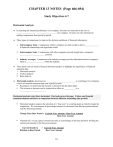 CHAPTER 13 NOTES (Page 666-694) Study Objectives 4-7 Horizontal Analysis In assessing the financial performance of a company, investors are interested in the core or __________________ ___________________ of a company. Investors are also interested in making comparisons from period to period. Three types of comparisons to improve the decision usefulness of financial information: 1. Intracompany basis. Comparisons within a company are often useful to detect ______________ in financial relationships and significant trends 2. Intercompany basis. Comparisons with other companies provide insight into a company's ________________________ position. 3. Industry averages. Comparisons with industry averages provide information about a company's relative _________________ within the industry. Three basic tools are used in financial statement analysis to highlight the significance of financial statement data: 1. Horizontal analysis 2. Vertical analysis 3. Ratio analysis Horizontal analysis, also known as __________ ________________, is a technique for evaluating a series of financial statement data over a period of time. Its purpose is to determine the increase or decrease that has taken place. The increase or decrease can be expressed as either an ___________ or a _________________________. Horizontal analysis is just that--horizontal. One looks across the page. It takes one financial statement element and draws a comparison between different accounting time periods. Horizontal analysis requires the selection of a “base year” or a starting point on which to begin the comparison. We can measure all percentage increases or decreases from this base-period amount with the following formula: Change Since Base Period = Current-Year Amount - Base-Year Amount Base-Year Amount Alternatively, we can express current-year sales as a percentage of the base period by dividing the current-year amount by the base-year amount: Current Results in = Current-Year Amount Relation to Base Period Base-Year Amount 13-1 Current-period sales expressed as a percentage of the base-period for each of the five years, assuming 1997 as the base period is: 2001 $8,853.3 129.62% 2000 $6,954.7 101.82% 1999 $6,984.2 102.26% 1998 $6,762.1 99% 1997 $6,830.1 100% See Page 668 for Kellogg Company illustration The percentages allow us to see the relevance of the increase or decrease. See Page 668 & 669 for an example: A 2-year comparative balance sheet and income statement of Kellogg Company for 2001 and 2000 are given in condensed format. Vertical Analysis Vertical analysis, also called _______________ - __________ analysis, is a technique for evaluating financial statement data that expresses each item in a financial statement as a percent of a base amount. On a balance sheet we might say that current assets are 22% of total assets (total assets being the base amount.) On an income statement we might say that selling expenses are 16% of net sales (net sales being the base amount.) See Page 670 & 671 for a balance sheet and income statement that have been analyzed vertically. (BE 13-5) Interpretation of Ratios Used in Analyzing a Company's Liquidity, Solvency, and Profitability Liquidity ratios The receivables turnover ratio measures liquidity by determining how quickly certain assets can be converted to cash. The ________________ turnover ratio measures the number of times, on average, receivables are collected during the period. The receivables turnover ratio is computed by dividing net credit sales (net sales less cash sales) by average gross receivables during the year. Ratio Receivables turnover ratio Formula Net credit sales Average gross receivables Indicates: Liquidity of receivables The average collection period is a popular variant of the receivables turnover ratio. The average collection period converts the receivables turnover into an average collection period expressed in days. The ratio is computed by dividing the receivables turnover ratio into 365 days. 13-2 The general rule is that the collection period should not greatly exceed the credit term period. Ratio Formula Average 365 days collection Receivable period turnover ratio Indicates: Liquidity of receivables and collection success Analysts frequently use the average collection period to assess the effectiveness of a company’s __________ and ______________ policies. The difference could be due to less aggressive collection practices, but it is more likely due to a difference in credit terms granted. The inventory turnover ratio measures the number of times on average the inventory is ________ during the period. The purpose of this ratio is to measure the liquidity of the inventory. The inventory turnover ratio is computed by dividing the _______ ___ __________ sold by the average inventory during the period. Ratio Inventory turnover ratio Formula: Cost of goods sold Average inventory Indicates: Liquidity of inventory Generally, the faster the inventory turnover the less cash is tied up in inventory and the less the chance of inventory becoming obsolete. A downside of high inventory turnover is that the company can run out of inventory when it is needed. Days in inventory is a variant of the inventory turnover ratio. The days in inventory measures the average number of days it takes to ______ the inventory. It is computed by dividing the inventory turnover ratio into 365 days. Ratio Days in inventory Formula 365 days Inventory turnover ratio Indicates: Liquidity of inventory and inventory management Solvency ratios – measure the ability of the enterprise to survive over a long period of time. Long-term creditors and stockholders are interested in a company's long-run solvency, particularly its ability to pay interest as it comes due and to repay the face value of debt at maturity. The debt to total assets ratio, the times interest earned ratio, and the cash debt coverage ratio provide information abut debt-paying ability. In addition free cash flow provides info