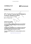 In Commercial Confidence CONSULT21 BRIEFING BT's Testing Proposal for its Obligatory Products migrating to 21CN Issue1: Briefing Number C21–CT-001 Date: 15th February 2006 IMPORTANT NOTE This document is circulated for the purposes of consultation. As such, the contents are subject to change following such consultation. This document is supplied to you in confidence as part of the Consult21 Process. It should not be circulated outside the agreed Consult21 Communications Providers. This document is limited to BT’s existing obligatory product portfolio. Copyright © British Telecommunications plc 2006 Contents 1 INTRODUCTION ................................................................................................................... 4 1.1 Overview .................................................................................................................... 4 1.2 Basis of Sharing BT’s Testing Proposal ................................................................ 4 1.2.1 Information Disclosure ................................................................................. 4 2 INDUSTRY CONSULTATION .............................................................................................. 4 2.1 BT’s Testing Proposal & its Objectives .................................................................. 5 2.2 What Are We Consulting On? .................................................................................. 5 2.2.1 Pre-Consultation .......................................................................................... 6 2.2.2 Consultation ................................................................................................. 7 2.2.3 Testing Execution ........................................................................................ 8 2.3 Consultation Process ............................................................................................... 8 2.4 Consultation Timings ............................................................................................... 9 2.5 Management of Consultation .................................................................................. 9 2.6 Query Handling during Pre-Consultation ............................................................. 10 3 21CN TESTING PROPOSAL FOR OBLIGATORY PRODUCTS ...................................... 10 3.1 Overview .................................................................................................................. 10 3.2 Core Tests ............................................................................................................... 10 3.2.1 Product Test Purposes .............................................................................. 11 3.2.2 ADS Compatibility Testing ......................................................................... 12 3.2.3 Transfer Engineering & Migrations Testing ............................................... 13 3.3 CPE Compatibility Testing ..................................................................................... 13 3.4 Inter-operability Testing ......................................................................................... 14 3.5 Voice Trials .............................................................................................................. 14 3.6 BT’s Test Life Cycle ................................................................................................ 14 3.7 The Common Test Activity..................................................................................... 16 3.8 Proposed Communication Provider Access ........................................................ 18 3.9 Retest and Regression ........................................................................................... 18 4 UK STANDARDS AND NICC ............................................................................................. 18 5 GLOSSARY OF TERMS..................................................................................................... 19 6 ANNEX A – RESPONSE FORM ......................................................................................... 20 7 ANNEX B – REPRESENTATIVE LIST OF CPE................................................................. 21 7.1 Analogue Corded (PSTN) ....................................................................................... 21 7.2 Analogue Cordless (PSTN) .................................................................................... 23 7.3 DECT Cordless (PSTN) ........................................................................................... 25 7.4 Payphones (PSTN) .................................................................................................. 28 7.5 Payphones (ISDN2e) ............................................................................................... 30 7.6 Payphones (ADSL) .................................................................................................. 30 7.7 Telephone Answer Machines (TAM) (PSTN) ........................................................ 30 7.8 Telephone Answer & Record Machines (TARM) (PSTN) ..................................... 31 7.9 Caller Display (PSTN) ............................................................................................. 31 7.10 Data Modems (PSTN).............................................................................................. 32 7.11 PSTN PBX ................................................................................................................ 33 7.12 Facsimile Machines (PSTN) ................................................................................... 36 7.13 ISDN2e Miscellaneous CPE .................................................................................. 39 7.14 ISDN30e PBX .......................................................................................................... 40 Author: BT Issue: 1.0 © British Telecommunications plc 200 Page 2 of 43 In Com
