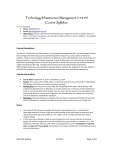 Technology Infrastructure Management (14.954) Course Syllabus Dr. Laurie Keating Phone: (508)369-1151 Email: lekeating@comcast.net Office Hours: Virtual. I will check email frequently on a daily basis and try to answer within 24 hours. I do travel on business so am not able to check as often as I like. In addition, i am available most evenings from 7 – 9 p.m. Course Description: This course is designed to provide teachers, instructional technology specialists, and technology directors with strategies for maintaining and troubleshooting their computers by using a series of hands-on activities. Topics include computer hardware and software, system administration tools, networking, and network security, in support of cloud computing. A series of discussions are held about the issues facing educational technology leaders as they strive to provide a robust infrastructure and sufficient devices to support teaching and learning. Through extensive discussion and project-based assignments, differentiated experiences are provided to meet the diverse needs of the students in this class. Students continue the development of an electronic portfolio to document their field-based experiences. Course Information: Course Dates: September 3, 2014 – December 17, 2014 Format: This course will be 100% online in a primarily asynchronous format with 2-3 Blackboard Collaborate chats held on mutually convenient evenings. Meeting Days: For the purpose of tracking, the “beginning of the week” will be Fridays, with assignments generally due on Mondays so that the student has a minimum of two weekends to work on each assignment (often longer). Over the years, this has proven to be amenable to the most people because lectures and assignments are available over the weekend for those who only have weekends available for classwork. Discussion: Active participation is required. Course content is developed through the discussion board. Participation is expected throughout the discussion period, not just on a single visit. Notes: 1. 2. The intent of this course is to prepare the teacher, technology director, or instructional technology specialist to have a high level understanding of the technology infrastructure and related issues that face school districts. This is not a course in hardware technician skills or network design. In this class, every attempt is made to accommodate the fact that you [we] are all working people. For written assignments, you will usually have at least 10 days to complete it (i.e., two weekends). That said, however, this is NOT a correspondence course. Participation is required and is a major part of your grade. All students must make a commitment to participate in online chats and discussions. INST 954 Keating 9/1/2014 Page 1 of 8 Course Objectives This course addresses the NETS Standards for Technology Leaders and Facilitators in the areas of: TL – Technology Operations and Concepts Educational technology leaders demonstrate an advanced understanding of technology operations and concepts. TL-V – Productivity and Professional Practice Educational technology leaders design, develop, evaluate and model products created using technology resources to improve and enhance their productivity and professional practice. TL-VI – Social, Ethical, Legal, and Human Issues Educational technology leaders understand the social, ethical, legal, and human issues surrounding the use of technology in PK-12 schools and develop programs facilitating application of that understanding in practice throughout their district/region/state. TL-VII – Procedures, Policies, Planning, and Budgeting for Technology Environments Educational technology leaders coordinate development and direct implementation of technology infrastructure procedures, policies, plans, and budgets for PK-12 schools. TL-VIII – Leadership and Vision Educational technology leaders will facilitate development of a shared vision for comprehensive integration of technology and foster an environment and culture conducive to the realization of the vision. In addition, by the end of the course, participants will be able to: Knowledgeably describe the specifications and configuration of a computer system and the domain on which it is located. Using correct terminology, describe system problems and identify logical troubleshooting procedures and possible solutions. Describe how resources are shared over a network and the access issues that arise related to them. Use online help to obtain information about procedures and problem-solving. Effectively describe more difficult problems, providing accurate, helpful information. Discuss issues related to cloud computing. Plan and manage the procurement of technology devices or services. Content: (Note: See Course Calendar for dates.) MODULE 1: Knowing Your Hardware In this module we identify your computer's specifications, configuration, and peripheral devices as well as a review of handheld devices that can be used educationally. In addition, we examine operating systems, drivers, and the files that enable the parts of the computer to work together as a system. We also discuss system utilities and startup files. MODULE 2: Networking In this module we look at the world beyond the local PC, but within your building -- the network. We look at shared resources, including applications, drives, printers, and scanners as well as the access issues that arise in using these resources. MODULE 3: Internetworking and Internet Security The Internet is a vast, powerful, global network that offers a wealth of opportunity or a source of INST 954 Keating 9/1/2014 Page 2 of 8 frustration. We will examine the Internet in relationship to your system, including getting connected, staying connected, searching, plug-ins, downloading, and error messages. In this module we also discuss special topics related to internet security and network management. MODULE 4: Cloud Computing As web-based applications and productivity tool