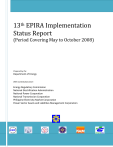 13th EPIRA Implementation Status Report (Period Covering May to October 2008) Prepared by the Department of Energy With Contributions from Energy Regulatory Commission National Electrification Administration National Power Corporation National Transmission Corporation Philippine Electricity Market Corporation Power Sector Assets and Liabilities Management Corporation 13th Status Report on EPIRA Implementation Contents I. II. INTRODUCTION ........................................................................................................ 4 DEVELOPMENTS IN THE PRIVATIZATION EFFORT ......................................... 4 A. Privatization of Generating Assets ....................................................................................... 4 1. Amlan............................................................................................................................ 4 2. Panay-Bohol ................................................................................................................. 5 3. Tiwi-Makban Geothermal Power Plant Package........................................................ 5 4. Calaca ........................................................................................................................... 5 5. Ambuklao-Binga .......................................................................................................... 6 B. Updated Sale Sequence of NPC’s Assets............................................................................. 6 1. Limay Block A & B Combined Cycle Power Plant. ....................................................... 7 2. Power Barges 117 and 118. ......................................................................................... 7 3. Iligan Diesel Power Plants. .......................................................................................... 7 C. Privatization of Decommissioned Power Plants .................................................................. 8 D. Transfer of the Contracted Energy Outputs of NPC-IPPs to IPP Administrators................ 8 E. Privatization of Transco Assets............................................................................................ 9 1. 25-Year Transco Concession........................................................................................ 9 2. Sale of Sub-Transmission Assets ................................................................................ 10 F. Privatization of SPUG Areas.............................................................................................. 11 G. Management of Liabilities and Transfer of Assets ............................................................ 13 III. ELECTRICITY RATES ............................................................................................. 15 A. Unbundling of Electricity Rates ......................................................................................... 15 B. Administration of Universal Charge (UC) ......................................................................... 16 C. Assumption of Loans of Electric Cooperatives.................................................................. 17 D. System Loss Cap ................................................................................................................ 20 E. Electricity Rate Adjustments.............................................................................................. 20 F. Transition Supply Contracts............................................................................................... 21 G. Lifeline Rate Subsidy Program .......................................................................................... 22 H. Initiatives to Address Issues on Rates ................................................................................ 22 IV. COMPETITION ......................................................................................................... 23 A. Wholesale Electricity Spot Market (WESM) Implementation........................................... 23 1. Highlights of Luzon Commercial Operations ............................................................ 23 2. Visayas Trial Operations............................................................................................ 25 3. WESM-Related ERC Regulatory Filings..................................................................... 25 4. Encouraging Electric Cooperatives’ Participation in the WESM ............................. 28 5. Governance of the WESM.......................................................................................... 28 B. Open Access and Retail Competition................................................................................. 32 1. Preparation for Open Access and Retail Competition .............................................. 32 2. Open Access in the Economic Zones .......................................................................... 34 3. Petition for Interim Open Access ............................................................................... 34 C. Market Power Monitoring .................................................................................................. 37 V. ENERGY SUPPLY SECURITY AND RELIABILITY ............................................ 37 A. Supply and Demand Situation............................................................................................ 37 B. Transmission Development................................................................................................ 39 VI. TOTAL ELECTRIFICATION ................................................................................... 40 May to October 2008 2 13th Status Report on EPIRA Implementation A. Implementation Strategies .................................................................................................. 41 1. Public Sector Contribution......................................................................................... 41 2. Private Sector Pa