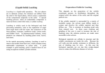 (Liquid-Solid) Leaching Preparation of Solids for Leaching Leaching is a liquid-solid operation. The two phases are in intimate contact, the solute(s) can diffuse from the solid to the liquid phase, which causes a separation of the components originally in the solid. A special leaching process, when an undesirable component is removed from a solid with water, is called washing. This depends on the proportion of the soluble constituent present, its distribution throughout the original solid, the nature of the solid, and the original particle size. Leaching is widely used in the biological and food processing industries, such as the separation of sugar from sugar beets with hot water, the extraction of oils from peanuts, soybeans, sunflower seeds, cotton seeds, and halibut livers. In pharmaceutical industry, many products are obtained by leaching plant roots, leaves, and stems. If the soluble material is surrounded by a matrix of insoluble matter, the solvent must diffuse inside to contact and dissolve the soluble material and then diffuse out. This is common in leaching metal salts from mineral ores. In these cases crushing and grinding of the ores is used to increase the rate of leaching since the solution portions are made more accessible to the solvent. In the metals processing industry, leaching is used to remove the metals from their ores, which contains many undesirable constituents, as solute salts. A good example is gold leaching, gold is leached from its ore using an aqueous sodium cyanide solution. Biological materials are cellular in structure and the soluble constituents are inside the cells. Because the cell walls provide another resistance to diffusion, the rate of leaching may be slow. In this case the biological materials are cut into thin wedge-shaped slices to reduce the diffusion distance of solvent. 124 125 Rates of Leaching Generally there are five rate steps in the leaching process: 1. The solvent is transferred from the bulk solution to the surface of the solid. 2. The solvent penetrates or diffuses into the solid (intraparticle diffusion). 3. The solute dissolves from the solid into the solvent. 4. The solute diffuses through the mixture to the surface of the solid (intraparticle diffusion). 5. The solute is transferred to the bulk solution. Step 1 is usually fast. The controlling rate process is generally the intraparticle diffusion or the dissolving step. For the intraparticle diffusion, we will study in more detail in the subject of “Advanced Separation Processes”. 126 Dissolving is the controlling process (Batch System) According to Fick’s law, the rate of mass transfer of the solute A being dissolved to the solution of volume V is: N A k L A c AS c A where NA is kg mol of A dissolving to the solution/s, A 2 is the surface area of particles in m , kL is a masstransfer coefficient in m/s, cAS is the saturation solubility of the solid solute A in the solution in kg mol/ 3 m , and cA is the concentration of A in the solution at 3 time t sec in kg mol/ m . By a material balance, the rate of accumulation of A in the solution is equal to the dissolving flux: Vdc A N A k L A c AS c A dt Integrating from t = 0 and cA = cA0 to t = t and cA = cA, dc A k A c L tt 0 dt c AA0 c AS c A V c AS c A k A exp L t V c AS c A0 The solution approaches a exponentially. 127 saturated condition Equilibrium Relationship in Leaching Equilibrium diagrams for leaching In leaching it is assumed that there is sufficient solvent present so that all the solute in the entering solid can be dissolved into the liquid, equilibrium is reached when the solute is dissolved. Hence, all the solute is completely dissolved in the first stage. Since we have three components: solute (A), inert or leached solid (B), and solvent (C), a rectangular diagram is used to show the equilibrium data. It is also assumed that the solid is insoluble, and no adsorption will happen for the solute in the solid, meaning that the solution in the liquid phase leaving a stage is the same as the solution remaining with the solid matrix in the settled slurry leaving the same stage. The settled solid leaving a stage always contains some liquid. This solid-liquid stream is called the underflow or slurry stream. The liquid is called the overflow stream. The concentration of oil or solute in the overflow stream is equal to that in the liquid solution accompanying the slurry or underflow stream. Hence, o on an xy plot the equilibrium line is on the 45 line. The concentration of inert or insoluble solid B in the solution mixture or the slurry mixture is defined as kg B kg solid N kg A + kg C kg solution For the overflow, N = 0, for the underflow, N depends on the solute concentration in the liquid. The compositions of solute A in the liquid as weight fractions are kg A kg solute xA (overflow liquid) kg A + kg C kg solution kg A kg solute (liquid in slurry) yA kg A + kg C kg solution For the entering solid feed to be leached, N is kg inert solid/kg solute A and yA = 1.0. For pure entering solvent N = 0 and xA = 0. Countercurrent leaching: A, launder; B, rake; C, pump. 128 129 Single-Stage Leaching The following figure shows a single-stage leaching process where V is kg/h of overflow solution with composition xA and L is the kg/h of liquid in the slurry solution with composition yA based on a given flow rate B kg/h of dry solute-free solid. Several typical equilibrium diagrams: (a) case for vertical tie lines and yA = xA, (b) case where yA ≠ xA for tie lines. By doing material balances, we have Total solution (A+C): L 0 V2 L1 V1 M (A): L 0 y A 0 V2 x A 2 L1y A1 V1x A1 Mx AM (B): B L 0 N 0 0 L1N1 0 MN M A balance on C is not needed since xA + xC = 1 and yA + yC = 1 where M is the total flow rate in kg (A+C)/h, xAM and NM are the coordinates of this point M. If L0 entering is the fresh solid feed to be leached with no solvent C present, it would be located above the N versus y line in the above figure. 130 131 Example L1: Single-