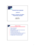 1 Programming Languages: Lecture 2 Chapter 2: Evolution of the Major Programming Languages Jinwoo Kim jwkim@jjay.cuny.edu 2 Chapter 2 Topics History of Computers Zuse’s Plankalkul Minimal Hardware Programming: Pseudocodes The IBM 704 and Fortran Functional Programming: LISP The First Step Toward Sophistication: ALGOL 60 Computerizing Business Records: COBOL The Beginnings of Timesharing: BASIC 1 3 Chapter 2 Topics (continued) Everything for Everybody: PL/I Two Early Dynamic Languages: APL and SNOBOL The Beginnings of Data Abstraction: SIMULA 67 Orthogonal Design: ALGOL 68 Some Early Descendants of the ALGOLs Programming Based on Logic: Prolog History's Largest Design Effort: Ada 4 Chapter 2 Topics (continued) Object-Oriented Programming: Smalltalk Combining Imperative ad Object-Oriented Features: C++ An Imperative-Based Object-Oriented Language: Java Scripting Languages: JavaScript, PHP, Python, and Ruby A C-Based Language for the New Millennium: C# Markup/Programming Hybrid Languages 2 5 History of Computers Who invented computers? – Contribution from many inventors – A computer is a complex piece of machinery made up of many parts, each of which can be considered a separate invention. In 1936, Konrad Zuse made a mechanical calculator using three basic elements: a control, a memory, and a calculator for the arithmetic and called it Z1, the first binary computer – First freely programmable computer – Konrad Zuse wrote the first algorithmic programming language called 'Plankalkül' in 1946, which he used to program his computers – He wrote the world's first chess-playing program using Plankalkül Konrad Zuse's Z1 Circa 1938 6 History of Computers (Continued) Professor John Atanasoff and his graduate student Clifford Berry built the world's first electronic-digital computer at Iowa State University between 1939 and 1942 – ABC computer – Several innovations in computing, including a binary system of arithmetic, parallel processing, and a separation of memory and computing functions In 1946, John Mauchly and J Presper Eckert developed the ENIAC I (Electrical Numerical Integrator And Calculator) – By support from U.S. military – Considered as first modern computer – The ENIAC contained 17,468 vacuum tubes, along with 70,000 resistors, 10,000 capacitors, 1,500 relays, 6,000 manual switches and 5 million soldered joints – It covered 1800 square feet (167 square meters) of floor space, weighed 30 tons, consumed 160 kilowatts of electrical power 3 7 History of Computers (Continued) In 1951, John Presper Eckert & John W. Mauchly built first commercial computer called “UNIVAC” – By doing the research for their customer, United States Census Bureau – The Bureau needed a new computer to deal with the exploding U.S. population (the beginning of the famous baby boom) – Able to pick presidential winners (Eisenhower vs. Stevenson) In 1953, IBM enters into “The History of Computers” with IBM 701 EDPM Computer – In 1954, the first successful high level programming language, Fortran, was developed by John Backus & IBM In 1958, The Integrated Circuit, otherwise known as “The Chip”, was developed by Jack Kilby & Robert Noyce 8 History of Computers (Continued) In 1964, IBM unveiled first “mainframe computer” with the System/360 – Cost to develop: $5 billion ($30 billion in today's dollars) – But the gamble paid off: company's revenue jumped from $3.2 billion the year it was introduced to $7.5 billion in 1970 – Major breakthrough in the technology and business worlds – Allowed companies to perform multiple tasks at the same time on a single machine – Before then, a user would have to schedule time on the company computer to do a specific task, whether to process payroll or analyze business expenses – Dominated computing industry until PC revolution in the 1980s In 1969, “ARPAnet”, the origin of the Internet, was constructed – Packet-switching development – ARPA introduces network for defense and develops e-mail and US universities join network in 1970 In 1971, Faggin, Hoff & Mazor made “Intel 4004 Computer Microprocessor” – The first microprocessor 4 9 History of Computers (Continued) In 1981, IBM introduced “IBM PC - Home Computer” and Microsoft revealed its “MS-DOS” Operating System In 1983, The first home computer with a GUI, graphical user interface, was developed by Apple In 1985, Microsoft begins the friendly war with Apple with its launch of Microsoft Windows operating system By the early 1990s, sales of mainframes, then IBM's main product, were dropping dramatically in the face of stiff competition from rivals such as Sun Microsystems – Also, instead of big boxes in the back room, companies turned to servers that connected PCs in a network – People predicted it will extinct in decades 10 History of Computers (Continued) In 1991, “Mosaic”, the first properly developed webbrowser, takes Internet by storm We live in the age of “embedded computer” world now – Downshift of “center of gravity of computing” – But at the same time, IBM sells record number of mainframe computers – IBM sold $4.2 billion worth of mainframes in 2003, up 6 percent from the previous year So, we have a history of computers about 60 years! 5 11 Genealogy of Common Languages 12 Zuse’s Plankalkül Never implemented Advanced data structures – floating point, arrays, records 6 13 Plankalkül Syntax An assignment statement to assign the expression A[4] + 1 to A[5] | A + 1 => A V | 4 5 S | 1.n 1.n (subscripts) (data types) 14 Minimal Hardware Programming: Pseudocodes What was wrong with using machine code? – – – – Poor readability Poor modifiability Expression coding was tedious Machine deficiencies--no indexing or floating point 7 15 Pseudocodes: Short Code Short Code developed by Mauchly in 1949 for BINAC computers – Expressions were coded, left to right – Example of operations: 01 02 03 04 – ) = / 06 07 08 09 abs value