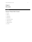 Guide to Operating Systems 4th edition Chapter 4 File Systems At a Glance Instructor’s Manual Table of Contents Overview Objectives Teaching Tips Quick Quizzes Class Discussion Topics Additional Projects Additional Resources Key Terms 4-1 Guide to Operating Systems 4th edition 4-2 Lecture Notes Overview Chapter 4 explores file systems across the Windows, UNIX / Linux, and Mac OS X operating systems in order to give students a more in depth understanding of how files are stored. Several legacy file systems are detailed, as well as the current generation of file systems available on each platform. Objectives List the basic functions common to all file systems Explain the file systems used by Windows XP, Windows Server 2003, Windows Vista, Windows Server 2008, and Windows 7 (FAT16, FAT32, FAT64, and NTFS) Discuss the file systems used by UNIX and Linux systems, including ufs and ext Explain the Mac OS X Extended (HFS+) file system including new features added in Mac OS X version 10.6 Snow Leopard Teaching Tips Understanding File System Functions 1. Explain to students the concept of a file system and discuss how file systems keep and store data. 2. Summarize the process by which data is stored, describing the hierarchy file systems typically use; directories, subdirectories, files. 3. Give details on what kind of information is stored along with the files, such as creation date, modification date, or file attributes. 4. Show how the file system is navigated visually, using Explorer on Windows, Nautilus on Linux with GNOME, or Finder on OS X. Designing a Directory Structure 1. Discuss with students how file system paths are displayed or referenced in various operating systems, such as C:\ for the root on Windows, or / for the root on Linux. 2. Describe how students should set up and organize a file system. 3. Detail some of the default folders present on each operating system designed to organize files either belonging to the user or the operating system. Examples: a. /bin (Linux) b. C:\Users (Windows Vista / 7) c. C:\Documents and Settings (Windows XP) d. Users (Mac OS X) Guide to Operating Systems 4th edition 4-3 Disk Storage Basics 1. Show students how a hard disk stores information on tracks, and how each track is divided into sections by sectors. Students should understand about low-level formatting (which is usually only performed at a factory). Block Allocation 1. 2. 3. 4. Explain the use of block allocation to keep track of the location of files. Students should understand the logical separation of the disk into clusters. Describe how tracks that line up on each platter are called cylinders. Detail the two different techniques for storing block allocation data. Use FAT32 and NTFS as examples of the two different techniques, and then describe these two file systems. 5. Discuss what file metadata is, give examples of what metadata might include. In the case of images, you could say that some images store geo-location information as metadata. Partitions 1. Lay out the steps for partitioning a drive in preparation for creating a file system. Define what a high-level format is, and explain how it differs from a low-level format performed by a factory. 2. Discuss what a physical drive is and what a logical drive is, and how they compare. 3. Note the limitation on the number of partitions for a drive. 4. Describe the partition table / disk label, and how it keeps track of partitions on the disk. 5. Define Master Boot Record (MBR) and describe its contents (Using Windows as an example): a. Boot program b. Disk signature c. Partition table d. End of MBR marker 6. List some of the tools typically used to partition hard disks on all operating systems. a. fdisk (old Windows; Linux; Unix) b. Disk Management (Windows XP – 7) Formatting 1. Describe the formatting process, and list utilities used to format: a. Format b. Disk Management 2. Show where the boot block is placed (first sector of the disk). 3. Define what a bad cluster is, and discuss how it is marked off (in FAT). 4. Explain to students how the FAT file system stores and organizes data. Discuss the status bits and what each indicates: a. Volume b. Directory c. System Guide to Operating Systems 4th edition 4-4 d. Hidden e. Read-only f. Archive Windows File Systems FAT16 and Extended FAT16 1. Discuss the FAT16 file system. Students should know what the limitations of FAT16 are, and how filenames are displayed / used. They should be aware of the 8.3 filename limitation, and the long filename solution. Size limitations of partitions using FAT16 should also be mentioned. FAT32 1. Discuss the improvements made with FAT32, and compare limitations to FAT16. 2. Give options for converting to/from FAT32 on Windows operating systems, using the convert utility. FAT64 1. Briefly describe what FAT64 is, and where it is used. NTFS 1. Introduce the NTFS file system and describe some of its defining features, such as the use of a Master File Table (MFT). 2. Describe how file creation works on the NTFS file system, and how hard linking behaves. 3. The security and auditing features of the NTFS file system should be discussed, since security and auditing was un-available with FAT. NTFS’s built-in file compression should also be mentioned. 4. Detail how NTFS uses journaling to keep a log of file system activity to aid in data recovery should a vital data transaction be interrupted by power failure. 5. Students should be aware of what the Portable Operating System Interface for Unix (POSIX) is, and why NTFS supported it. Basic and Dynamic Disks 1. Explain the difference between basic and dynamic disks, and the advantages of using one over the other. NTFS File System and Disk Utilities 1. View the chkdsk.exe utility and explain its purpose to students. Describe how its role changes with the addition of self-healing NTFS. 2. Detail some common options to be used with chkdsk.exe, and teach students how to read the output from the program. Guide to Operati