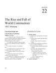 C HAP TER 22 The Rise and Fall of World Communism 1917–Present CHAPTER OVERVIEW CHAPTER OUTLINE CHAPTER LEARNING OBJECTIVES I. • To examine the nature of the Russian and Chinese revolutions and how the differences between those revolutions affected the introduction of communist regimes in those countries • To consider how communist states developed, especially in the USSR and the People’s Republic of China • To consider the benefits of a communist state • To consider the harm caused by the two great communist states of the twentieth century • To introduce students to the cold war and its major issues • To explore the reasons why communism collapsed in the USSR and China • To consider how we might assess the communist experience . . . and to inquire if historians should be asking such questions about moral judgment 512 Opening Vignette A. The Berlin Wall was breached on November 9, 1989. 1. built in 1961 to seal off East Berlin from West Berlin 2. became a major symbol of communist tyranny B. Communism had originally been greeted by many as a promise of liberation. 1. communist regimes had transformed their societies 2. provided a major political/ideological threat to the Western world a. the cold war (1946–1991) b. scramble for influence in the third world between the United States and the USSR c. massive nuclear arms race 3. and then it collapsed II. Global Communism C HAPTER 22 • T HE R ISE AND F ALL OF W ORLD C OMMUNISM A. Communism had its roots in nineteenthcentury socialism, inspired by Karl Marx. 1. most European socialists came to believe that they could achieve their goals through the democratic process 2. those who defined themselves as “communists” in the twentieth century advocated revolution 3. “communism” in Marxist theory is the final stage of historical development, with full development of social equality and collective living B. At communism’s height in the 1970s, almost one-third of the world’s population was governed by communist regimes. 1. the most important communist societies by far were the USSR and China 2. communism also came to Eastern Europe, North Korea, Vietnam, Laos, Cambodia, Cuba, Afghanistan 3. none of these countries had the industrial capitalism that Marx thought necessary for a socialist revolution 4. communist parties took root in many other areas C. The various expressions of communism shared common ground 1. a common ideology, based on Marxism 2. inspiration of the 1917 Russian Revolution 3. during the cold war, the Warsaw Pact created a military alliance of Eastern European states and the USSR a. Council on Mutual Economic Assistance tied Eastern European economies to the USSR’s b. Treaty of Friendship between the USSR and China (1950) 4. but relations between communist countries were also marked by rivalry and hostility, sometimes war III. Comparing Revolutions as a Path to Communism A. Communist revolutions drew on the mystique of the French Revolution. 513 1. got rid of landed aristocracies and the old ruling classes 2. involved peasant upheavals in the countryside; educated leadership in the cities 3. French, Russian, and Chinese revolutions all looked to a modernizing future, eschewed any nostalgia for the past 4. but there were important differences: a. communist revolutions were made by highly organized parties guided by a Marxist ideology b. the middle classes were among the victims of communist upheavals, whereas middle classes were chief beneficiaries of French Revolution B. Russia: Revolution in a Single Year 1. Russia’s revolution (1917) was sudden, explosive a. Tsar Nicholas II was forced to abdicate the throne in February 1917 b. massive social upheaval 2. deep-seated social revolution soon showed the inadequacy of the Provisional Government a. it would not/could not meet the demands of the revolutionary masses b. refused to withdraw from WWI c. left opening for the rise of more radical groups d. most effective opposition group was the Bolsheviks, led by Vladimir Ulyanov (Lenin) 3. Bolsheviks seized power in a coup (October 1917) a. claimed to act on behalf of the “soviets” b. three-year civil war followed: Bolsheviks vs. a variety of enemies c. by 1921, Bolsheviks (now calling their party “communist”) had won 4. during the civil war, the Bolsheviks: a. regimented the economy b. suppressed nationalist rebellions c. committed atrocities (as did their enemies) 514 C HAPTER 22 • T HE R ISE AND F ALL OF W ORLD C OMMUNISM d. integrated many lower-class men into the Red Army and into local governments e. claimed to defend Russia from imperialists as well as from internal exploiters f. strengthened their tendency toward authoritarianism 5. for 25 years, the new USSR was the only communist country a. expansion into Eastern Europe thanks to Soviet occupation at the end of WWII b. Stalin sought a buffer of “friendly” governments in Eastern Europe; imposed communism from outside C. China: A Prolonged Revolutionary Struggle 1. communism won in China in 1949, after a long struggle a. the Chinese imperial system had collapsed in 1911 b. the Chinese Communist Party (CCP) was not founded until 1921 2. over the next 28 years, the CCP grew immensely and transformed its strategy under Mao Zedong 3. had a formidable enemy in the Guomindang (Nationalist Party), which ruled China after 1928 a. Chiang Kai-shek led the Guomindang b. the Guomindang promoted modern development, at least in cities c. the countryside remained impoverished 4. the CCP was driven from the cities, developed a new strategy a. looked to the peasants for support, not city workers b. only gradually won respect and support of peasants c. given a boost by Japan’s invasion of China 5. the CCP addressed both foreign imperialism and peasant exploitation a. expressed Chinese nationalism and demand for social change b. gained a reputation for honesty, unlike the Guomindang IV. Building Socialism in Two Countries A. Joseph Stalin built a s